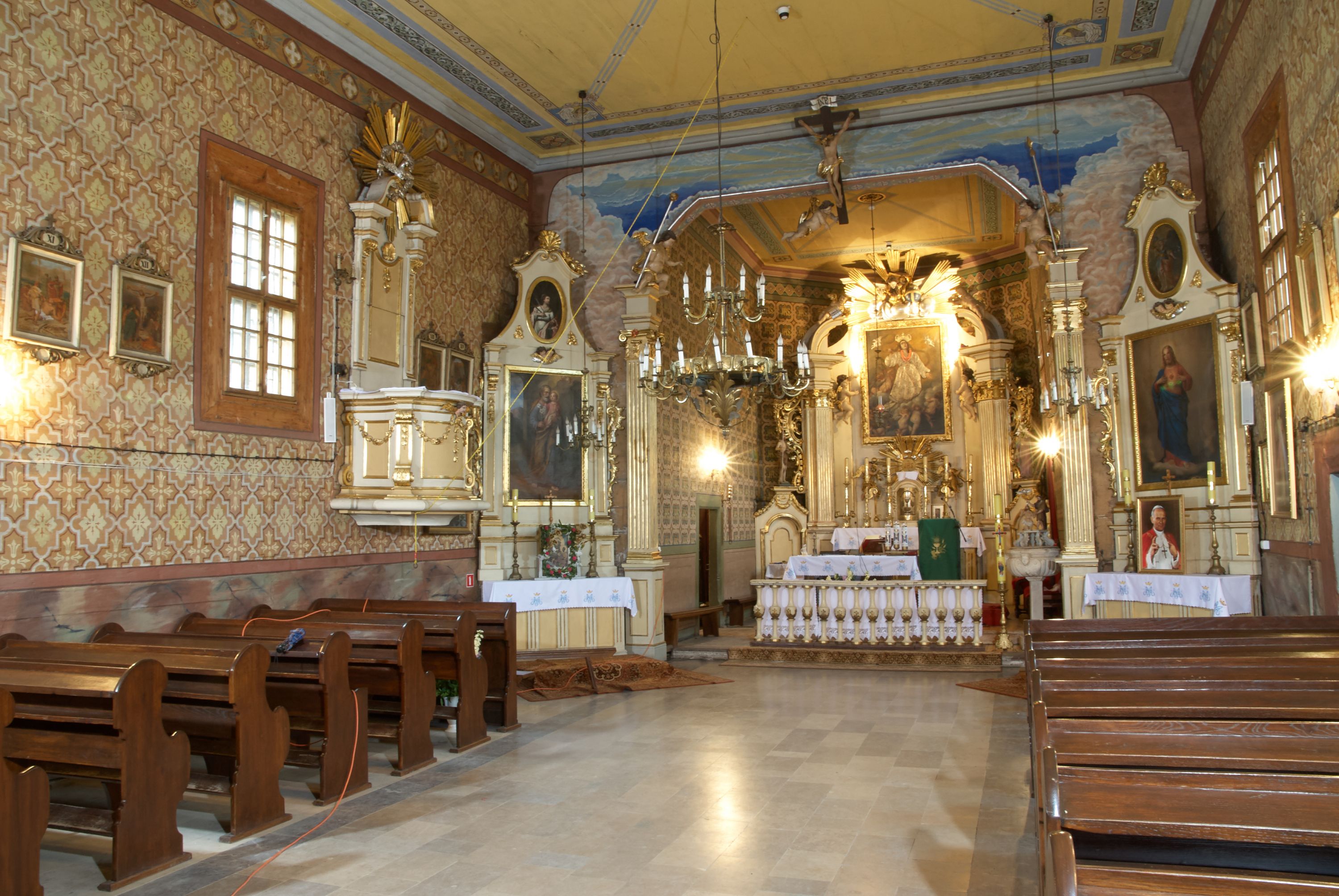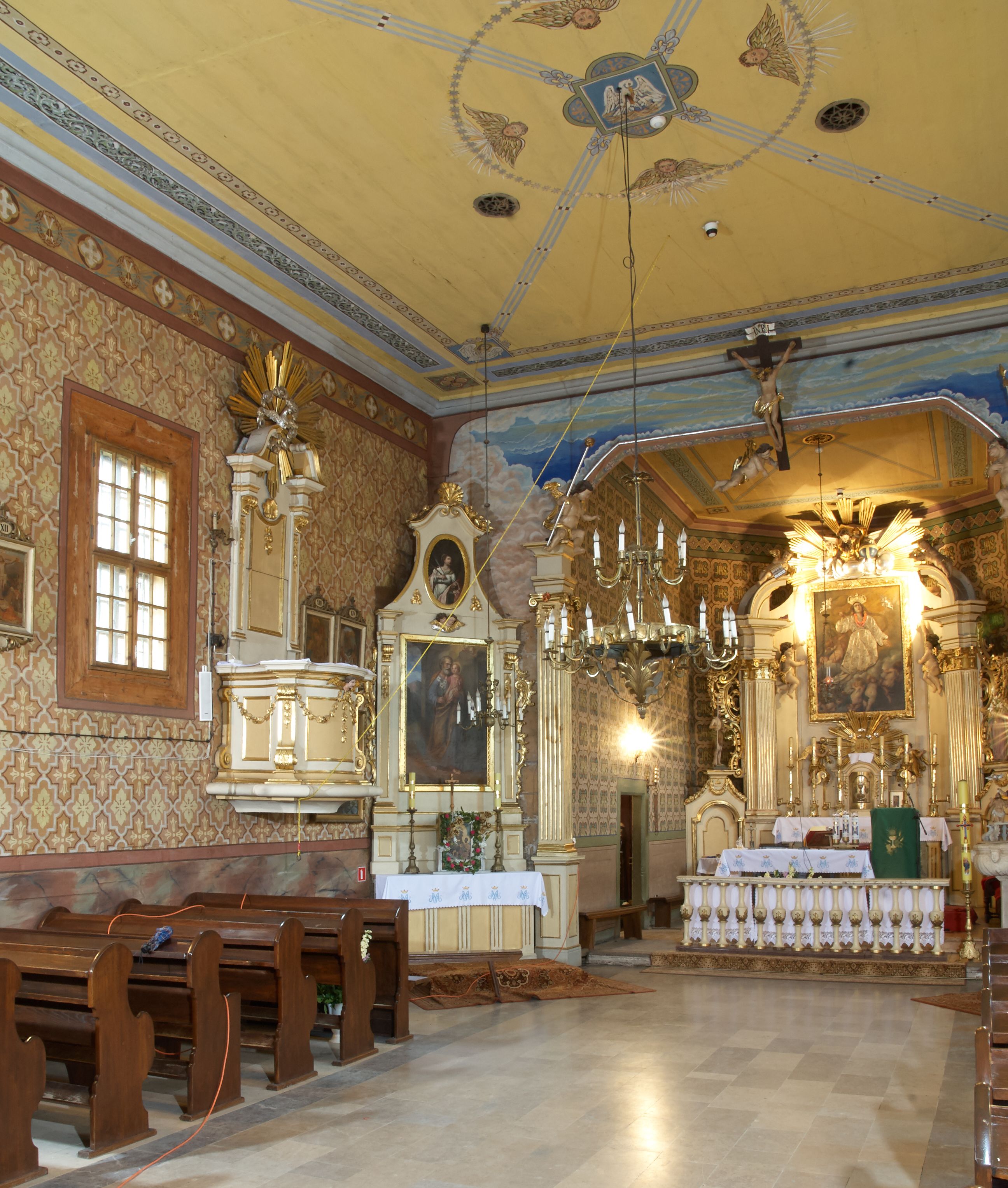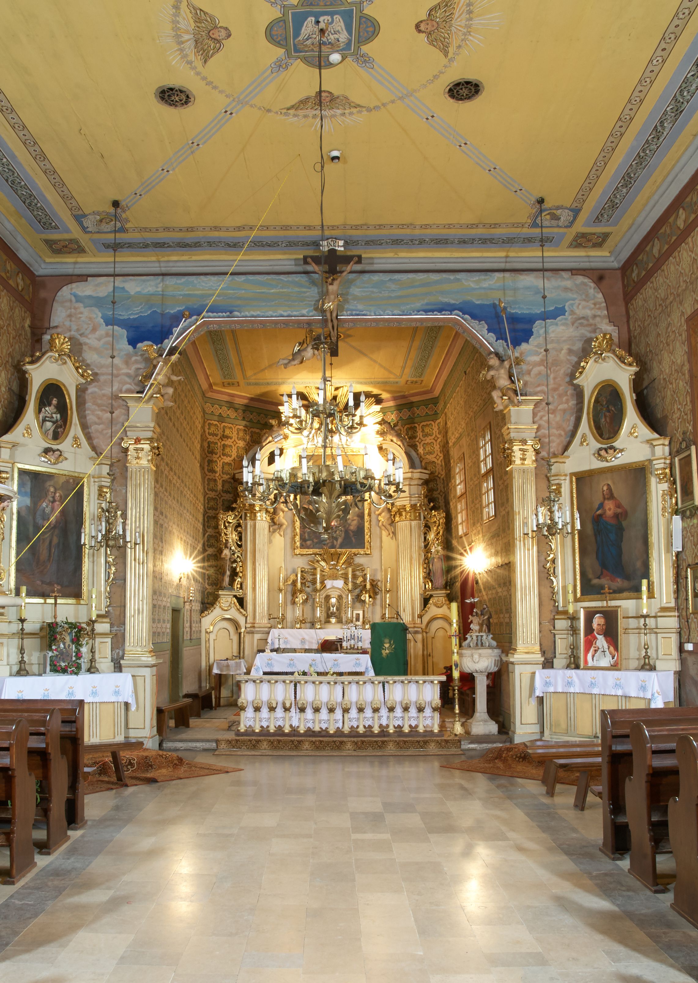 Kościół orientowany, drewniany, konstrukcji zrębowej, z wieżą na słup od zachodu, wejście główne od zachodu; wejścia boczne od południa przez kruchtę i od północy przez zakrystię. Prezbiterium zamknięte wielobocznie, nawa na rzucie prostokąta. Przy prezbiterium i nawie od północy zakrystia z przedsionkiem, przy nawie od południa kruchta. Wewnątrz stropy, podkreślone profilowanym gzymsem. Łuk tęczowy o wykroju prostokątnym ze ściętymi narożami, flankowany filarkami z belkowaniem; na nim późnobarokowy krucyfiks podtrzymywany przez aniołka, ponad belkowaniem aniołki dzierżące narzędzia Męki Pańskiej. Drugi łuk tęczowy usytuowany na granicy przedłużenia naw o podobnym wykroju. Chór muzyczny wsparty na dwóch żłobkowanych słupach o falistym przebiegu. Ściany nawy przeprute: od północy oknem o kształcie prostokąta, od południa trzema analogicznymi oknami i zwieńczone profilowanym gzymsem. Obramienia okienne fazowane, z nadokiennikami o wykroju w ośli grzbiet. Drzwi prowadzące do kruchty w kształcie prostokąta. Prezbiterium wzniesione o jeden stopień powyżej poziomu nawy, od południa przeprute dwoma prostokątnymi oknami. Od północy drzwi do zakrystii o kształcie stojącego prostokąta, od strony zakrystii profilowane. Zakrystia na planie prostokąta, przylegająca od północy do prezbiterium kościoła. Nawa i kruchta kryte dachem dwuspadowym, prezbiterium trójpołaciowym, opadającym ku wschodowi, zakrystia dachem pulpitowym. Przy wschodnim krańcu dachu nawy znajduje się wieżyczka na sygnaturkę. Dzwonnica drewniana, dwukondygnacyjna na planie zbliżonym do kwadratu. Nad pierwszą kondygnacją dach okapowy, a nad drugą czterospadowy, zwieńczony kulą z krzyżem. Na fasadzie kruchty wnęka z rzeźbą Matki Boskiej z Dzieciątkiem.