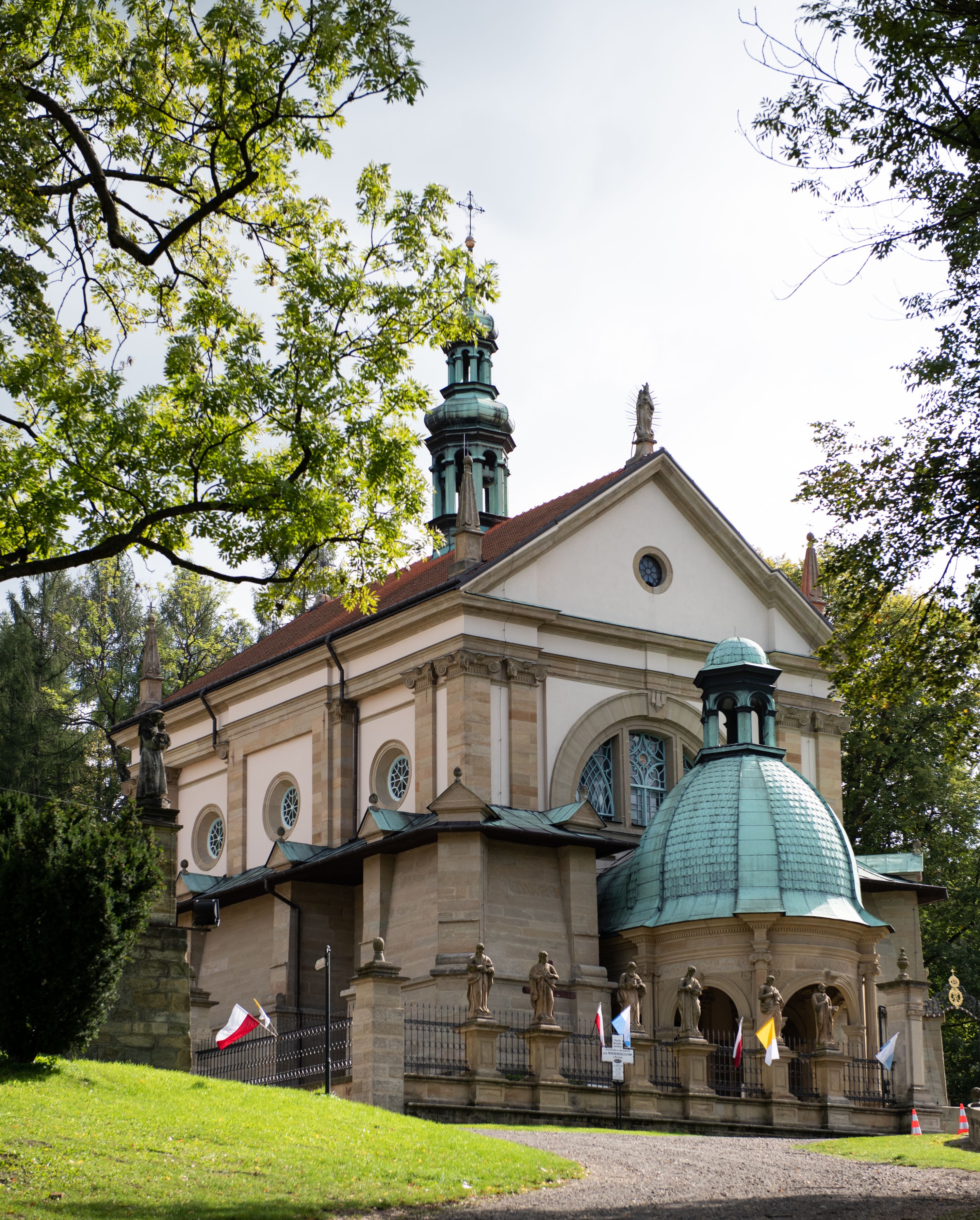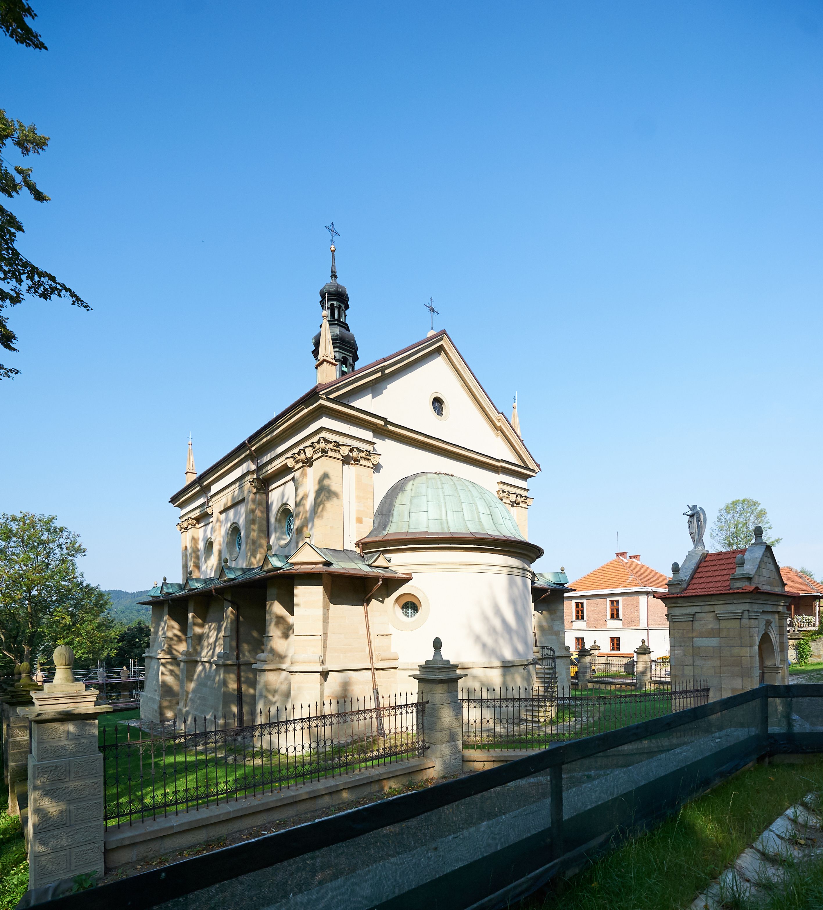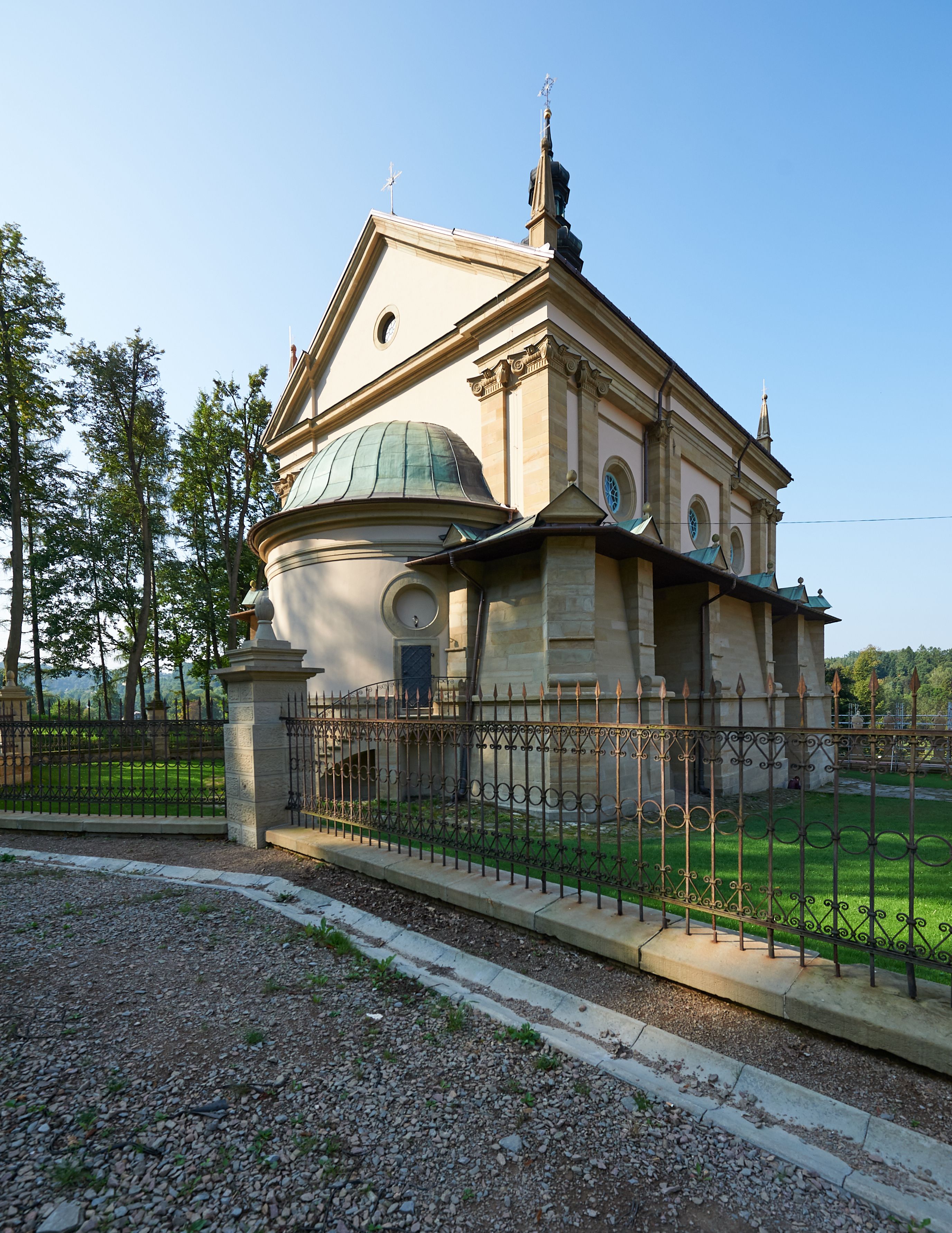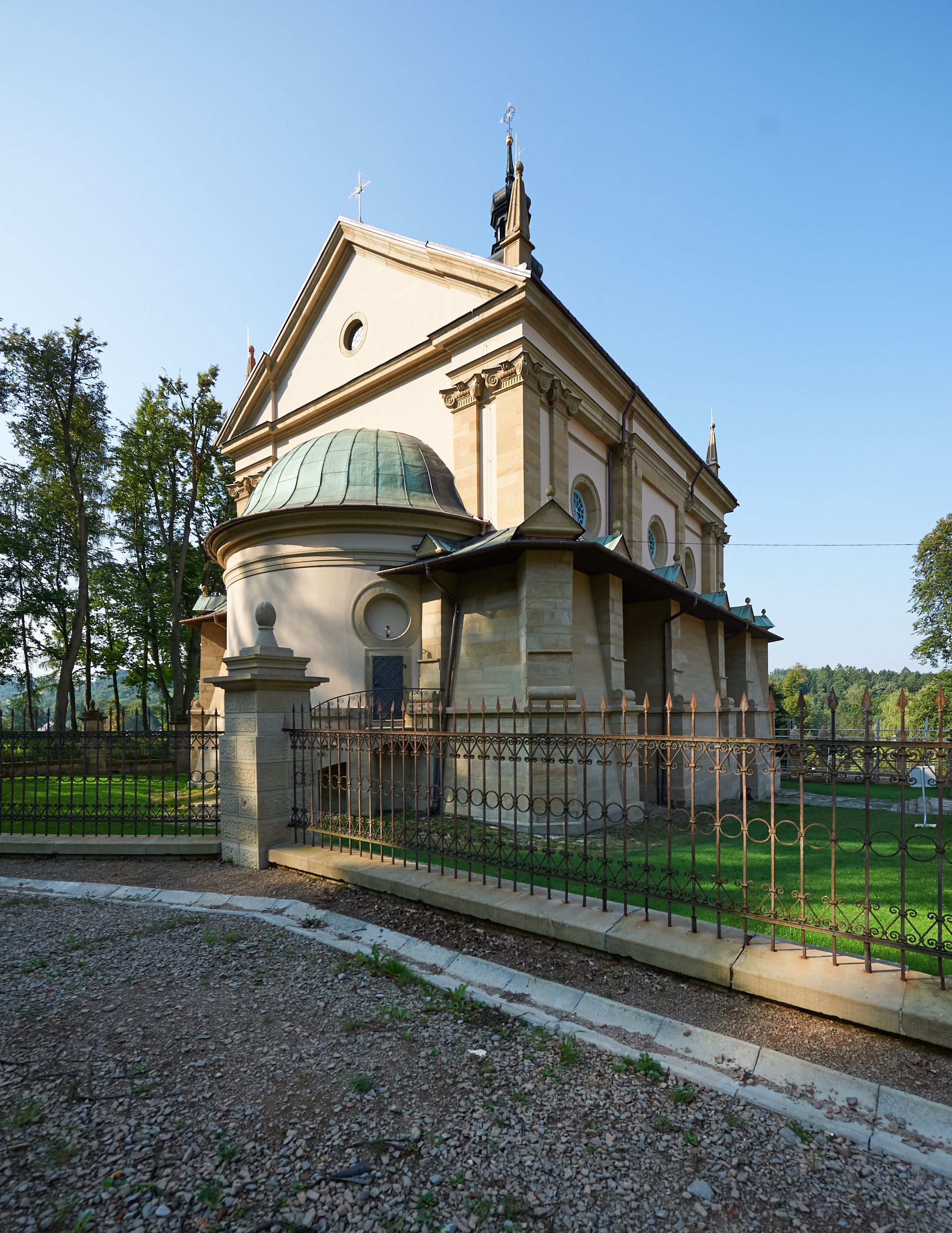 Kościół należy do zespołu dróżek Matki Boskiej, położnych w obrębie klasztoru w Kalwarii Zebrzydowskiej. Świątynia jest położna w centrum wsi, na wschód od głównej drogi, na placu otoczonym kamiennym murem z żeliwnym płotem, który od frontu ozdobiony jest figurami 12 apostołów, umieszczonymi na wysokich cokołach. Główne wejście na plac prowadzi przez bramę od zachodu, flankowaną dwoma filarami, na których ustawione są klasycystyczne wazony. Drugie wejście usytuowane jest od wschodu przez murowaną bramę, nakrytą daszkiem dwuspadowym, na którym ustawiona jest figura grającego na trąbie anioła. Trzecie wejście znajduje się od północy.