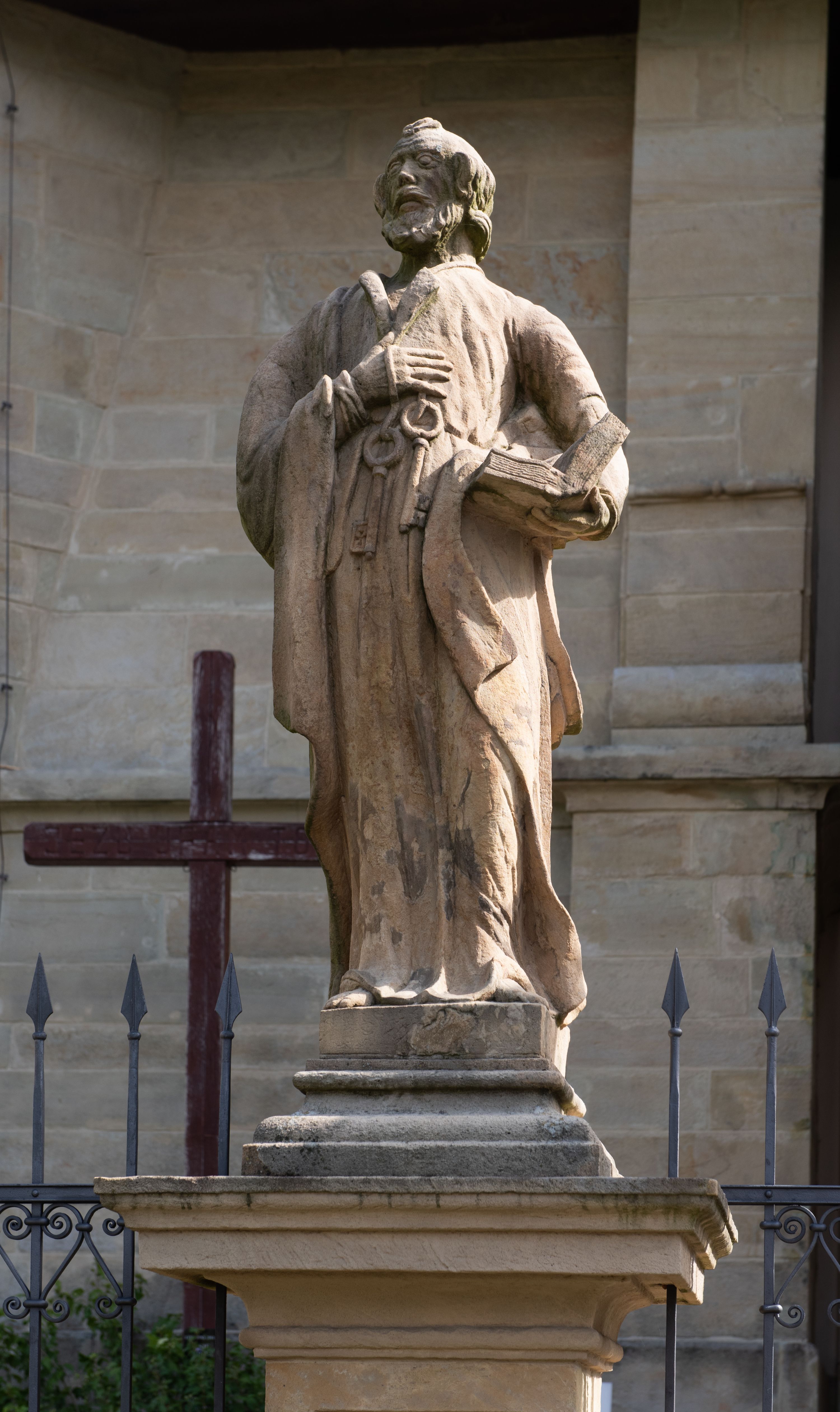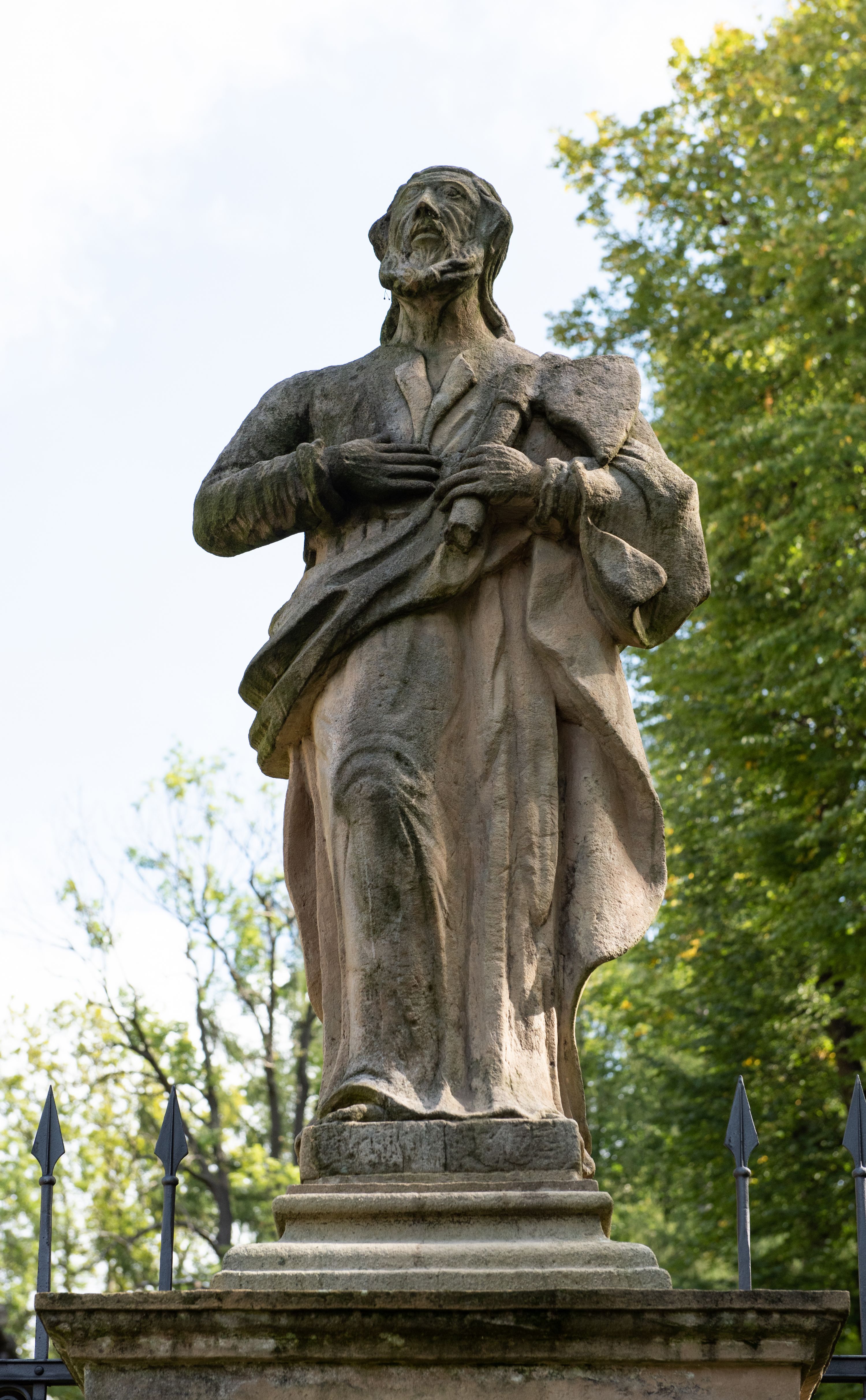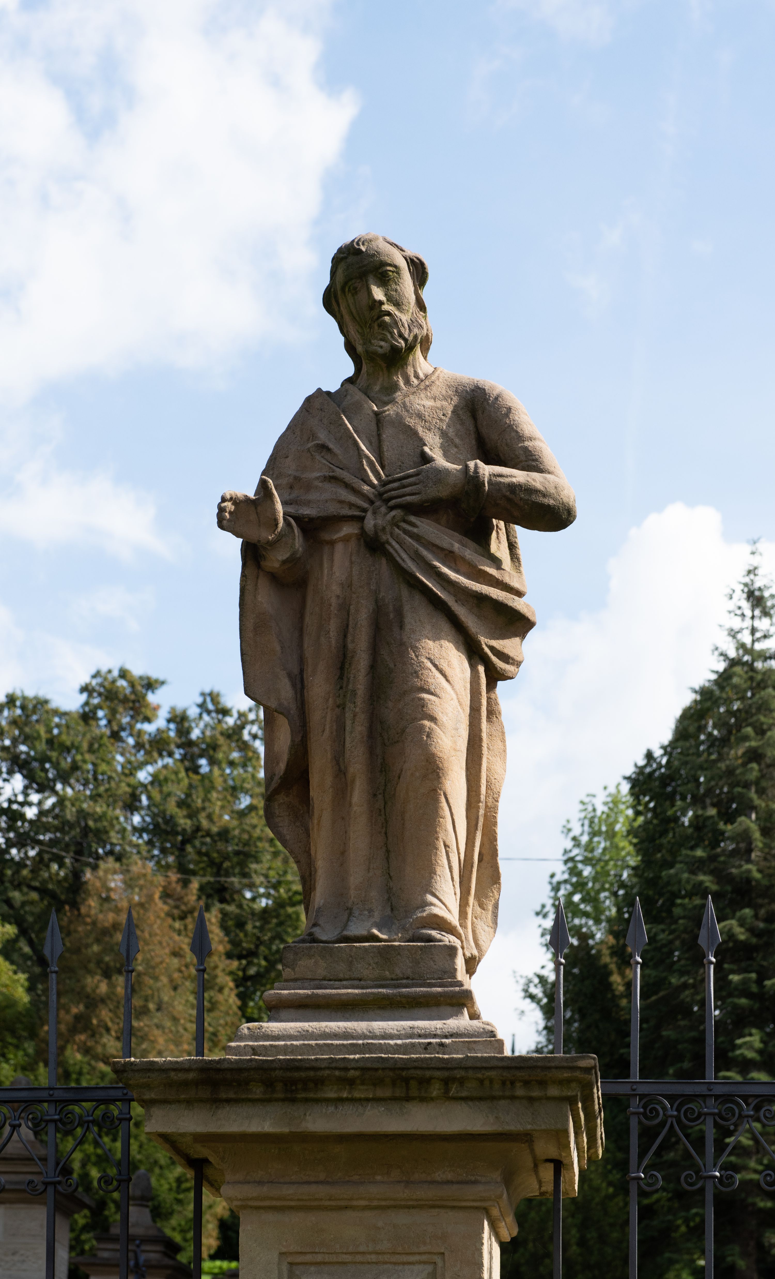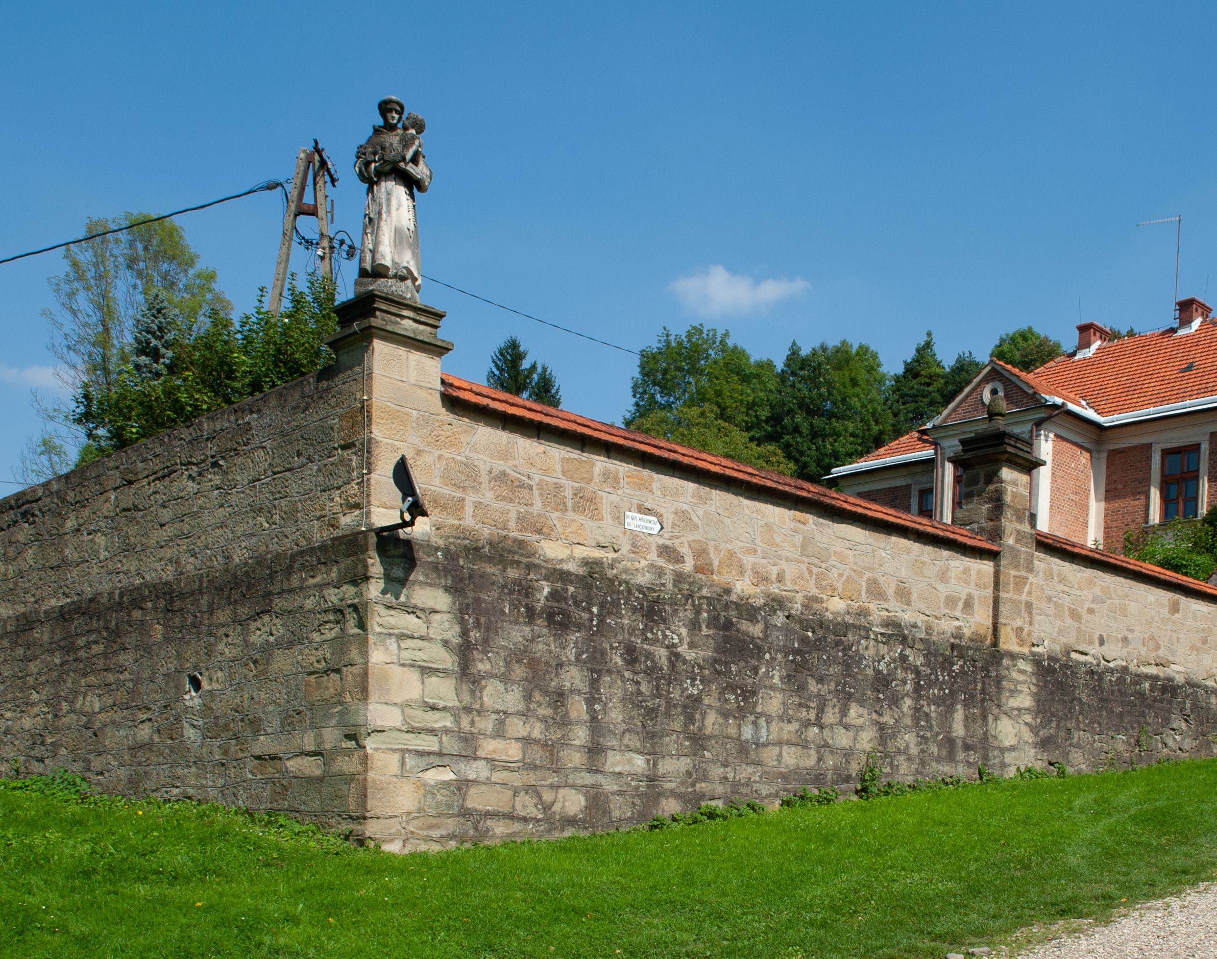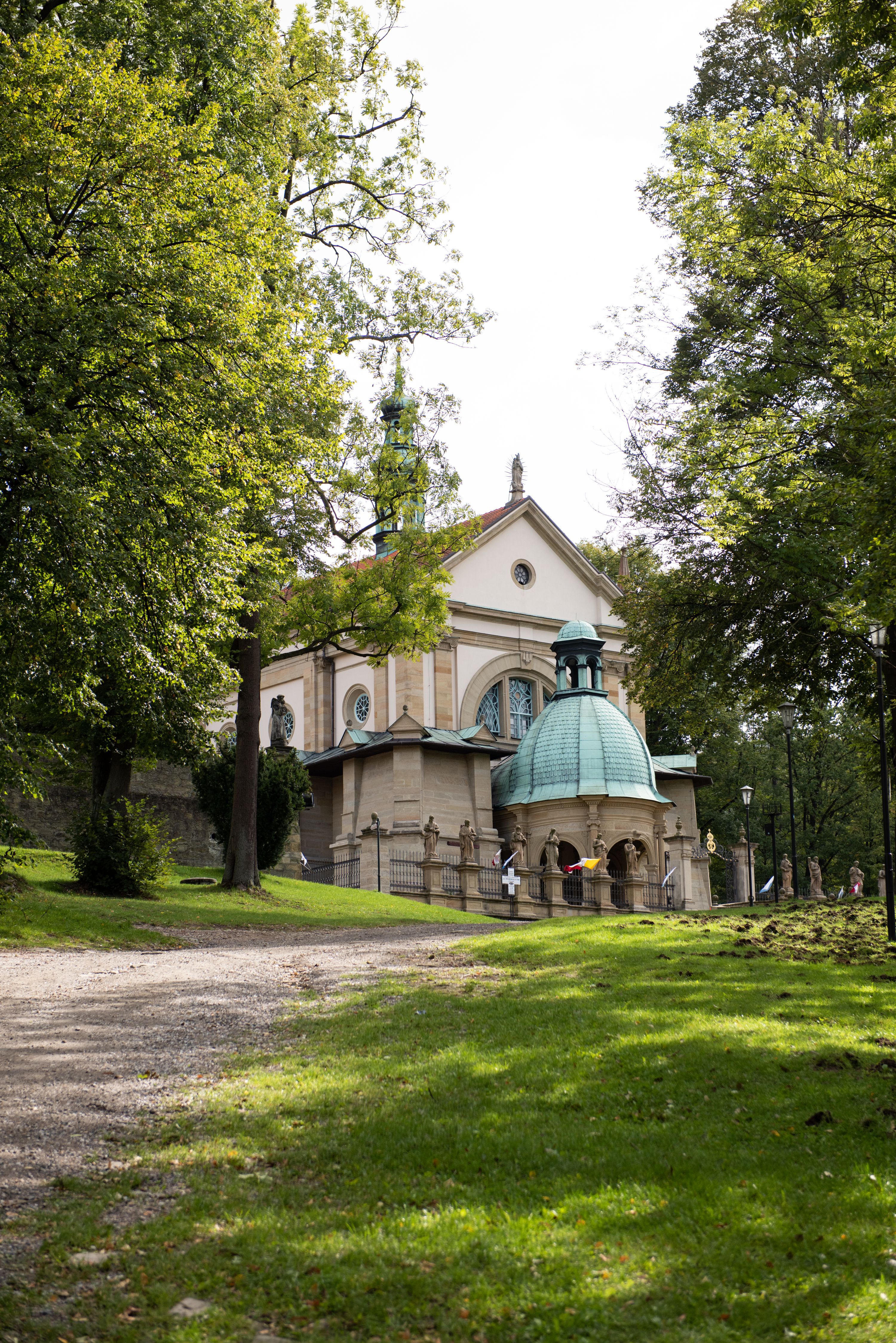 Kościół należy do zespołu dróżek Matki Boskiej, położnych w obrębie klasztoru w Kalwarii Zebrzydowskiej. Świątynia jest położna w centrum wsi, na wschód od głównej drogi, na placu otoczonym kamiennym murem z żeliwnym płotem, który od frontu ozdobiony jest figurami 12 apostołów, umieszczonymi na wysokich cokołach. Główne wejście na plac prowadzi przez bramę od zachodu, flankowaną dwoma filarami, na których ustawione są klasycystyczne wazony. Drugie wejście usytuowane jest od wschodu przez murowaną bramę, nakrytą daszkiem dwuspadowym, na którym ustawiona jest figura grającego na trąbie anioła. Trzecie wejście znajduje się od północy.