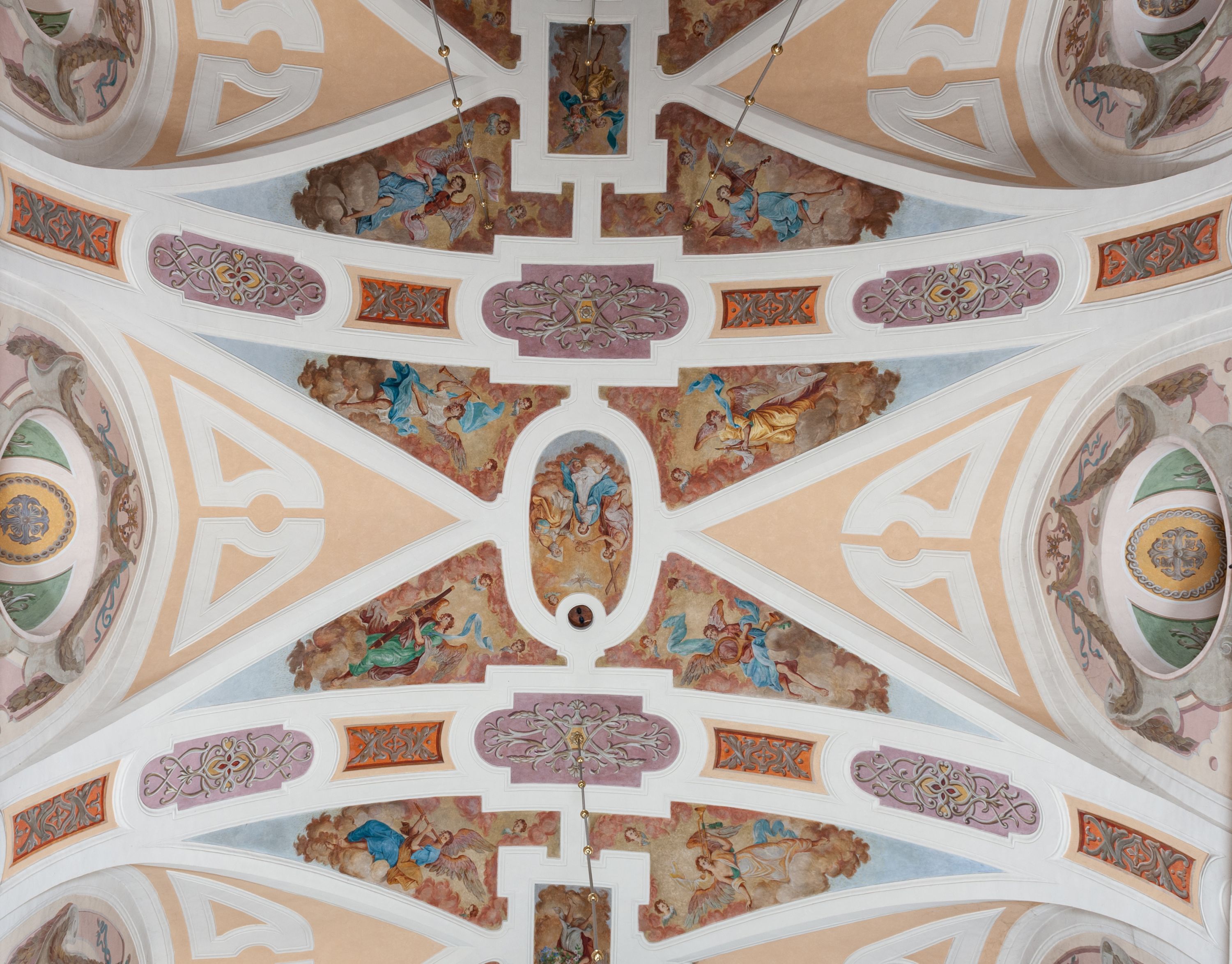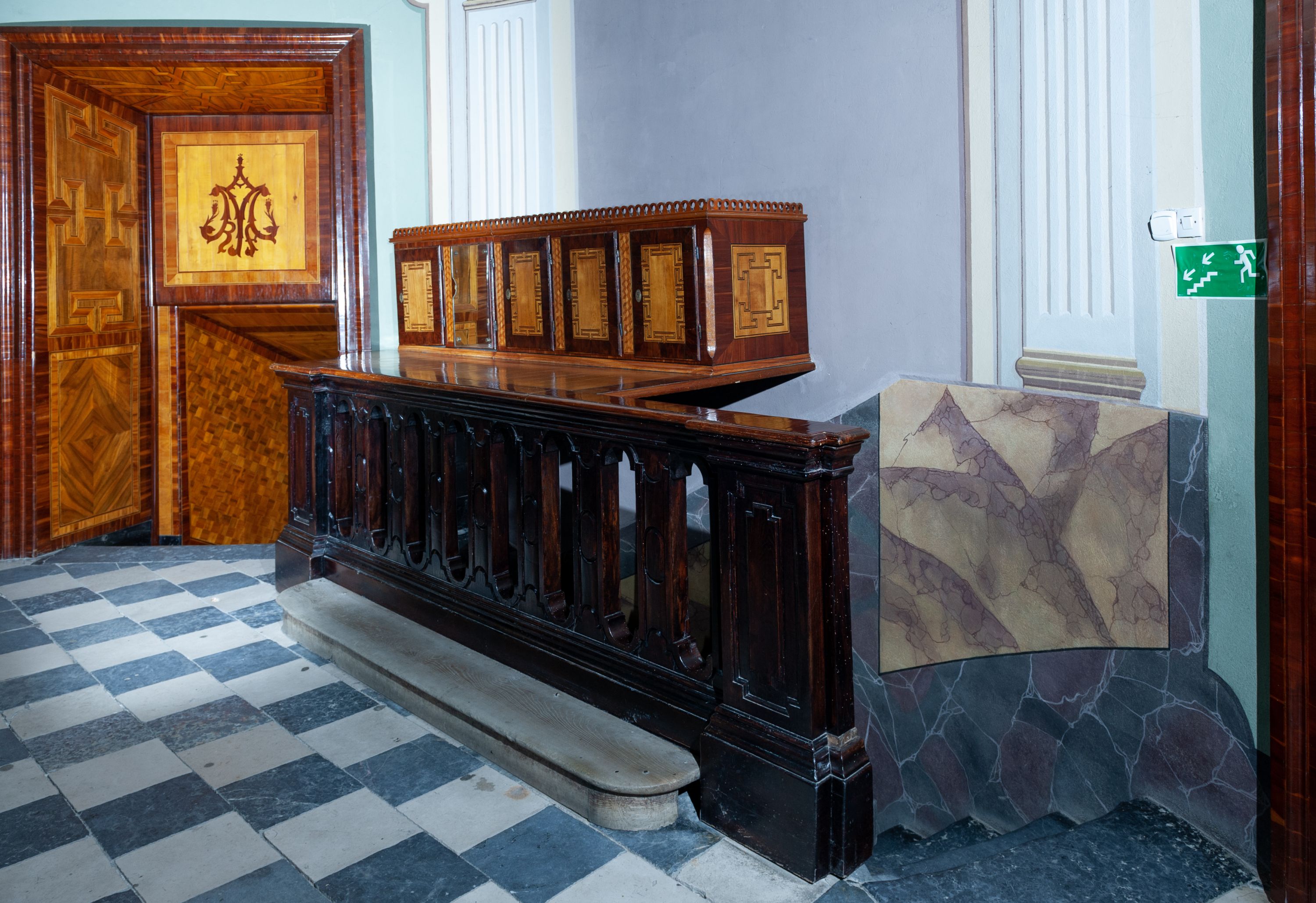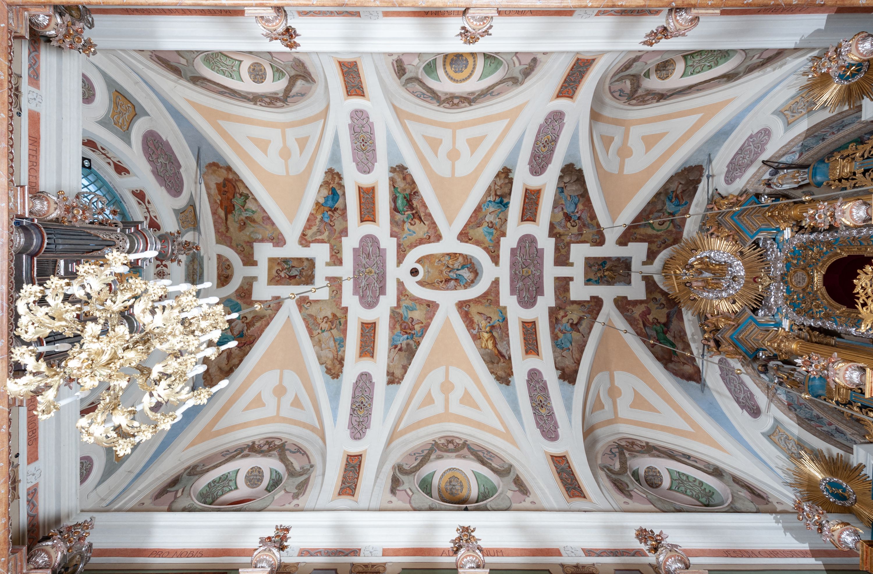 Kościół jest budowlą orientowaną, założoną na planie prostokąta, jednonawową, zamkniętą półkolistą absydą. Od zachodu przylega kruchta na planie prostokąta, zamkniętego z jednej strony półkoliście. Wewnątrz kościół dwupiętrowy. Na parterze część wschodnia świątyni podniesiona jest o siedem stopni, oddzielona od nawy trzema półkolistymi arkadami, wspartymi na czterech filarach i ustawionymi przed nimi półkolumnami, które wspierają pełne belkowanie, wyłamane na osiach. W przyłuczach płskorzeźbione główki aniołków. Na fryzie złocony napis: „EIA ADVOCATA NOSTRA OCVLOS MISERICORDES AD NOS CONVERTE ET IESVM BENEDICTV FRCTVM NOBIS OSTENDE”. Za środkową arkadą usytuowana jest niewielka, najstarsza część świątyni – Grób Matki Boskiej, na rzucie prostokąta, sklepiony krzyżowo. W ścianach bocznych nawy są półkoliście zamknięte wnęki na ołtarze. Od zachodu chór muzyczny wsparty jest na trzech arkadach filarowych. Wnętrze obiega drewniany ganek wsparty na metalowych wspornikach, a w części wschodniej i zachodniej na trzech murowanych arkadach. Podniebienie ganku zdobione jest geometrycznym stiukiem. W części nawowej świątyni znajduje się sklepienie kolebkowe z lunetami, w apsydzie hemisferyczne. Wnętrze doświetlone jest sześcioma małymi, okrągłymi oknami znajdującymi się na piętrze od strony północnej i południowej.