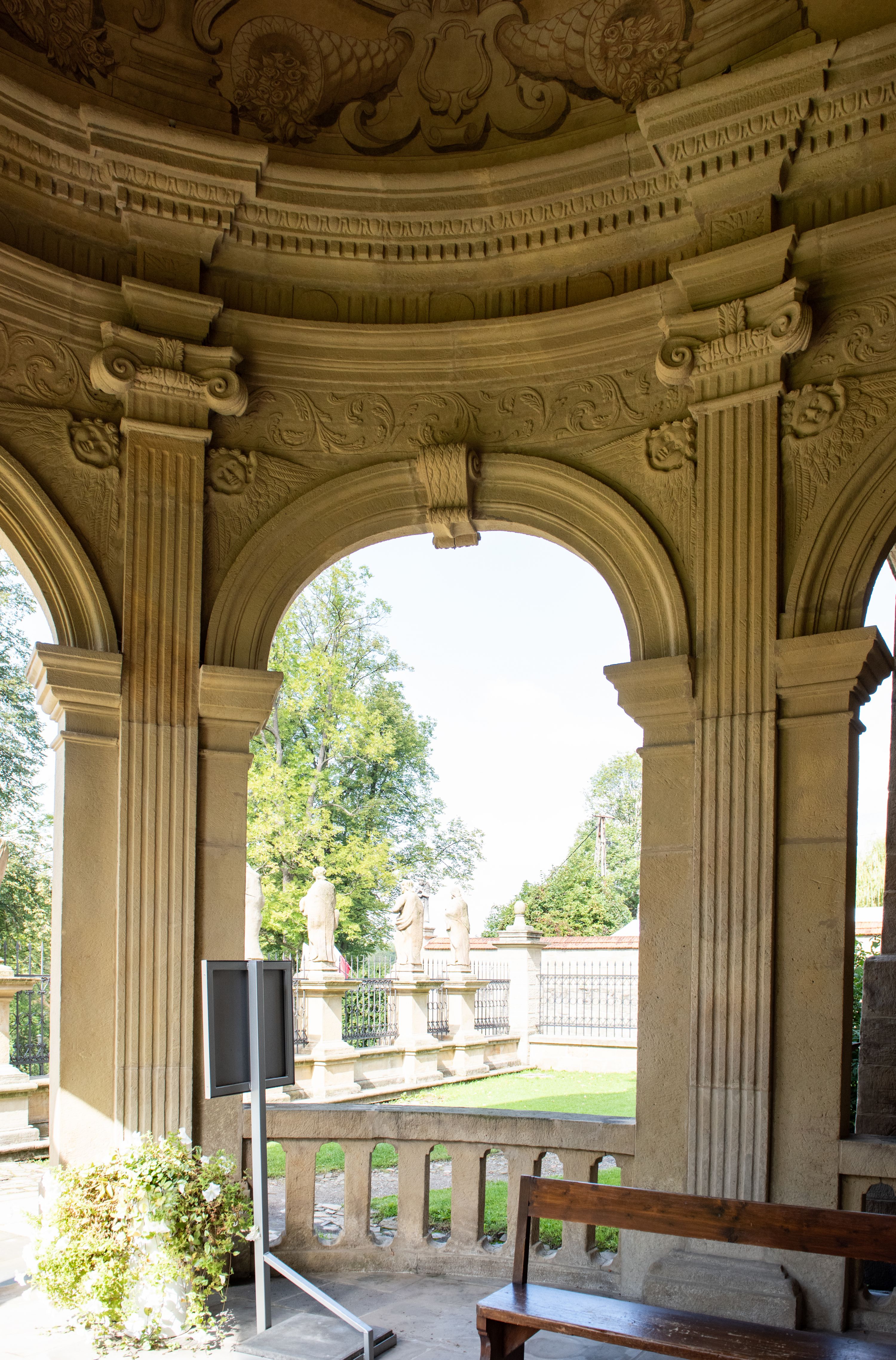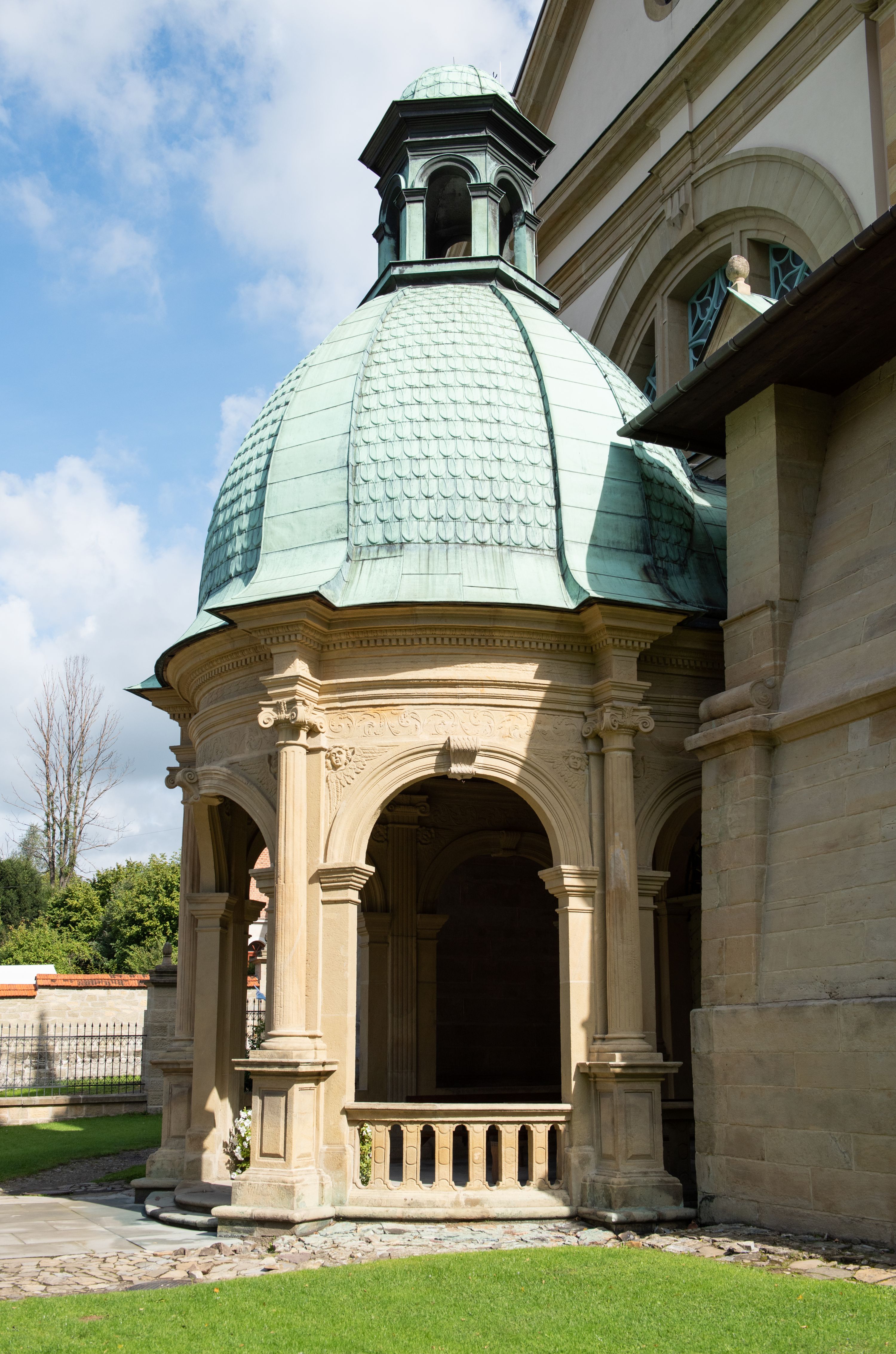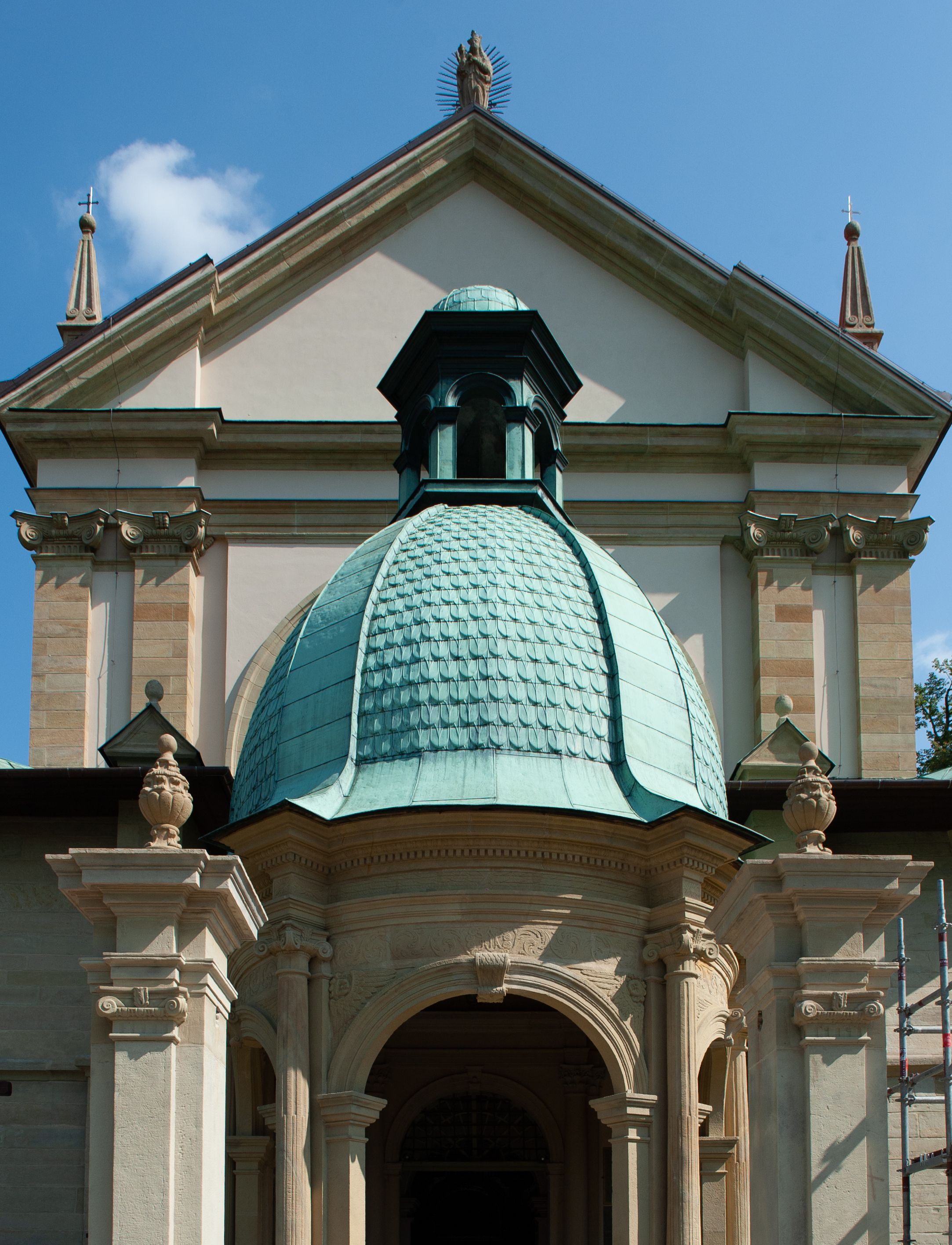 Fasada w dolnej części zaakcentowana jest przez monumentalną kruchtę w formie aediculi, założoną na rzucie prostokąta zamkniętego półkoliście. Ściany artykułowane są pięcioma półkolistymi arkadami, wspartymi na filarkach. Od zewnątrz osie ujęte są przez kanelowane kolumny, ustawione na wysokich cokołach, na tle pilastrów. Podpory wznoszą pełne belkowanie i wysunięty gzyms zdobiony kimationem i dekoracją kostkową. Nakrycie w formie kopuły półkolistej z latarnią. Belkowanie ozdobione jest dekoracją roślinną i główkami aniołków. Po bokach kruchty wysunięte są fragmenty muru oporowego do połowy wysokości fasady. Powyżej fasada flankowana przez dwie pary pilastrów z jońskimi kapitelami wspierającymi niepełne belkowanie. Pośrodku duże, półkoliste okno z metalową, dekoracyjną kratą. Szczyt trójkątny z oculusem pośrodku. Na szczycie ustawiona jest figura Najświętszej Marii Panny. Świątynia dookoła obwiedziona szerokim murem oporowym, nakrytym daszkiem, o ukośnych ścianach, flankowanych szkarpami, po sześć na każdej ścianie bocznej i dwoma na ścianie zachodniej oraz wschodniej. Powyżej elewacje ujęte pilastrami z kapitelami jońskimi wznoszącymi niepełne belkowanie. Na wschodniej ścianie półkolista apsyda, nakryta półkopułą. Kościół nakryty dachem siodłowym ze zdwojoną, wysoką latarnią pośrodku. Na narożach dachu ustawione wysokie obeliski na cokołach.