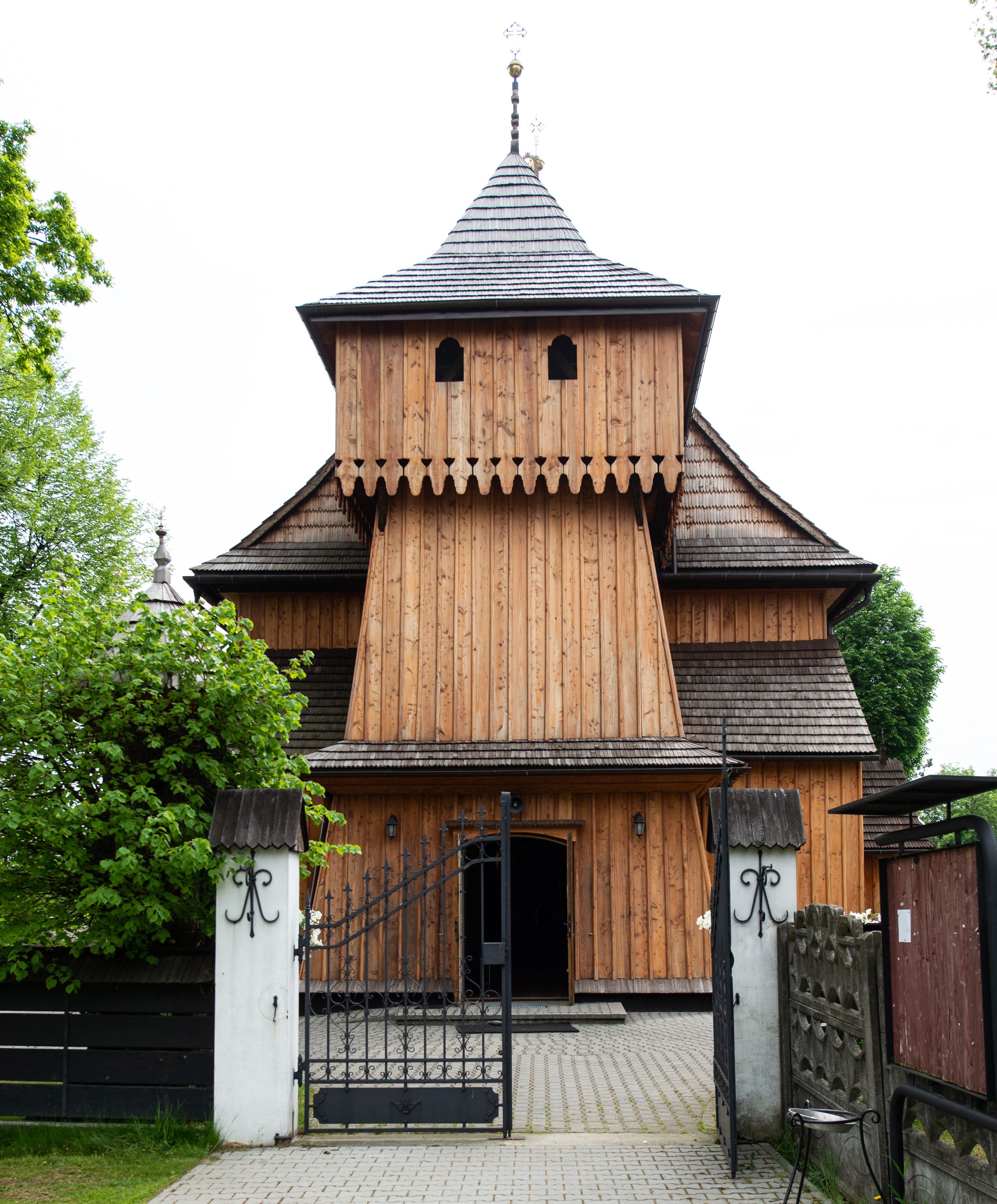 Kościół orientowany, drewniany o konstrukcji zrębowej z wieżą o konstrukcji słupowo-ryglowej na rzucie kwadratu. Nawa prostokątna z węższym, prostokątnym prezbiterium zamkniętym trójboczną absydą. Przy prezbiterium, od północy znajduje się zakrystia, a przy nawie, od południa – kruchta. Na osi nawy, od zachodu wieża o pochyłych ścianach z nadwieszoną izbicą. W kościele sześć otworów okiennych w kształcie stojących prostokątów, ujętych opaskami z prostych listew: dwa od strony północnej i cztery od strony południowej. Na zewnątrz okien zamontowane są współczesne kraty z ozdobnych prętów. Główne wejście do kościoła od zachodu w przyziemiu wieży. Dach dwuspadowy, od wschodu trójspadowy, wykonany w konstrukcji krokwiowo-jętkowej z podwójnymi jętkami, kryty gontem. Zakrystia zadaszona przedłużoną połacią głównego dachu. Na osi kalenicy dachu wieżyczka na sygnaturkę, barokowa z latarnią, kryta blachą miedzianą. Z zewnątrz ściany kościoła i wieży pokryto szalunkiem pionowym z listwami na stykach łączenia desek. Nadwieszona izbica wieży z wyciętymi ornamentami na dolnych zakończeniach desek. W czterech ścianach izbicy po dwa okna w kształcie stojącego prostokąta, zamknięte łukiem nadwieszonym. Wieża nakryta daszkiem czterospadowym, krytym gontem. Do obu stron wieży dostawione nowe dobudówki: w południowej umieszczono schody na chór muzyczny, a w północnej znajdują się pomieszczenia gospodarcze. Kościół w przyziemiu jest podbudowany betonowym cokołem, silnie wysuniętym przed lico ścian i zabezpieczony małym daszkiem.