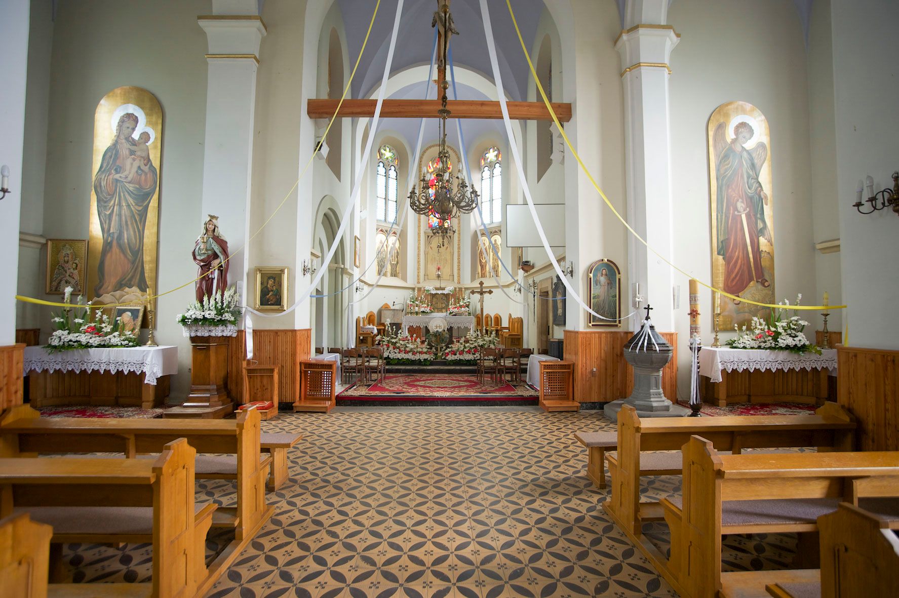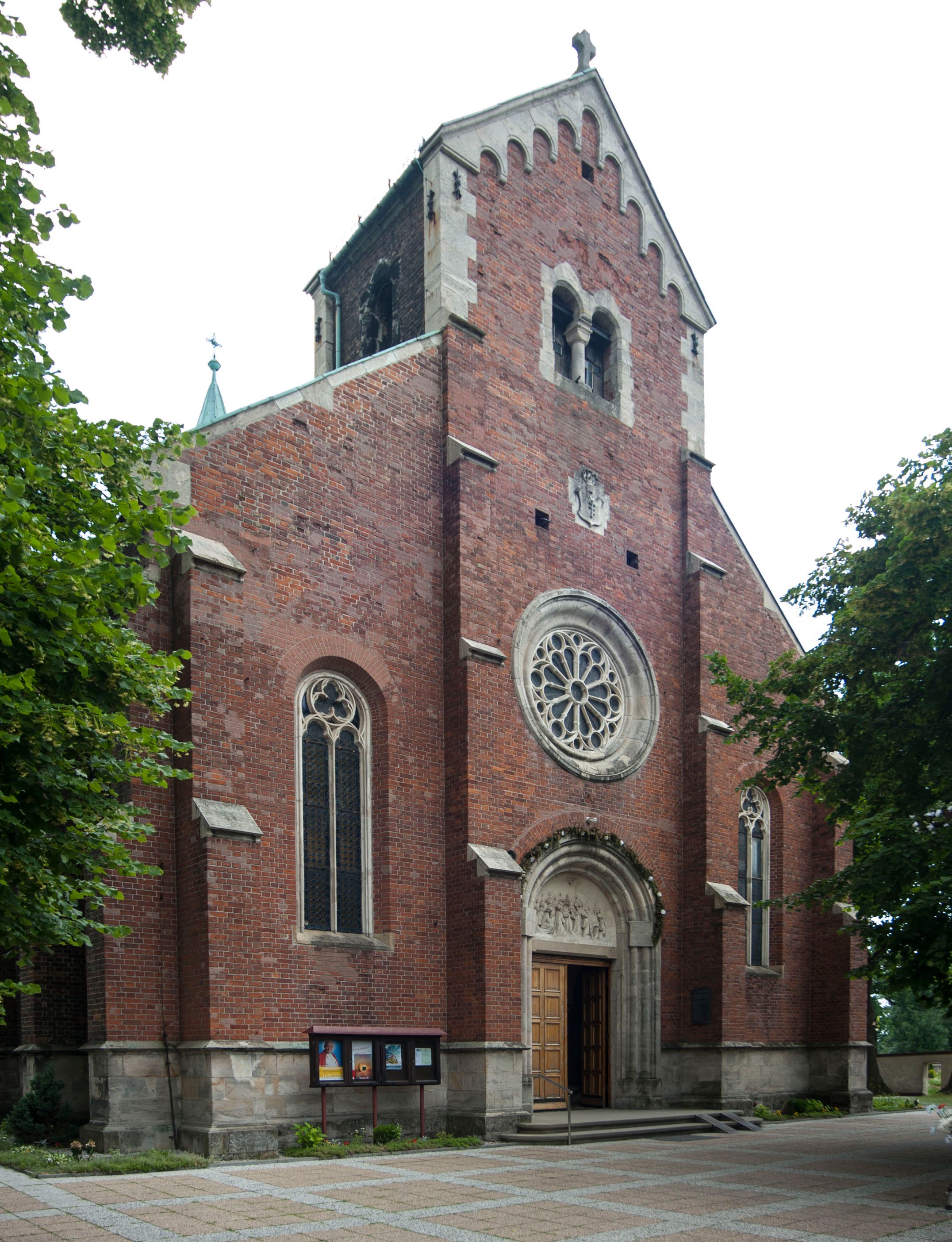 Pierwszy, drewniany kościół został wzniesiony w tej miejscowości w 1313 roku. Kolejny, już murowany, stał tutaj w XVI wieku, lecz spłonął w 1875 roku. Obecny został zbudowany w latach 1885-1895. Pierwszy projekt wykonał krakowski architekt Jacek Matusiński, uległ on jednak znacznym zmianom, które wprowadził budowniczy kościoła Kazimierz Piotrkowski.