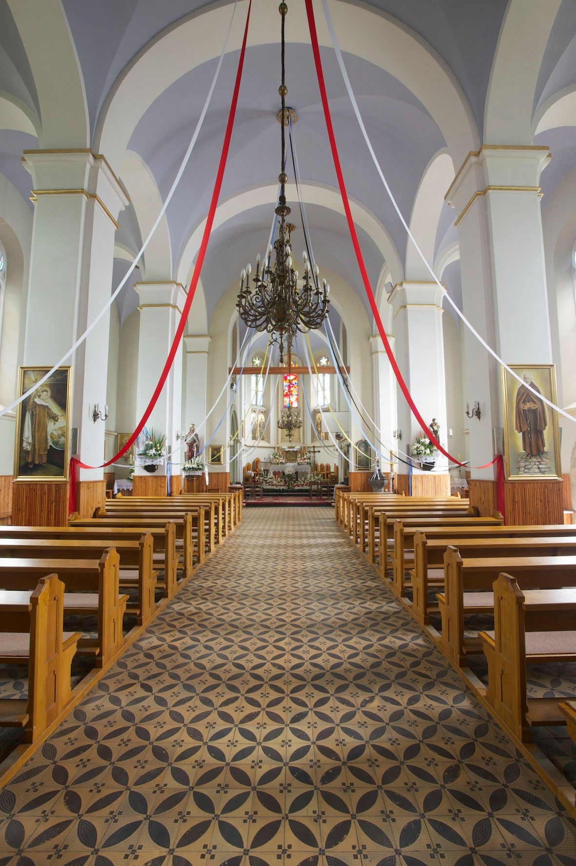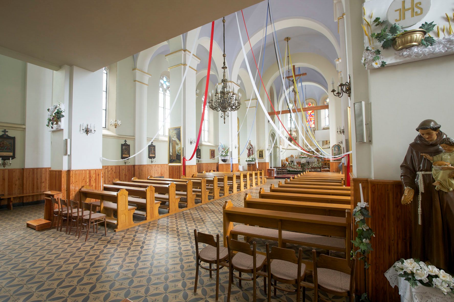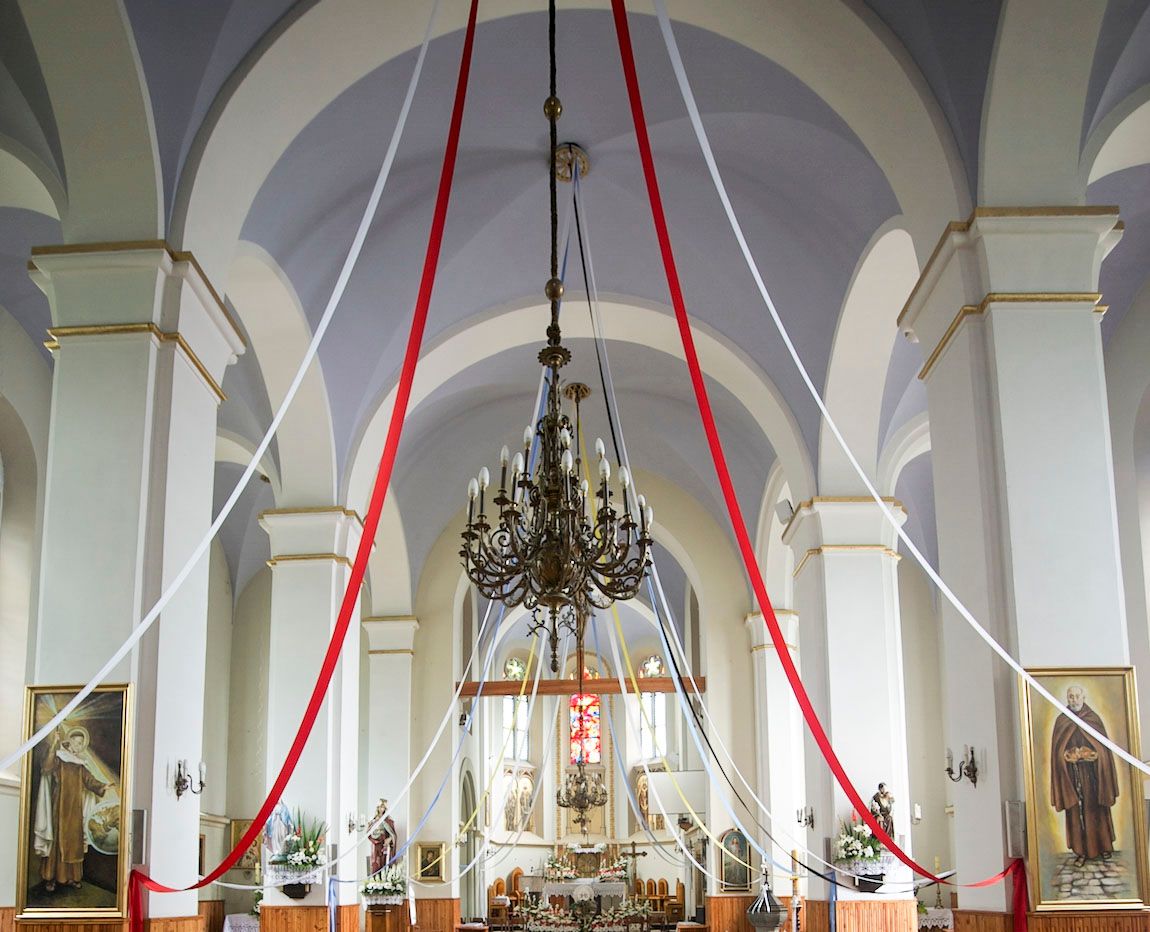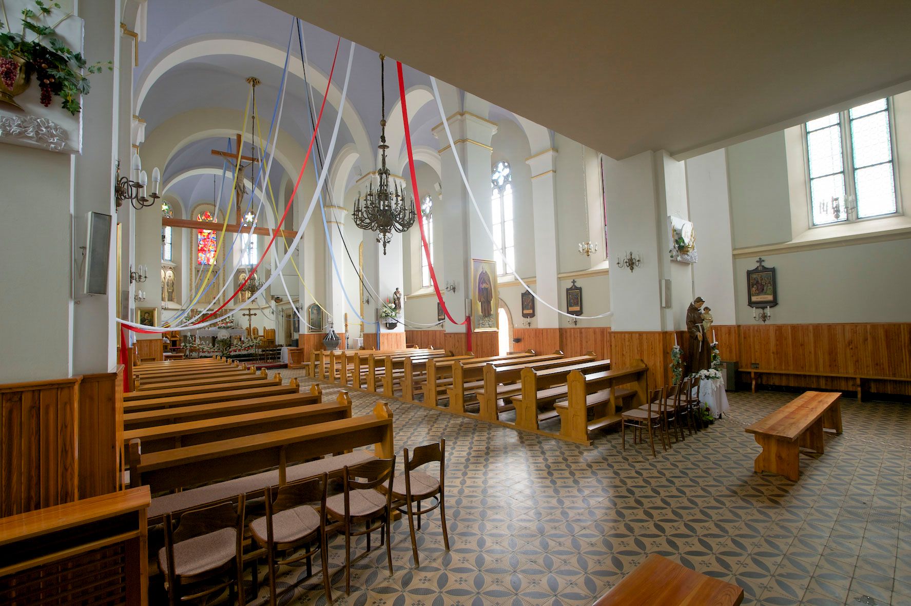 Kościół orientowany, murowany, trójnawowy, czteroprzęsłowy, z jednoprzęsłowym prezbiterium zakończonym wielobocznie. Do prezbiterium dostawione symetrycznie aneksy, od zachodu kruchta, w przyziemiu wieża flankowana dwiema klatkami schodowymi (pomieszczeniem gospodarczym?). Nawy oddzielone od siebie masywnymi filarami opilastrowanymi, z uproszczonymi kapitelami, podtrzymującymi arkady. Nawy i prezbiterium nakryte sklepieniem krzyżowym na gurtach, pięcioboczne zamknięcie prezbiterium sklepieniem parasolowatym. Nawę i prezbiterium oświetlają wysokie, prostokątne okna zakończone półkoliście z oknami trójrzędowymi dwuosiowymi, zakończonymi maswerkami. Układ komunikacyjny zaznaczony kamiennymi portalami o sfazowanych węgarach. Do kościoła prowadzą duże prostokątne drzwi, w kruchcie zakończone półkoliście. Tam też prostokątne wejścia do aneksów bocznych. W południowo-zachodniej ścianie prostokątne wejście zamknięte ściętym łukiem nadwieszonym. Takie samo wejście do aneksu południowego przy prezbiterium. Do aneksu północnego przy prezbiterium prostokątne wejście zamknięte łukiem odcinkowym, ujęte kamiennym portalem, zamkniętym półkoliście. Wejście w ścianie nawy południowej zaznaczone kamiennym portalem zamkniętym łukiem ostrym. W skrajnym przęśle nawy od zachodu chór muzyczny wsparty na dwóch filarach międzynawowych. W części chóru nad kruchtą wnęka otwarta kamienną rozetą. Fasada kościoła trójosiowa, dwukondygnacyjna, ujęta szkarpami z uskokami. Szkarpy z uskokami wydzielają także środkową oś fasady. W jej dolnej kondygnacji znajduje się kamienny portal główny, ujęty uskokowo ustawionymi półkolumnami i zakończony półkolistym tympanonem wypełnionym płaskorzeźbą ze sceną Zesłania Ducha Świętego. Powyżej wypełniona maswerkiem rozeta w profilowanej ramie. Między nią a biforium niewielki herb rodziny Potockich. Szczyt dekoruje fryz arkadkowy. W osiach bocznych wysokie, dwudzielne okna z maswerkiem. Budynek ustawiony na kamiennym cokole, oszkarpowany, z kamiennymi detalami, dekorowany fryzem arkadkowym, z otwartym od zewnątrz obejściem prezbiterium. W obejściu płaskorzeźbiona grupa Ukrzyżowania. Dachy kryte blachą – nawy i wieży dwuspadowe, przybudówek przy prezbiterium pulpitowe, nad obejściem i prezbiterium wieloboczne. Na kalenicy wieżyczka na sygnaturkę z latarnią i wielobocznym dachem.
