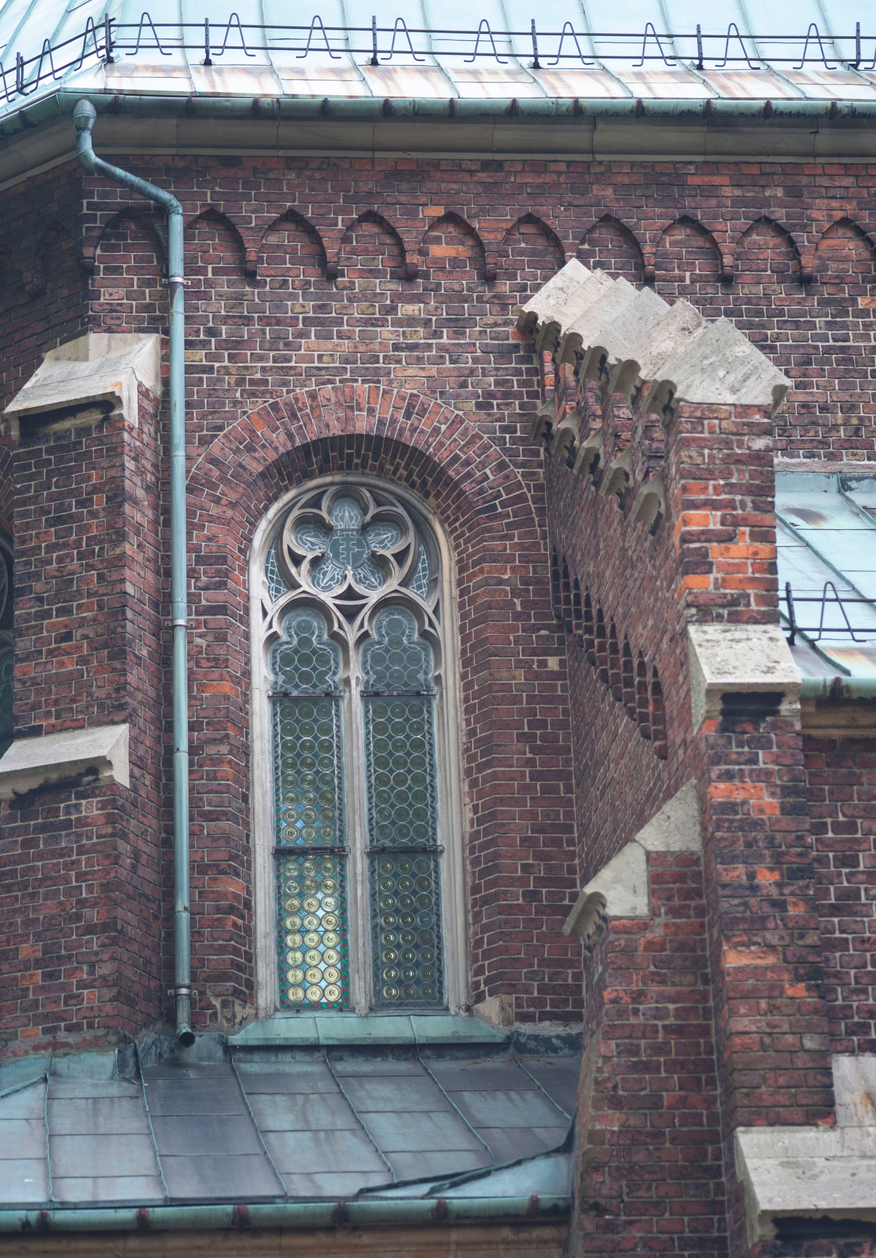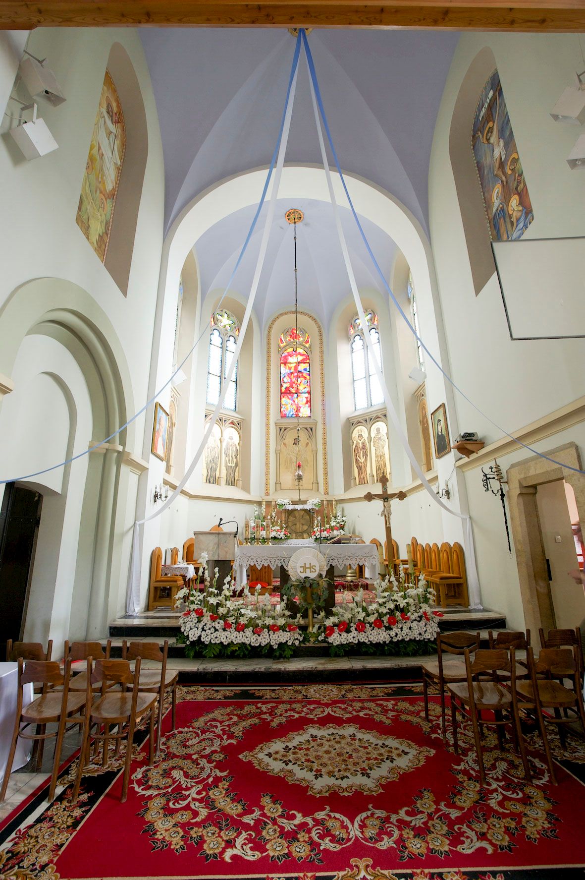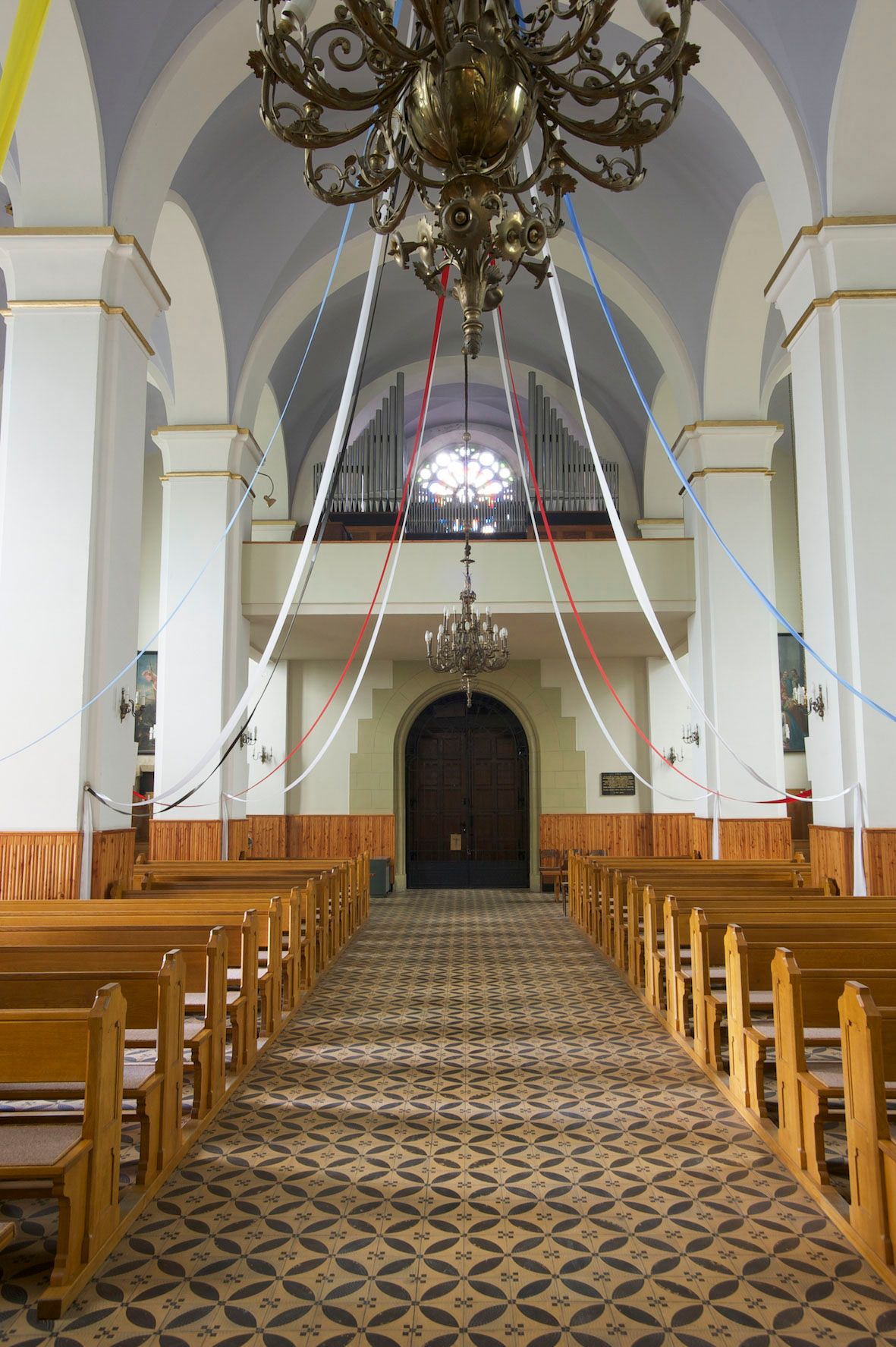 Kościół orientowany, murowany, trójnawowy, czteroprzęsłowy, z jednoprzęsłowym prezbiterium zakończonym wielobocznie. Do prezbiterium dostawione symetrycznie aneksy, od zachodu kruchta, w przyziemiu wieża flankowana dwiema klatkami schodowymi (pomieszczeniem gospodarczym?). Nawy oddzielone od siebie masywnymi filarami opilastrowanymi, z uproszczonymi kapitelami, podtrzymującymi arkady. Nawy i prezbiterium nakryte sklepieniem krzyżowym na gurtach, pięcioboczne zamknięcie prezbiterium sklepieniem parasolowatym. Nawę i prezbiterium oświetlają wysokie, prostokątne okna zakończone półkoliście z oknami trójrzędowymi dwuosiowymi, zakończonymi maswerkami. Układ komunikacyjny zaznaczony kamiennymi portalami o sfazowanych węgarach. Do kościoła prowadzą duże prostokątne drzwi, w kruchcie zakończone półkoliście. Tam też prostokątne wejścia do aneksów bocznych. W południowo-zachodniej ścianie prostokątne wejście zamknięte ściętym łukiem nadwieszonym. Takie samo wejście do aneksu południowego przy prezbiterium. Do aneksu północnego przy prezbiterium prostokątne wejście zamknięte łukiem odcinkowym, ujęte kamiennym portalem, zamkniętym półkoliście. Wejście w ścianie nawy południowej zaznaczone kamiennym portalem zamkniętym łukiem ostrym. W skrajnym przęśle nawy od zachodu chór muzyczny wsparty na dwóch filarach międzynawowych. W części chóru nad kruchtą wnęka otwarta kamienną rozetą. Fasada kościoła trójosiowa, dwukondygnacyjna, ujęta szkarpami z uskokami. Szkarpy z uskokami wydzielają także środkową oś fasady. W jej dolnej kondygnacji znajduje się kamienny portal główny, ujęty uskokowo ustawionymi półkolumnami i zakończony półkolistym tympanonem wypełnionym płaskorzeźbą ze sceną Zesłania Ducha Świętego. Powyżej wypełniona maswerkiem rozeta w profilowanej ramie. Między nią a biforium niewielki herb rodziny Potockich. Szczyt dekoruje fryz arkadkowy. W osiach bocznych wysokie, dwudzielne okna z maswerkiem. Budynek ustawiony na kamiennym cokole, oszkarpowany, z kamiennymi detalami, dekorowany fryzem arkadkowym, z otwartym od zewnątrz obejściem prezbiterium. W obejściu płaskorzeźbiona grupa Ukrzyżowania. Dachy kryte blachą – nawy i wieży dwuspadowe, przybudówek przy prezbiterium pulpitowe, nad obejściem i prezbiterium wieloboczne. Na kalenicy wieżyczka na sygnaturkę z latarnią i wielobocznym dachem.
