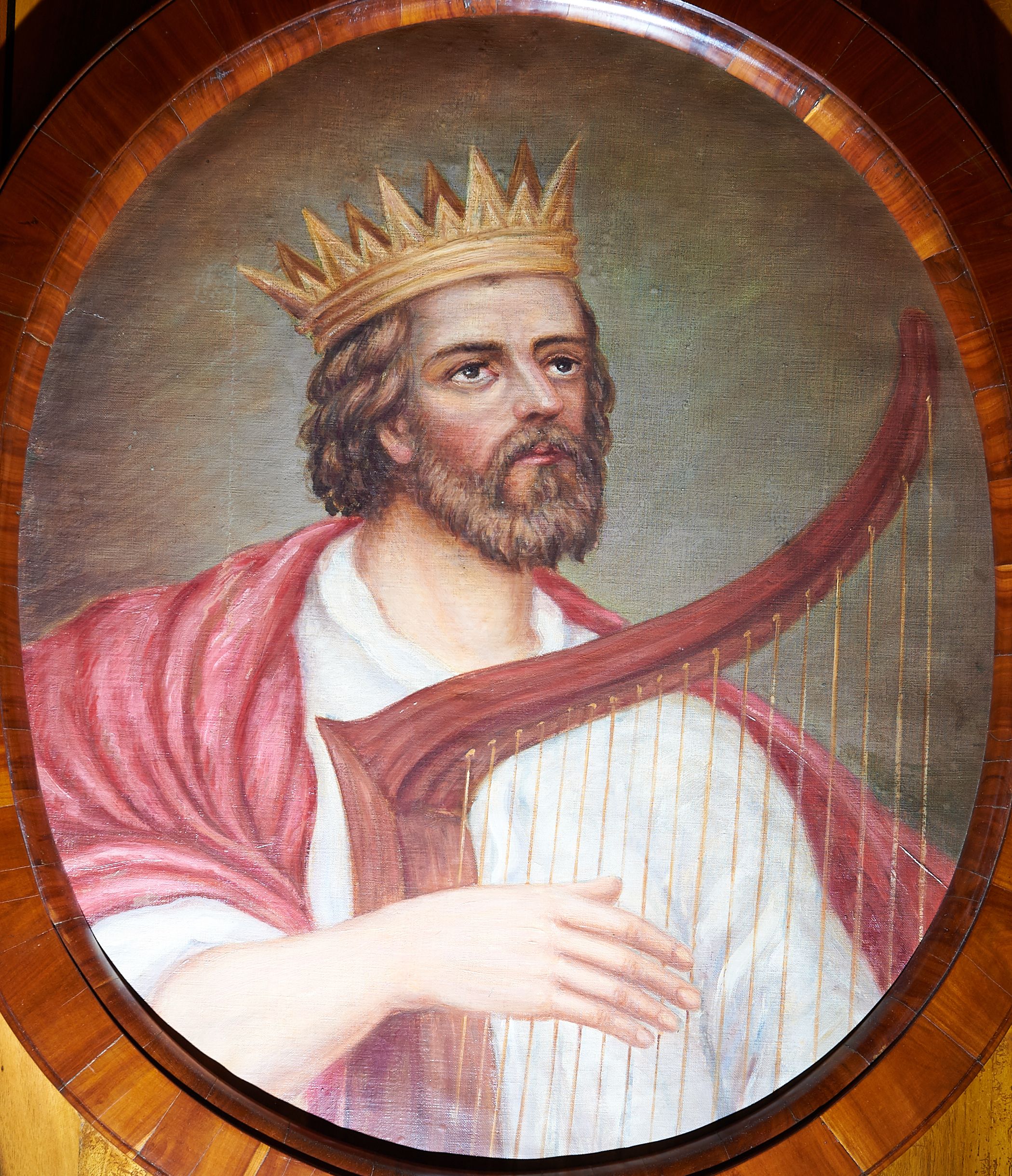 Obraz w kształcie owalu z przedstawieniem króla Dawida, grającego prawą ręką na czerwonej harfie, ukazanego w popiersiu, zwróconego lekko w lewą stronę. Głowa uniesiona, skierowana w lewo. Twarz okolona krótkim, jasnobrązowym zarostem, nos długi, oczy ciemne. Ubrany jest w białą suknię oraz purpurowy płaszcz okrywający prawe ramię, na głowie ma założoną złotą koronę otwartą. Tło jasnobrązowe, rozświetlone wokół głowy. Rama drewniana, fornirowana, politurowana.