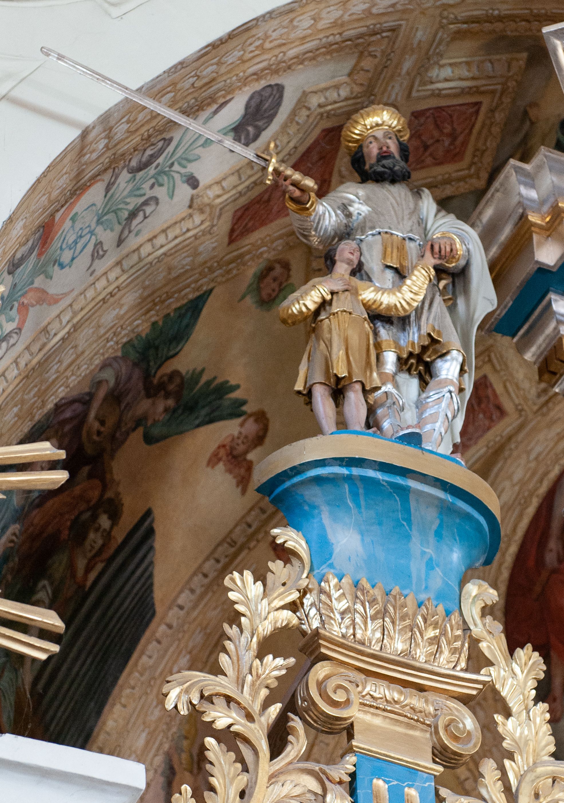 Rzeźba przedstawiająca króla Saula z Dawidem. Mężczyźni ukazani w postawie stojącej, trzymający się za lewe dłonie. Dawid sięgający do wysokości pasa Saula ustawiony przy jego prawym boku. Król w prawej dłoni trzyma miecz, a Dawid prawą dłoń składa na piersi. Twarz Saula szeroka z długim nosem, delikatnie rozchylonymi ustami, okolona średniej długości, czarną brodą oraz czarnymi włosami. Ubrany jest w srebrną tunikę, przewiązaną złotym pasem oraz biały płaszcz założony na lewe ramię; na głowie ma złoty turban, a na stopach wysokie rzymskie sandały. Dawid ubrany jest w złoconą tunikę z długimi rękawami. Polichromia w odsłoniętych partiach ciała naturalistyczna, szaty i detale złocone i srebrzone.
