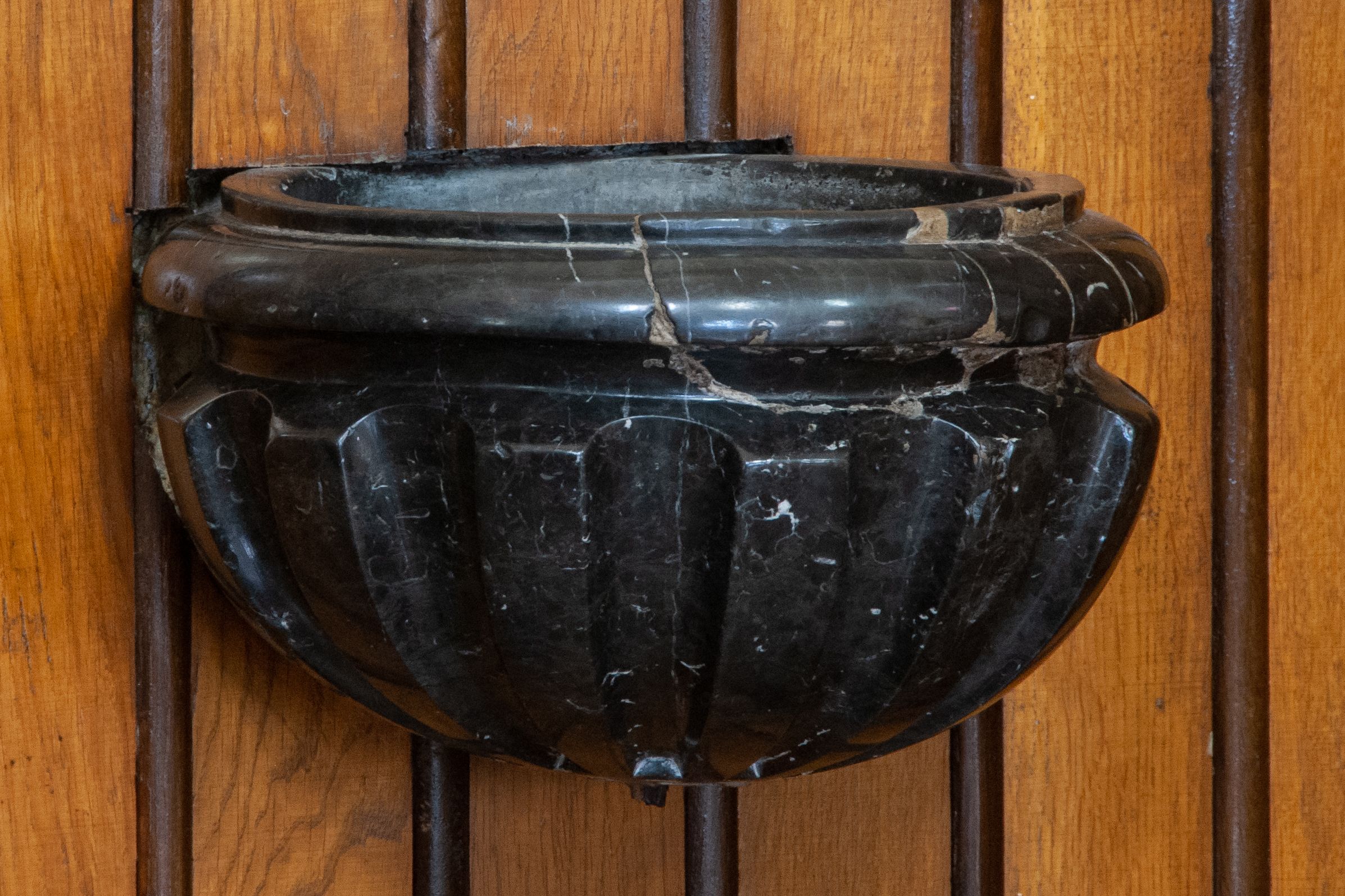 Niewielka kropielnica z głęboką, półkulistą czarą na wodę ozdobioną pionowymi występami imitującymi pukle i wylewem w kształcie ćwierćwałka jest wmurowana w ścianę kruchty kościoła.