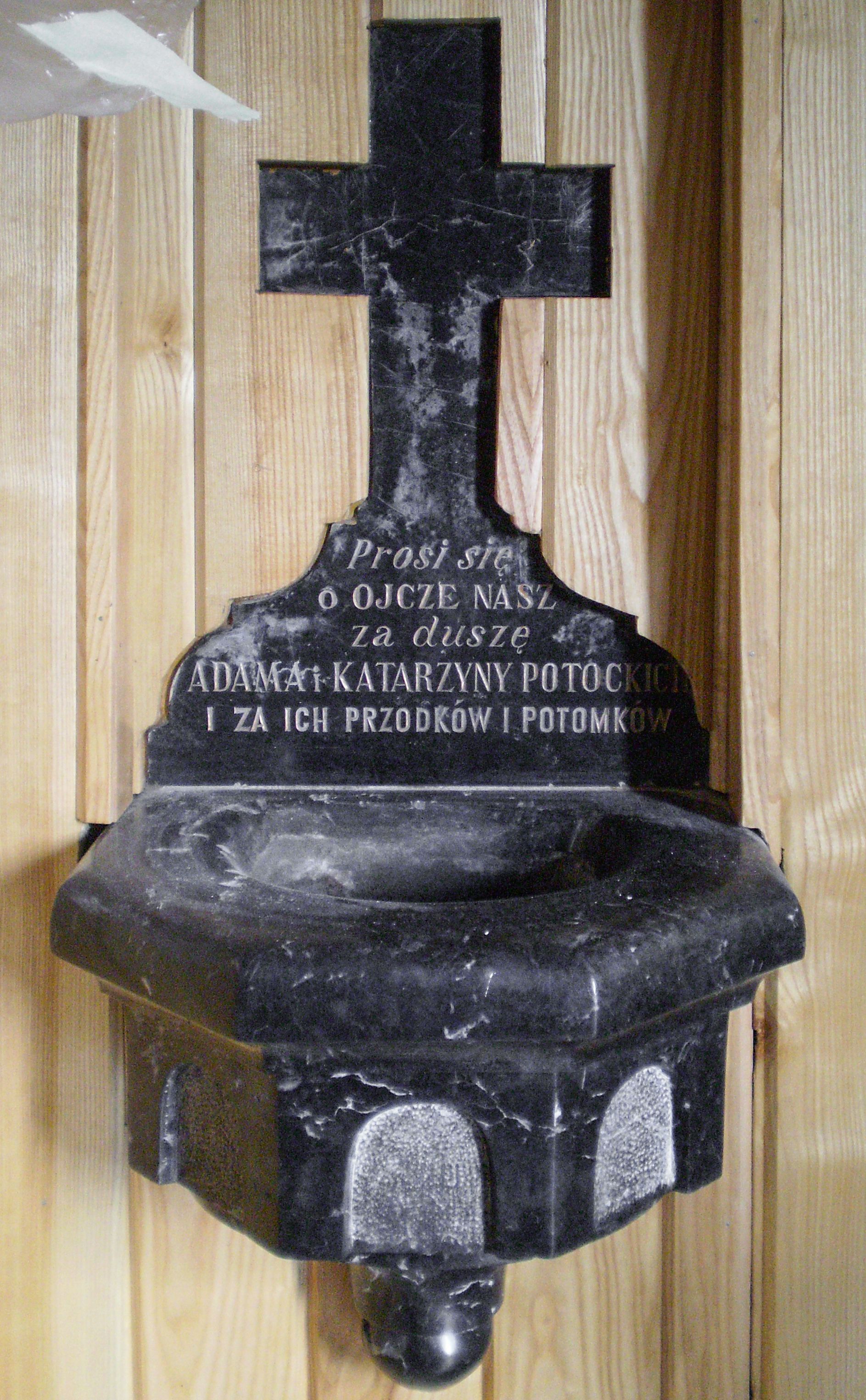 Kropielnica wmurowana w ścianę, na rzucie pięcioboku, z wewnętrznym półkulistym pojemnikiem na wodę, o bocznych ściankach z ślepymi zakończonymi półkoliście arkadkami. Nad kropielnicą krzyż na szerokiej podstawie o wykroju wklęsło-wypukłym z inskrypcją „Prosi się / o OJCZE NASZ / za duszę / ADAMA I KATARZYNY POTOCKICH / ZA ICH PRZODKÓW I POTOMKÓW”. Od dołu widoczna podtrzymująca czarę profilowana konsola zakończona kulistą gałką.