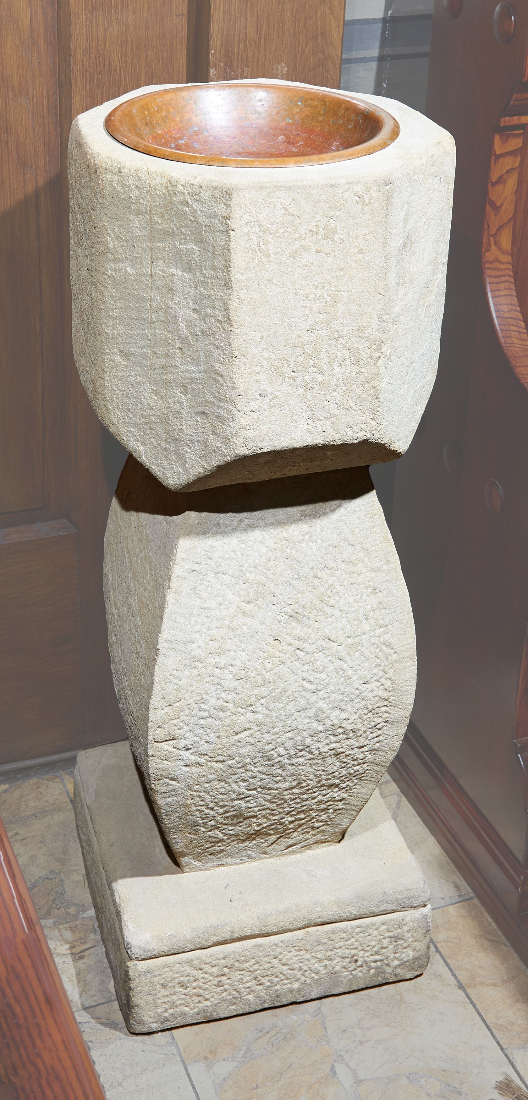 Kropielnica ustawiona na kostce; trzon czworoboczny, wybrzuszony pośrodku; czara ośmioboczna, ścięta od dołu; wewnątrz blaszana misa.
