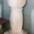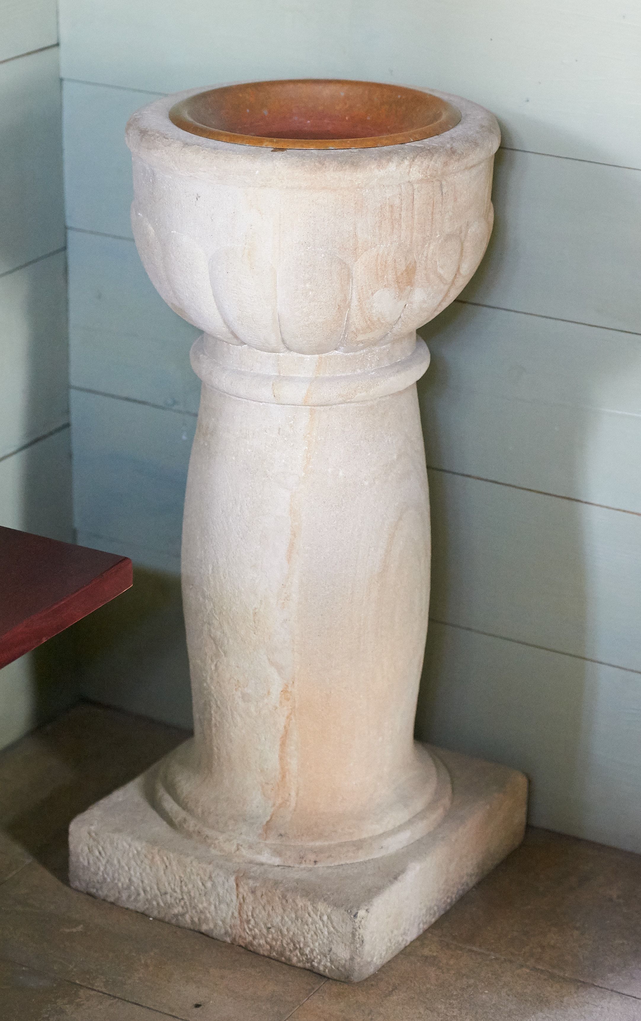 Kropielnica ustawiona na niskiej kostce. Stopa okrągła, zwężająca się w trzon w formie masywnej tralki. Czara półkolista z wywiniętą wargą, od dołu puklowana; wewnątrz miedziana misa.