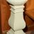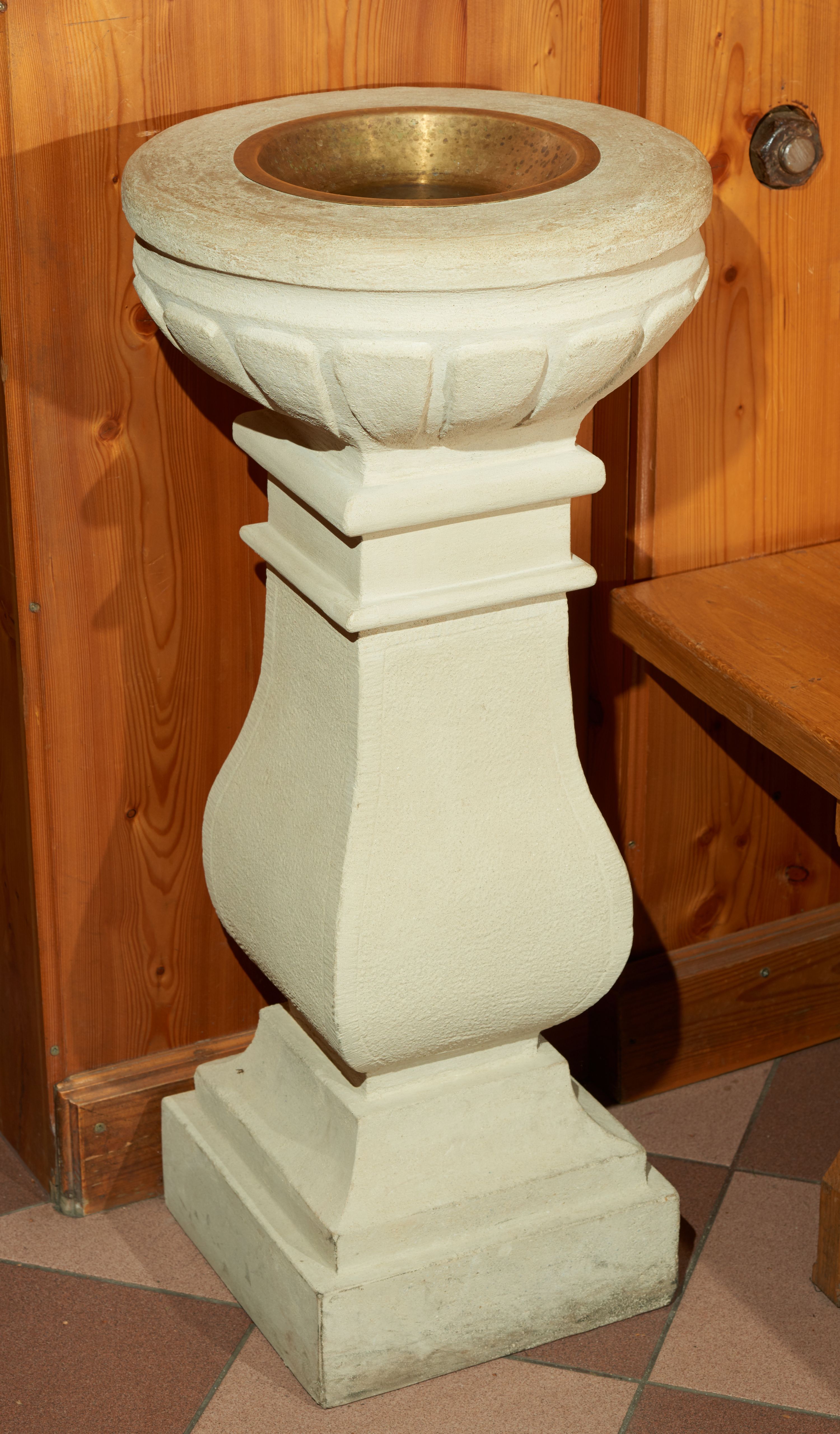 Kropielnica ustawiona na kostce; trzon czworoboczny, wybrzuszony w dolnej partii, ujęty dwoma talerzykami; czara półkolista, zdobiona zgeometryzowanym puklowaniem z wyodrębnionym brzegiem; wewnątrz blaszana misa.