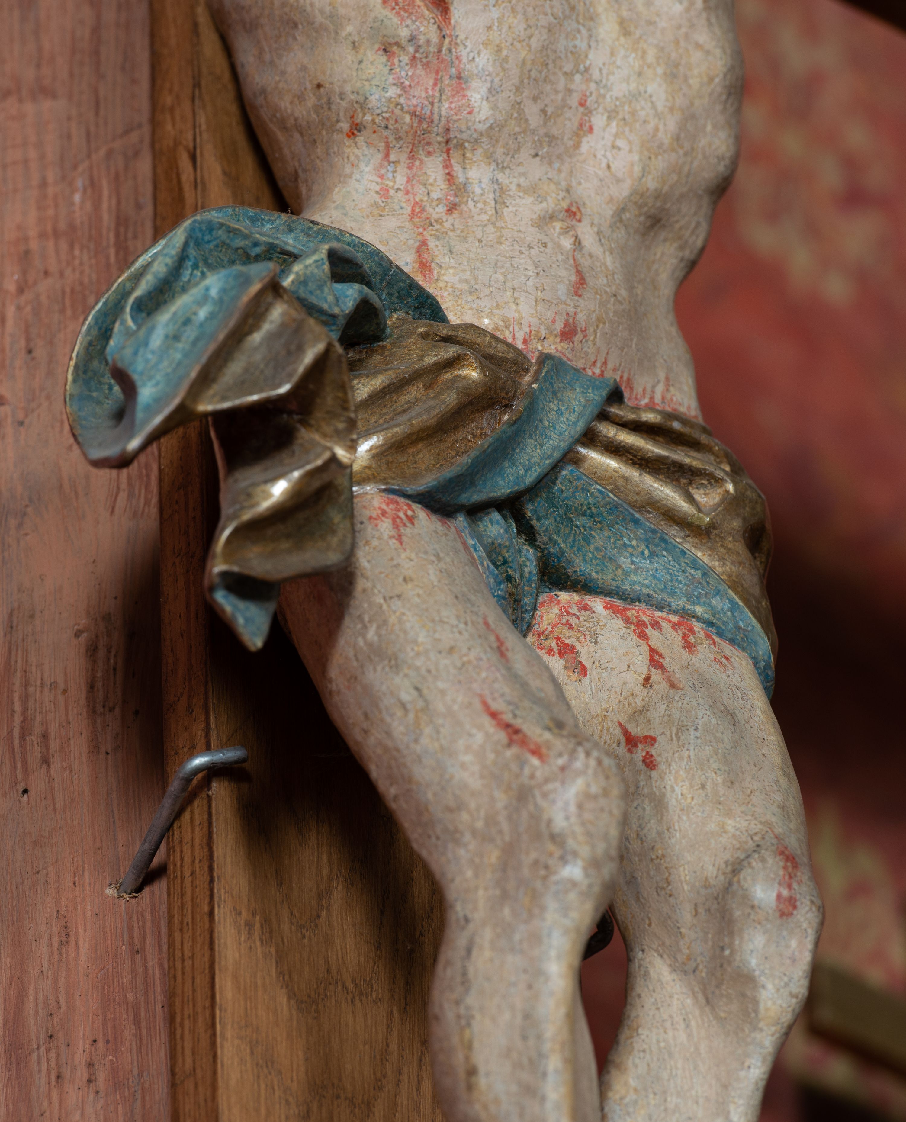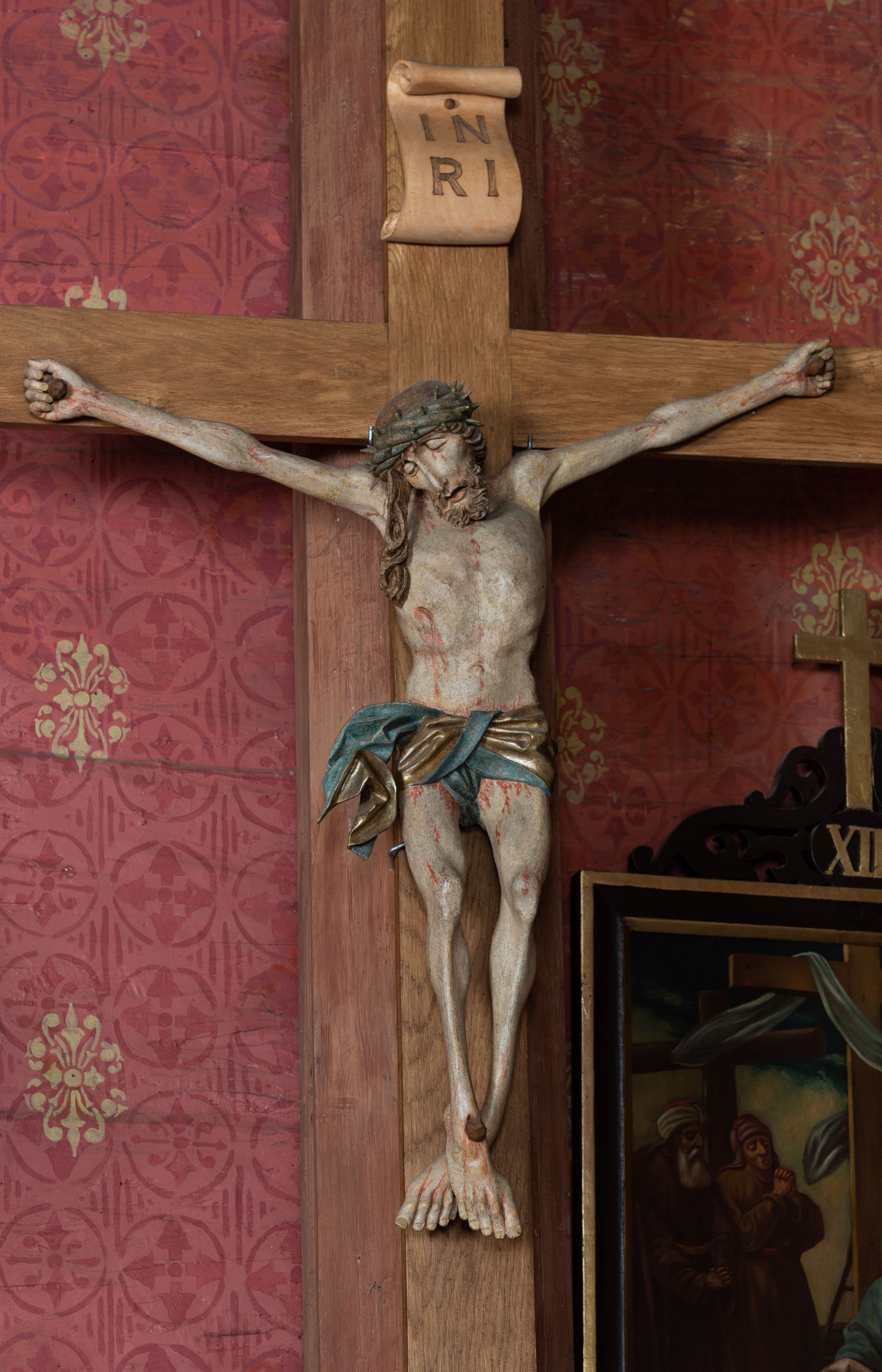 Rzeźba ścięta z tyłu, przybita do krzyża trzema gwoździami, w typie Christo vivo. Ciało w lekkim zwisie o horyzontalnie rozłożonych ramionach, głowa opada na prawy bark, nogi lekko ugięte, stopy skrzyżowane w układzie prawa na lewą. Ciało jest silnie wysmuklone, z wyraźnie rozbudowaną i wypchniętą do przodu klatką piersiową, z podkreślonymi żebrami i zapadłym brzuchem; ręce i nogi są bardzo wychudzone z wyłamanymi barkami, podkreślonymi łokciami i kolanami. Twarz jest pociągła, wychudzona, z głęboko osadzonymi i rzeźbionymi, półotwartymi oczami, wąskim, długim nosem oraz otwartymi ustami z opadającą żuchwą; okolona krótką brodą, głęboko rzeźbioną w regularne pukle oraz długimi włosami ułożonymi w pojedyncze lekko skręcone pukle opadające na plecy oraz na klatkę piersiową. Głowę wieńczy masywna korona cierniowa. Perizonium jest krótkie, silnie opasujące ciało, zawiązane w partii podbrzusza z rozwianym ekspresyjnie fragmentem tkaniny w charakterystycznym odwinięciu na prawym boku. Figura jest polichromowana naturalistycznie, ciało wyróżnia się bladą karnacją z zaznaczonymi śladami męki; perizonium jest złocone i niebieskie na podszewce.