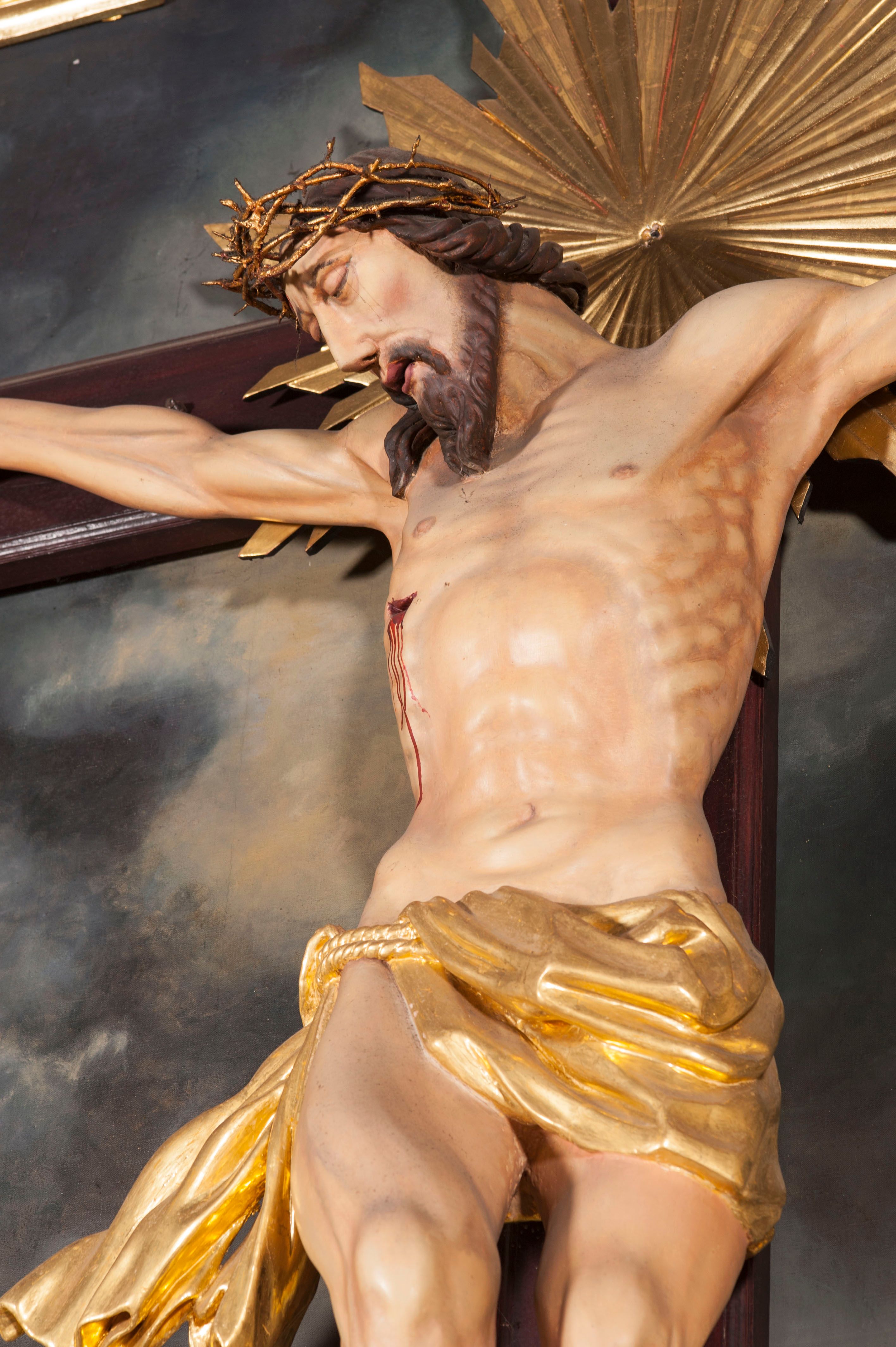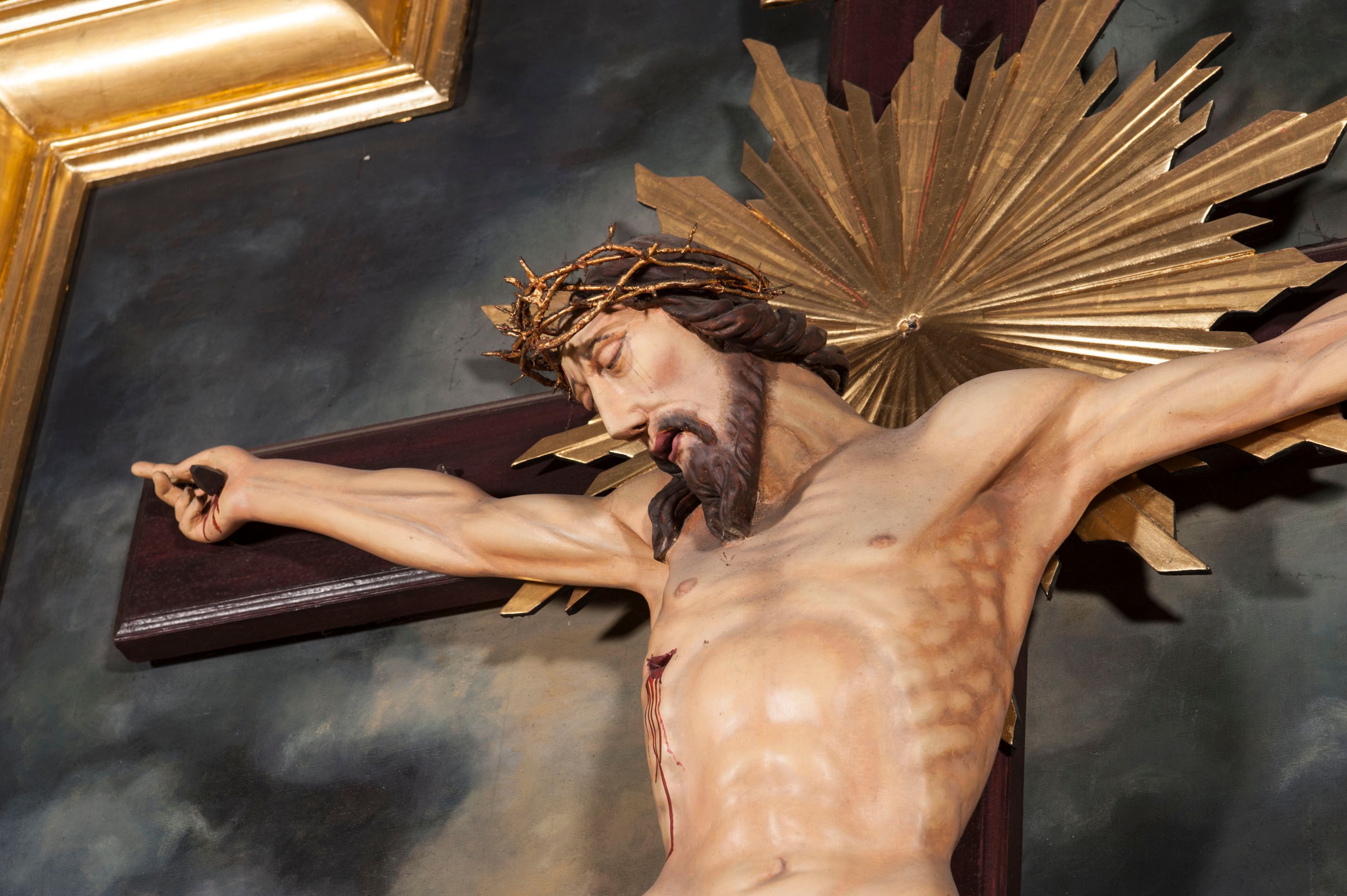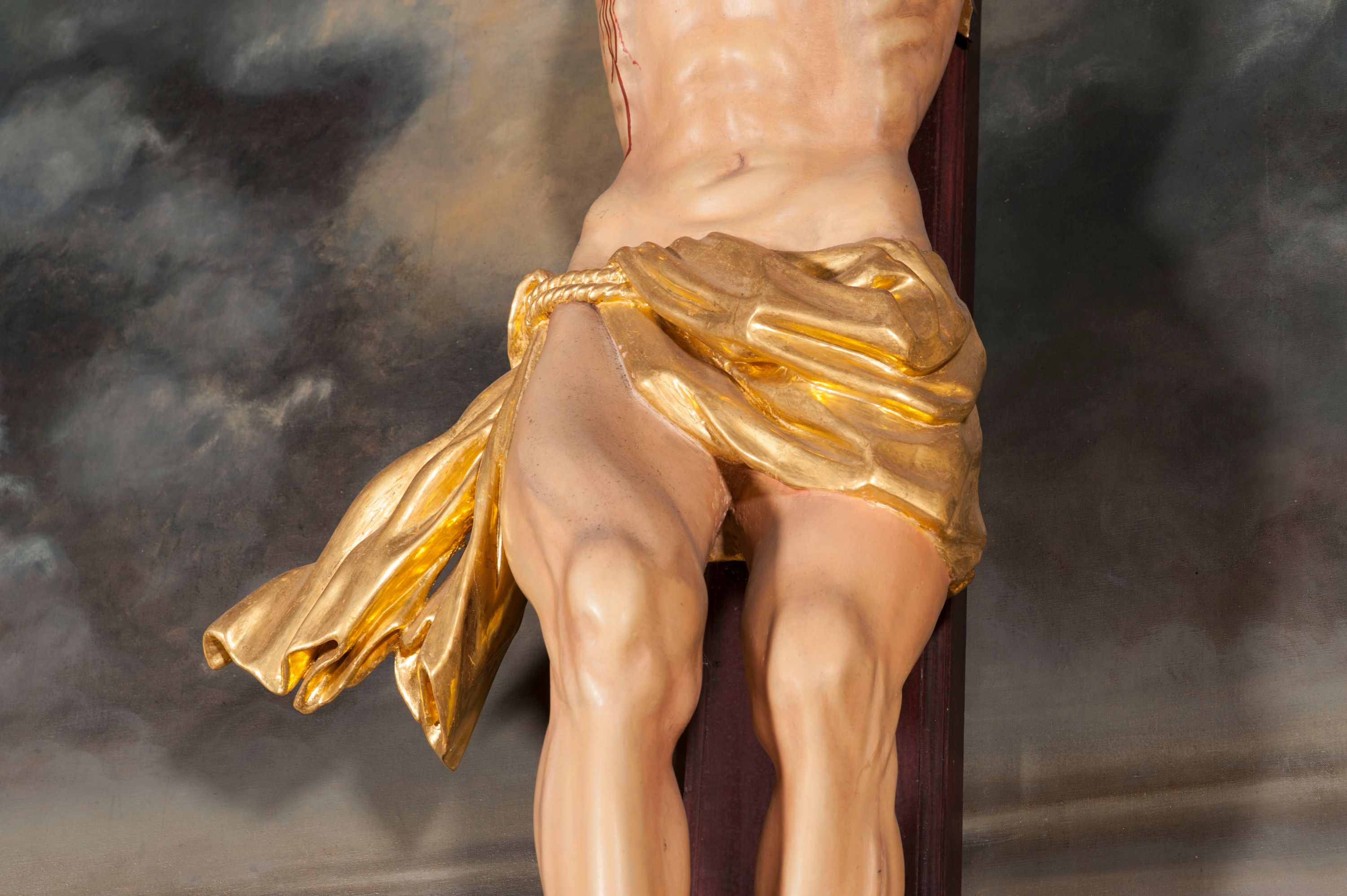 Figura Chrystusa Ukrzyżowanego powstała około połowy XVII wieku. Została wtórnie umieszczona w ołtarzu bocznym w 1899 roku. Chrystus ukazany jest w typie Cristo morte, a więc jako umarły, już po tym jak skonał na krzyżu.