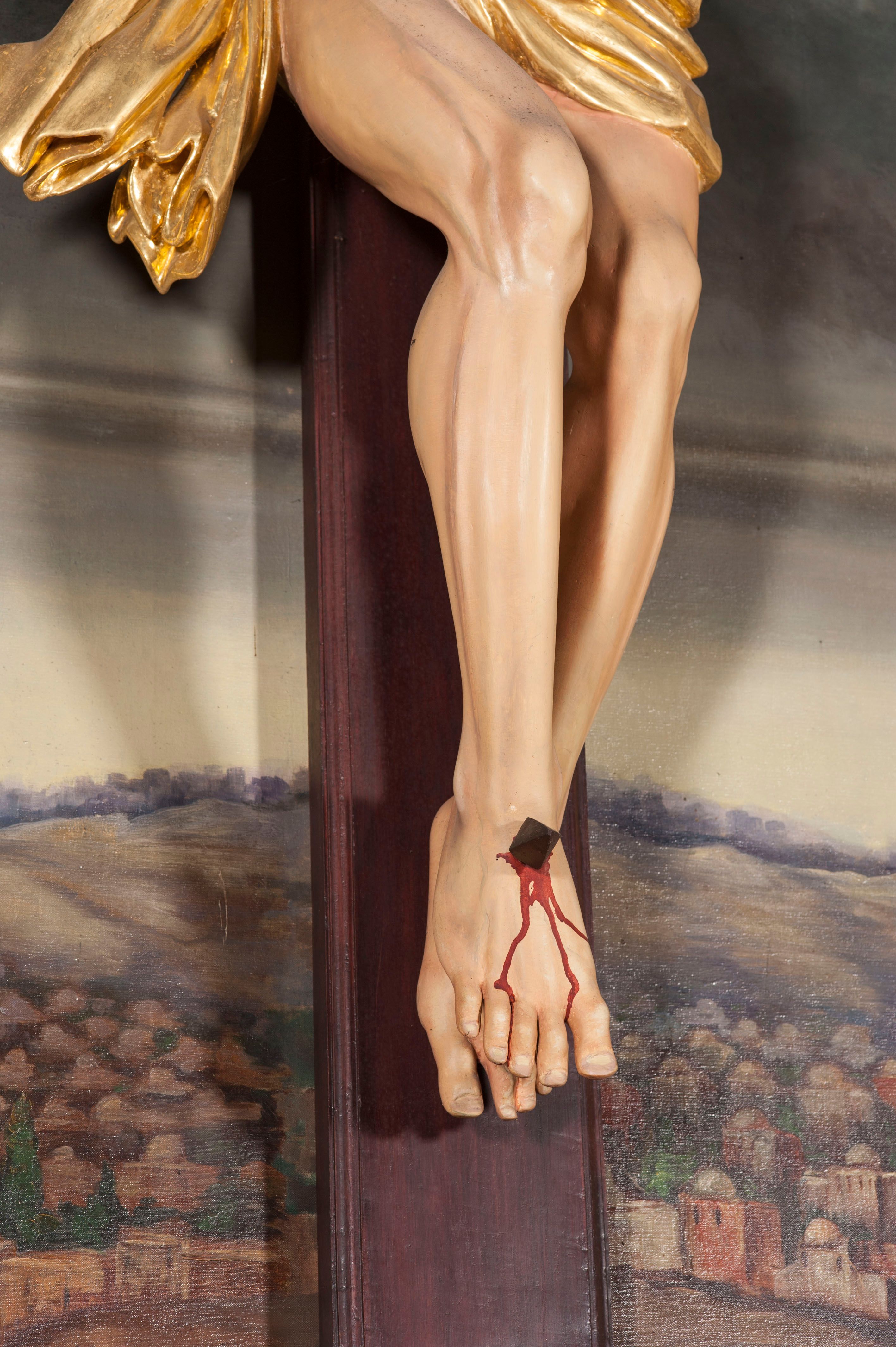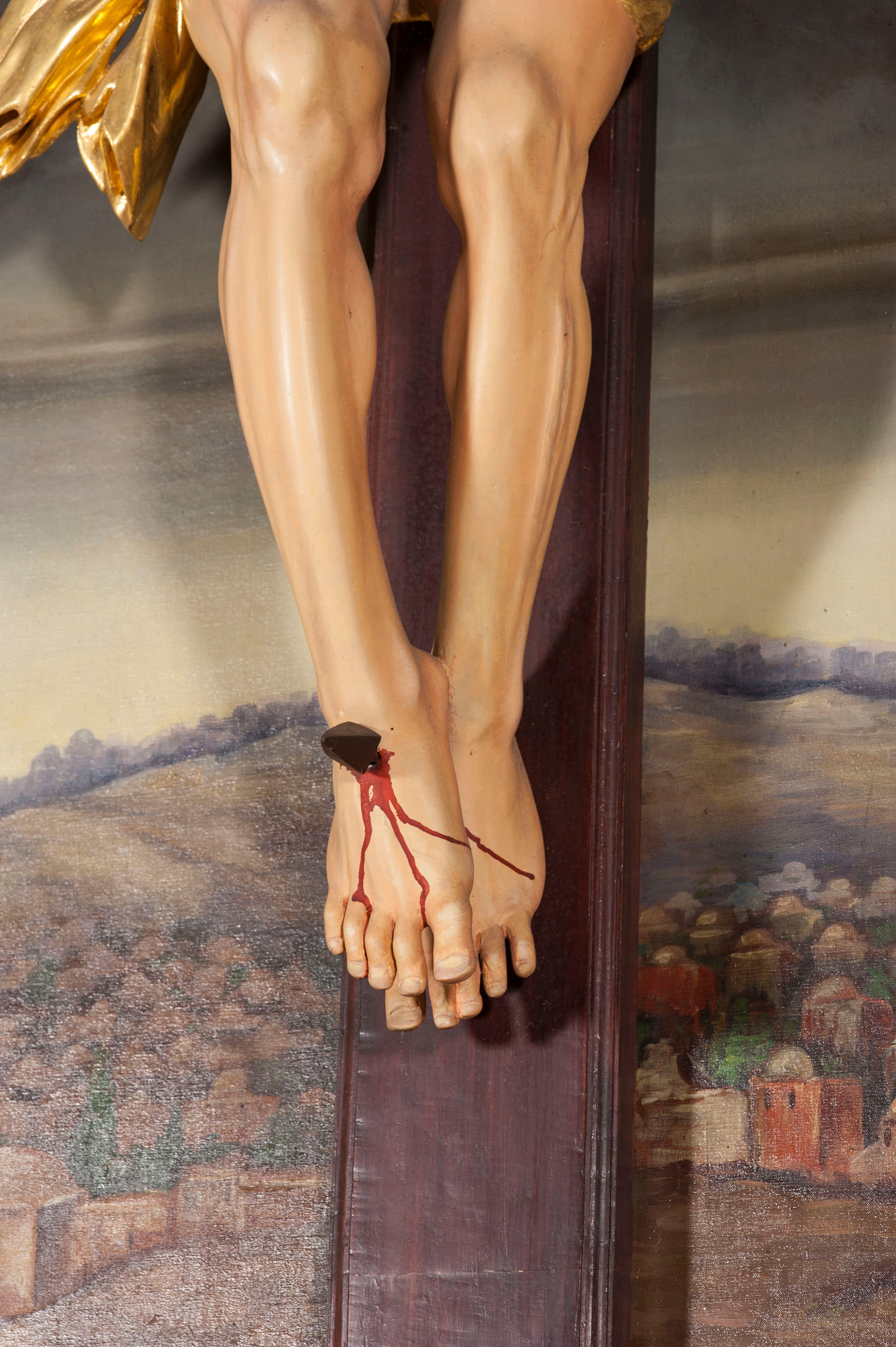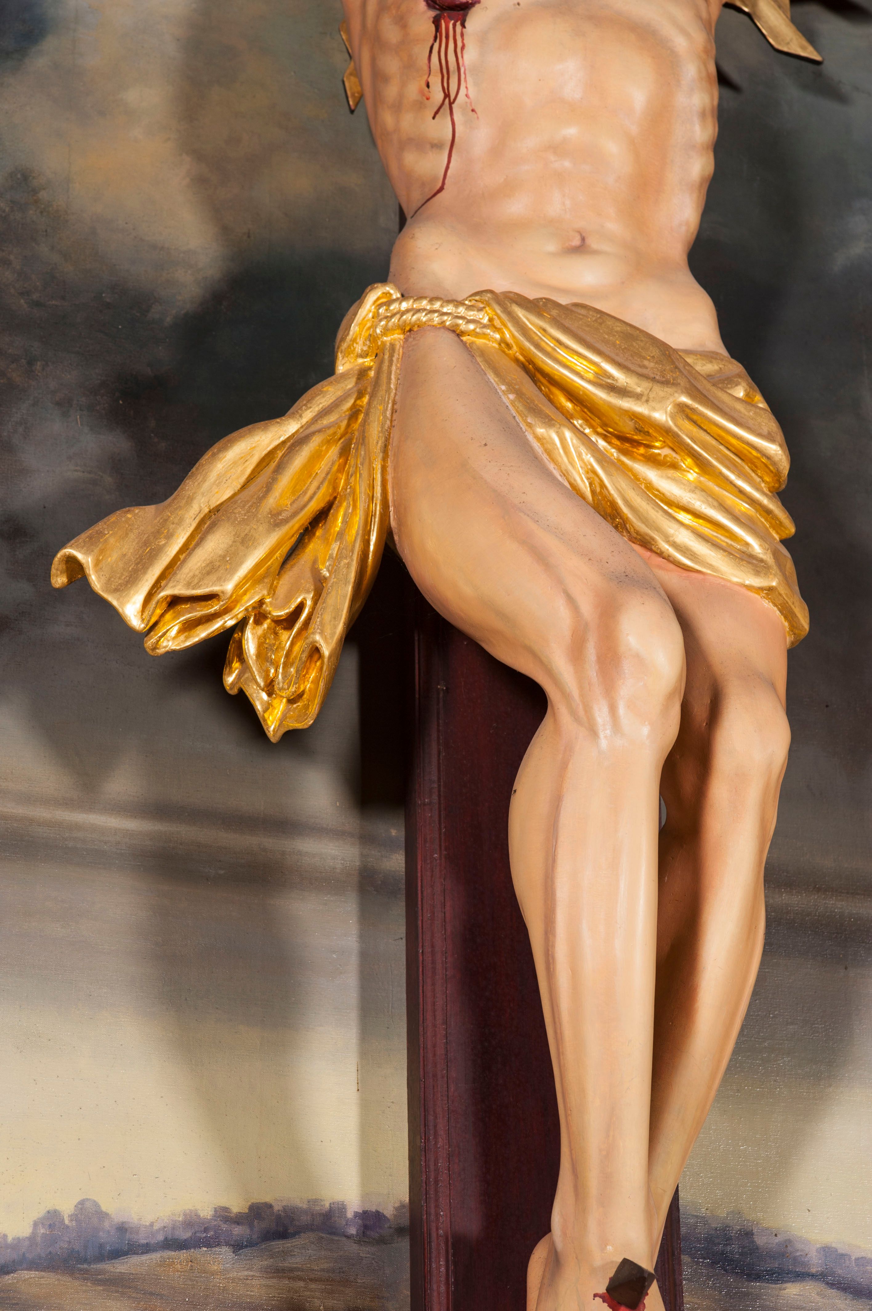 Figura Chrystusa Ukrzyżowanego powstała około połowy XVII wieku. Została wtórnie umieszczona w ołtarzu bocznym w 1899 roku. Chrystus ukazany jest w typie Cristo morte, a więc jako umarły, już po tym jak skonał na krzyżu.