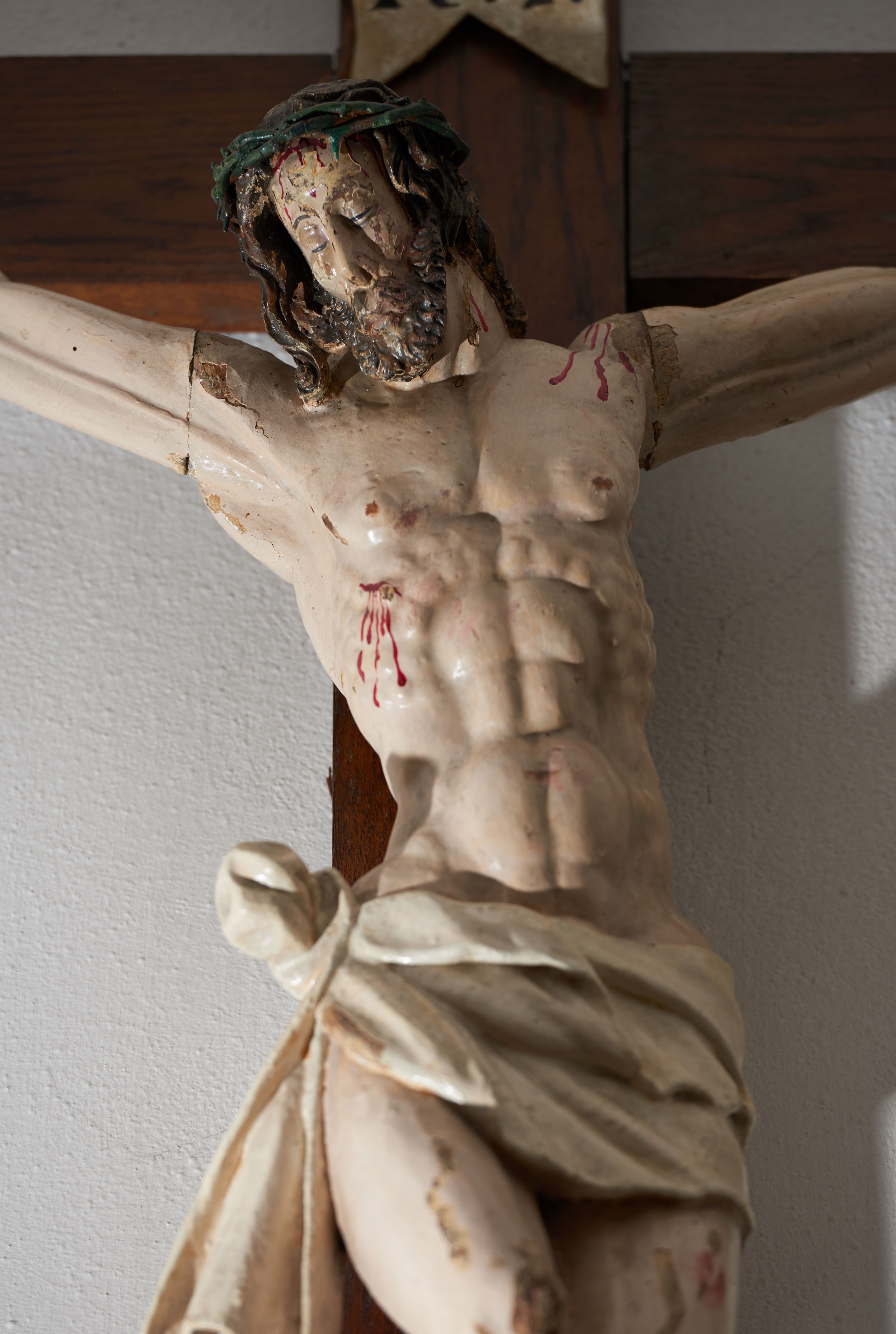Krucyfiks drewniany, figura pełnoplastyczna, w pełni polichromowana. Ciało Chrystusa muskularne z silnie zaznaczoną anatomią klatki piersiowej i widocznymi śladami męki. Ramiona tworzące zarys litery „V”, prawa dłoń złożona w gest błogosławieństwa, lewa z wyprostowanym palcem wskazującym; stopy przebite jednym gwoździem. Głowa zwrócona w trzech czwartych w prawo, pochylona lekko do dołu. Twarz szczupła, pociągła, oczy zamknięte. Na głowie cierniowa korona, spod której ciekną krople krwi. Włosy i zarost ciemnobrązowe, kręcone. Perizonium białe, związane w węzeł na prawym boku postaci. U szczytu pionowej belki krzyża banderola z inskrypcją: „I.N./R.I.”