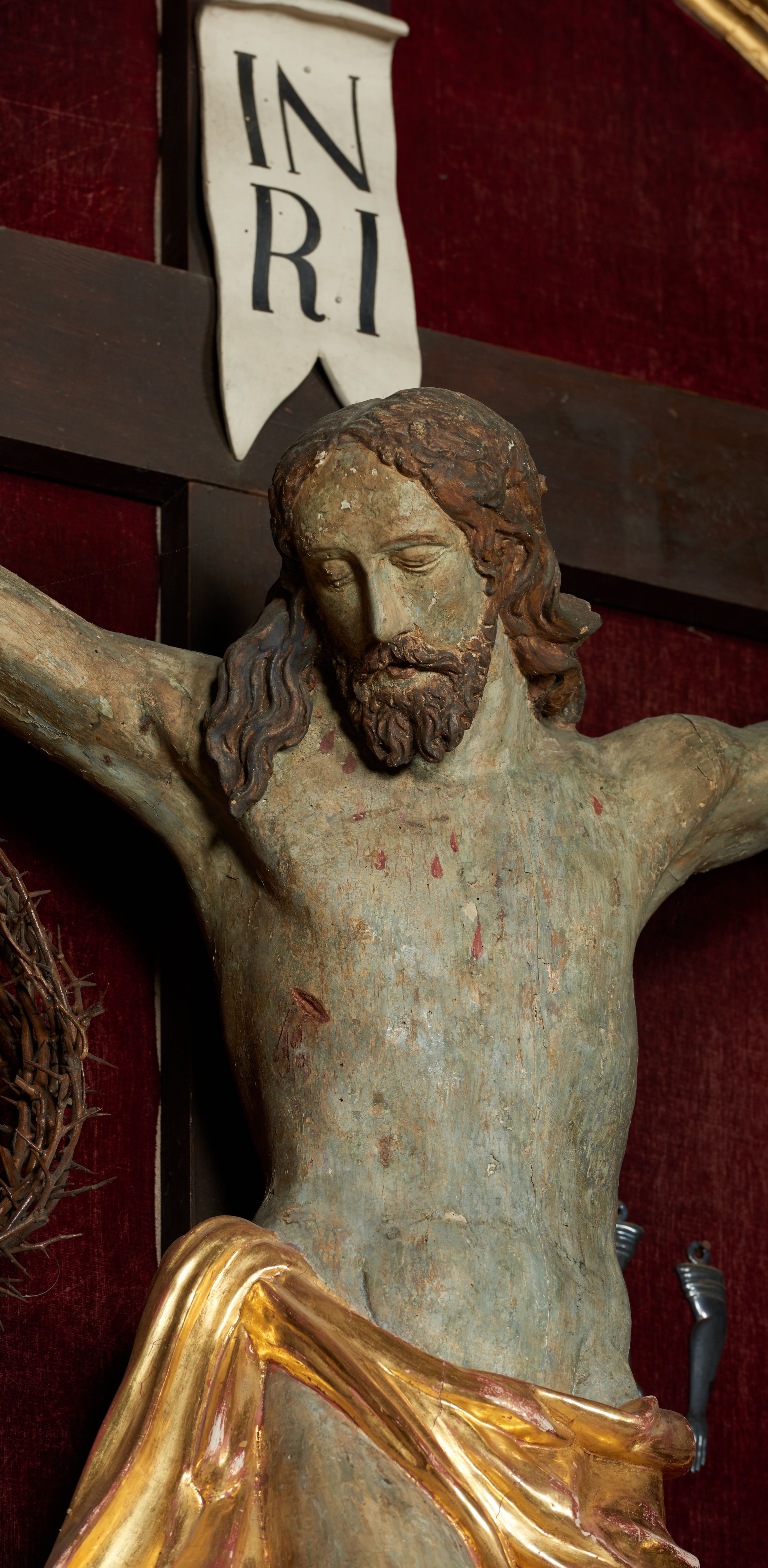 Rzeźba Chrystusa umarłego przybita do prostego krzyża trzema gwoździami. Ciało w lekkim zwisie o szeroko rozłożonych ramionach, układających się w delikatny łuk, głowa opadająca na prawy bark, nogi ugięte w kolanach, stopy skrzyżowane w układzie prawa na lewą. Chrystus ma pociągłą twarz, o migdałowatych, zamkniętych oczach, wąskim nosie i małych, rozchylonych ustach. Twarz okolona krótką, falowaną i rozdwajającą się w dwa pukle brodą oraz falowanymi włosami opadającymi na prawe ramię i kark. Ciało szczupłe, o delikatnym zarysowanym modelunku mięśni klatki piersiowej oraz ramion i nóg. Biodra przewiązane krótkim perizonium, zawiązanym na prawym boku. Ciało figury polichromowane naturalistycznie, włosy w kolorze brązowym, perizonium złocone. Na pionowej belce krzyża tabliczka z napisem „IN / RI”.