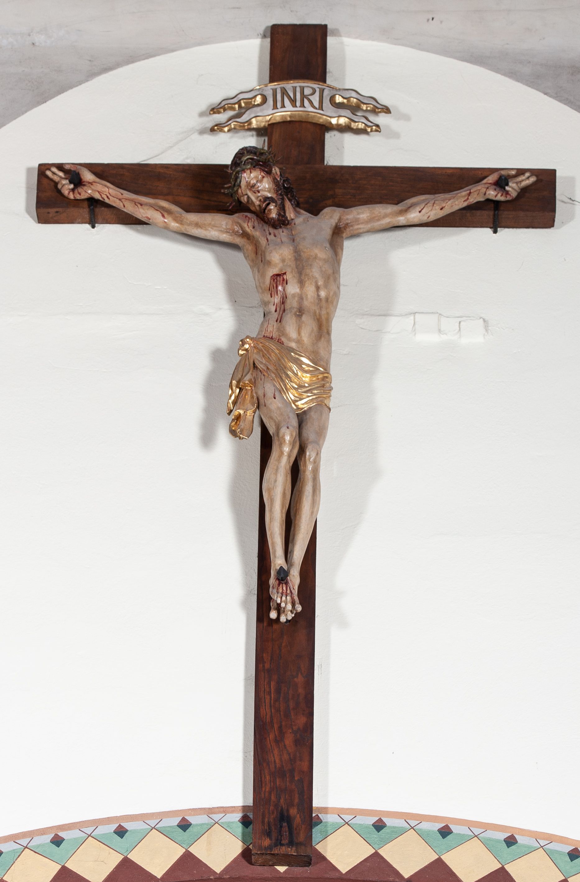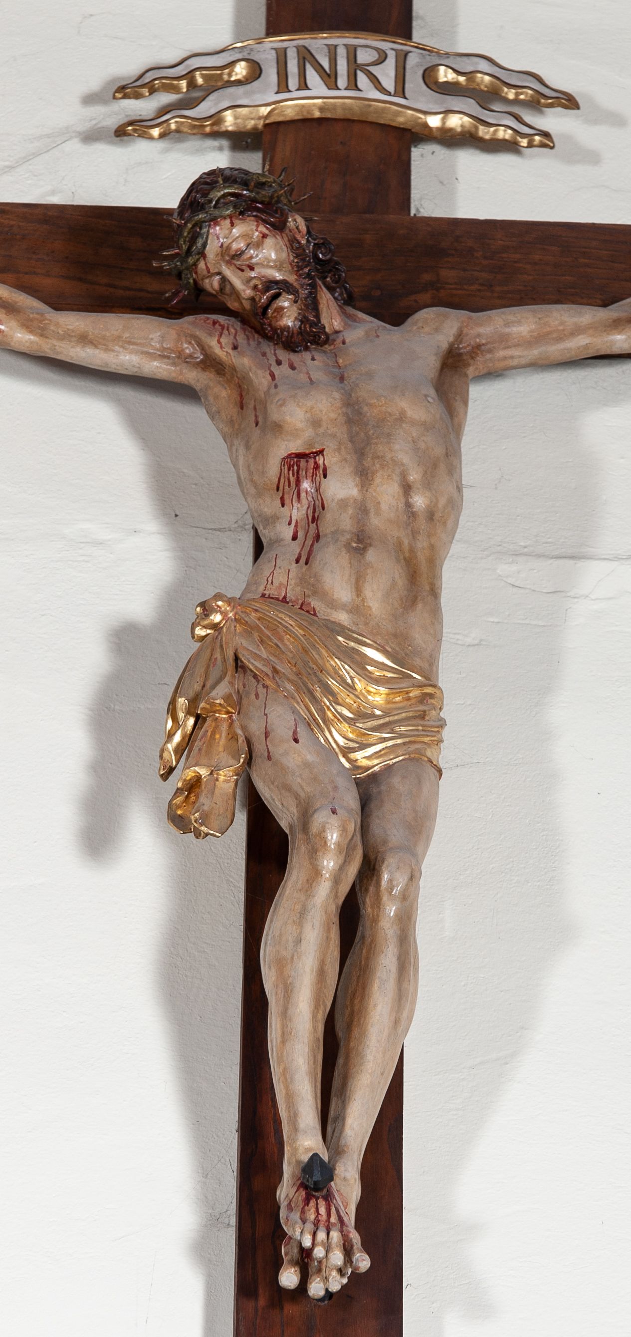 Chrystus rozpięty na krzyżu z ułożonymi niemal poziomo, szeroko rozłożonymi rękami, z ugiętą w kolanie prawą nogą, lewą niemal wyprostowaną, stopami założonymi prawa na lewą i przebitymi jednym gwoździem, z głową skłonioną na prawy bark. Twarz pociągła, z długim nosem i wpółotwartymi ustami, okolona zarostem i długimi spływającymi na kark włosami, spod których widać lewe ucho. Budowa anatomiczna i muskulatura silnie podkreślona naprężeniem ciała. Karnacja w odcieniu naturalnym z zaznaczonymi śladami męki. Rana w prawym boku. Wokół bioder perizonium zawiązane na prawym koku w węzeł, ze zwisem tkaniny przy prawym udzie. Nad głową Chrystusa poziomo ułożony titulus z końcami wyciętym w jaskółczy ogon, z literami INRI. Krzyż malowany na kolor brązowy, karnacja i włosy Chrystusa w kolorze naturalnym, perizonium srebrzone i złocone, titulus biały ze złoconymi krawędziami.