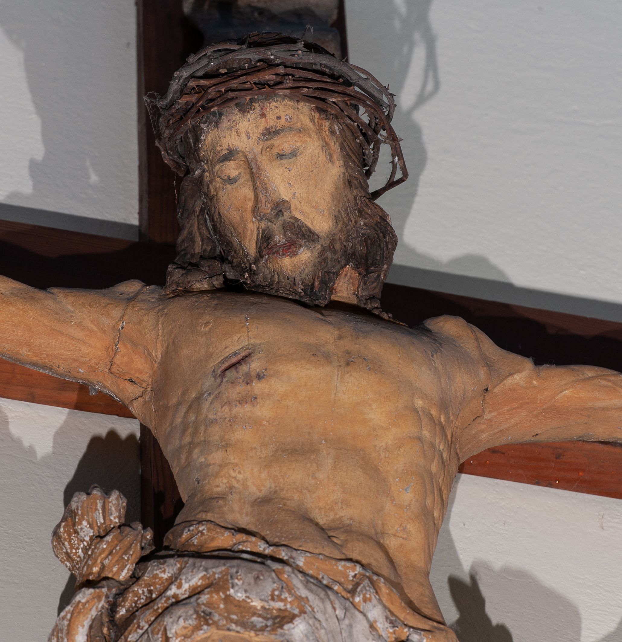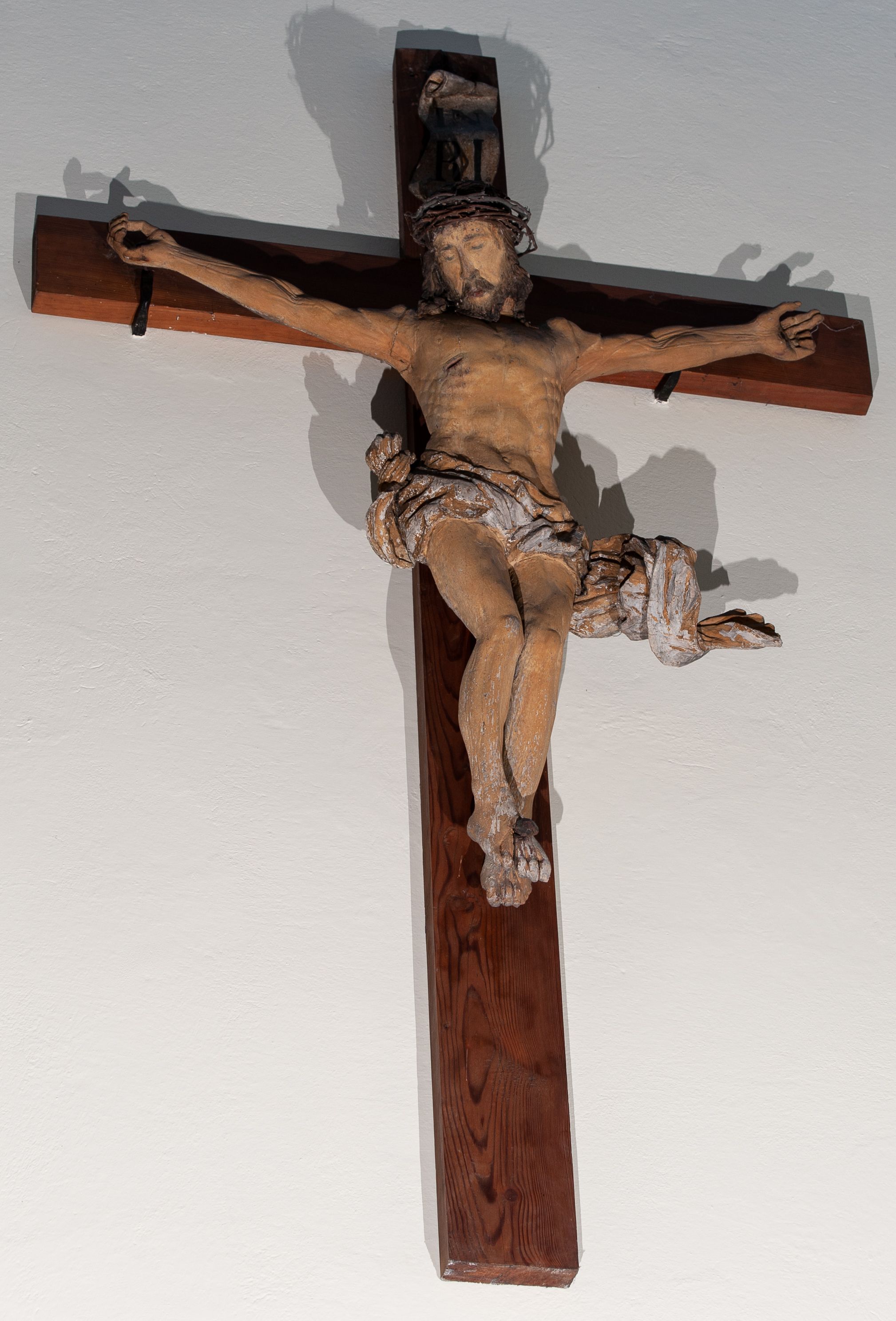 Chrystus rozpięty na krzyżu z ułożonymi niemal poziomo, szeroko rozłożonymi rękami, z nogami ugiętymi w kolanach, stopami założonymi prawa na lewą i przebitymi jednym gwoździem, z głową przechyloną na prawy bark. Twarz widoczna w trzech czwartych, owalna, z zamkniętymi oczami, okolona krótkim zarostem i spływającymi na barki włosami. Na włosy nałożona korona cierniowa. Budowa anatomiczna atletyczna, muskulatura silnie podkreślona. Karnacja ciemna, z raną w prawym boku. Wokół bioder silnie udrapowane perizonium, przy lewym udzie z powiewającym „na wietrze” skręconym spiralnie końcem tkaniny. Nad głową Chrystusa titulus z literami IN/RI. Krzyż w kolorze naturalnego drewna, karnacja i włosy Chrystusa w kolorze naturalnym, perizonium białe i złocone, titulus biały.