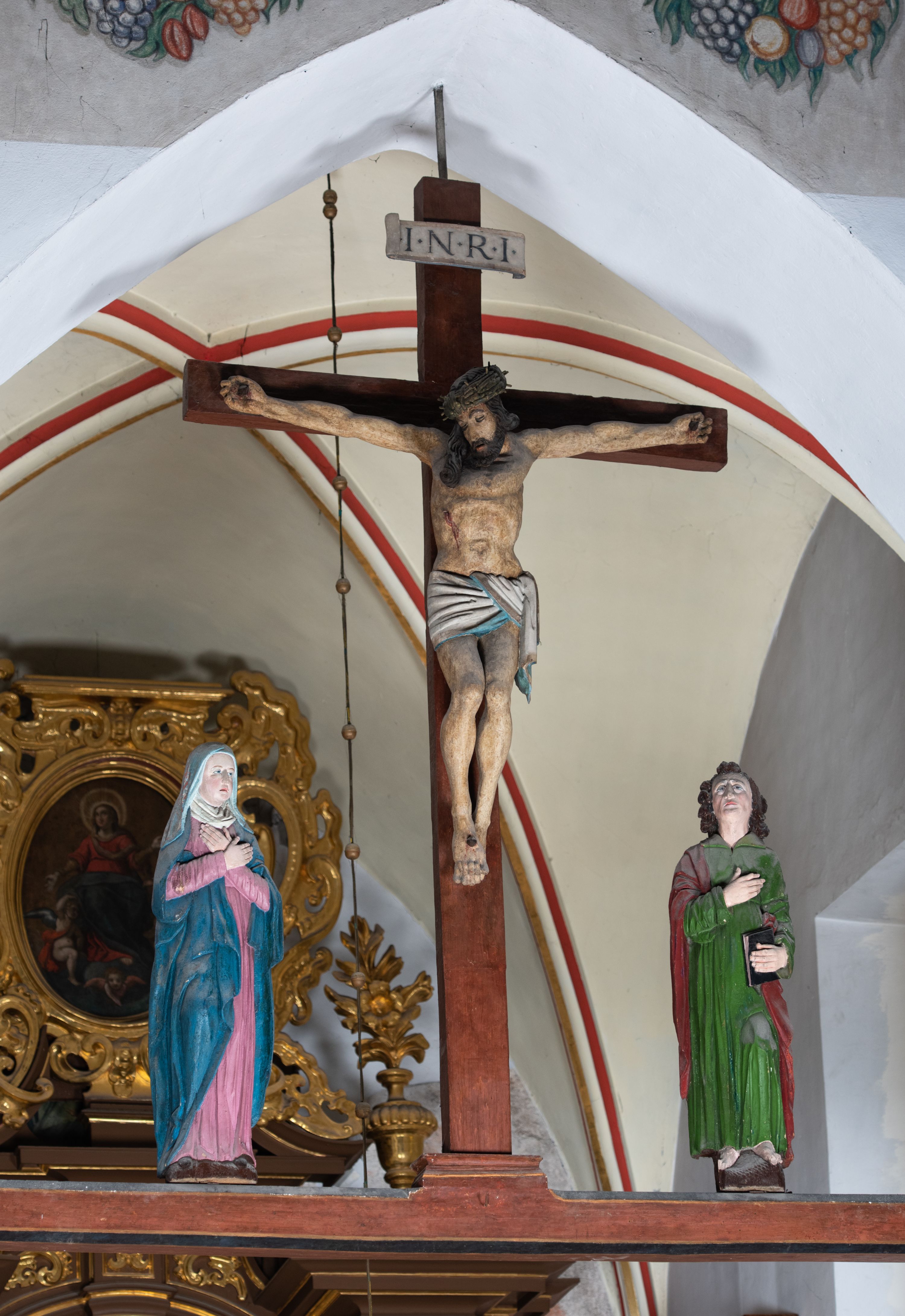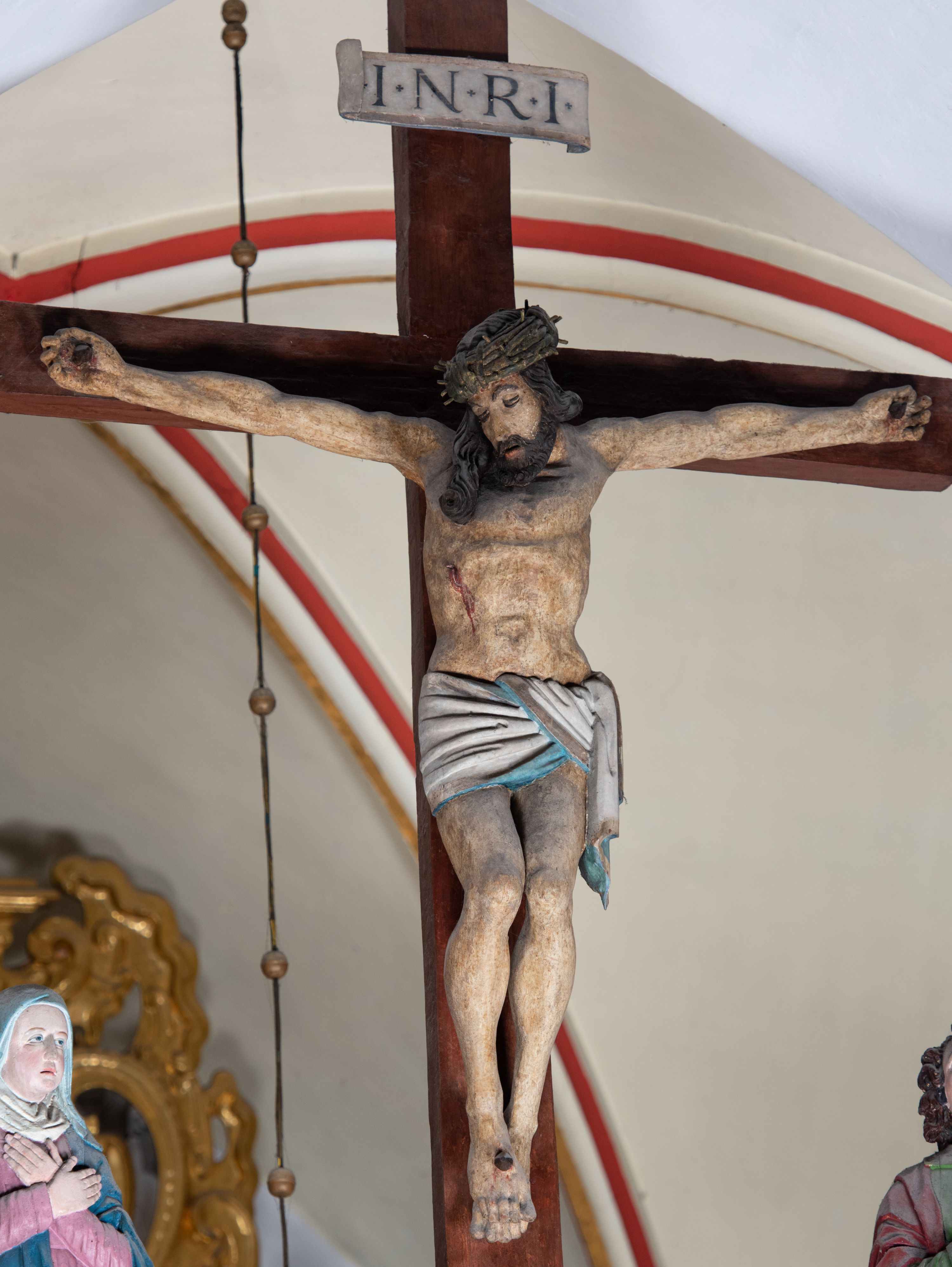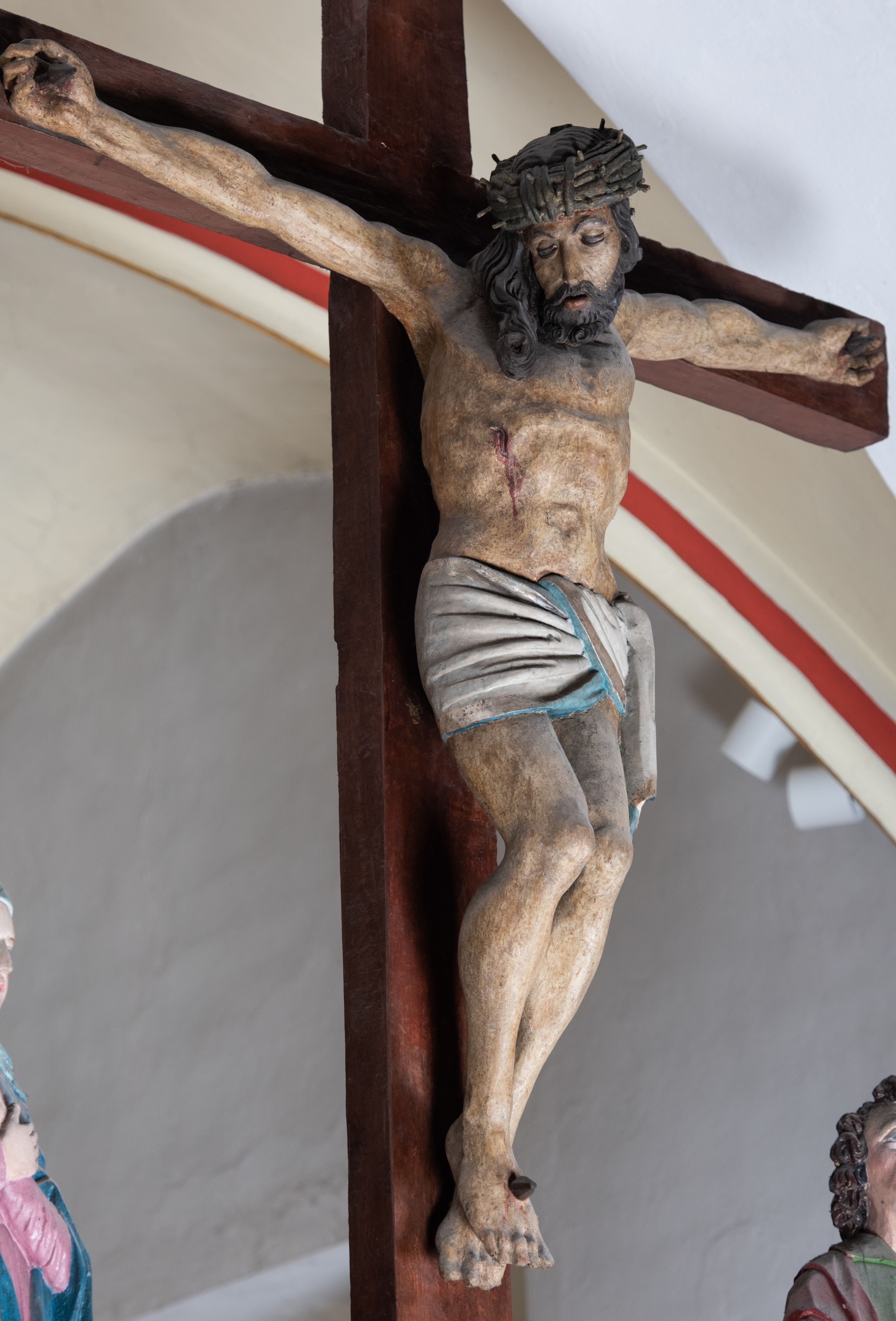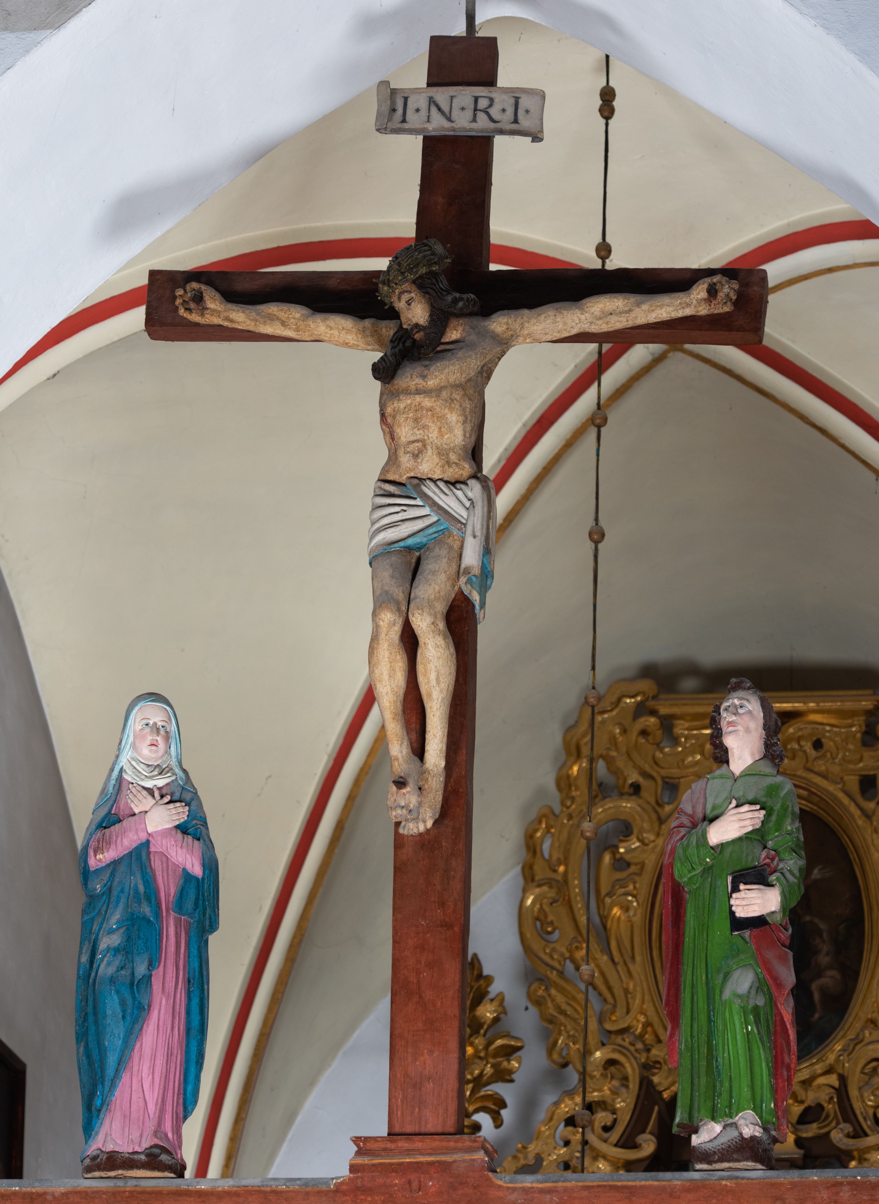 Rzeźba drewniana, pełnoplastyczna, polichromowana przedstawia Chrystusa Ukrzyżowanego i jest umieszczona na profilowanej belce tęczowej wspartej na kroksztynach. Chrystus jest ukazany frontalnie, w typie Christo morto, przybity do krzyża trzema gwoździami. Jego ramiona są silnie wyprężone, rozłożone horyzontalnie. Głowa w ciężkiej koronie cierniowej, opada na prawe ramię. Twarz ma owalną, oczy zamknięte, nos wydatny, usta lekko rozchylone. Twarz okala bujny, ciemny zarost. Długie ciemne włosy ułożone w pukle opadają po prawej stornie na ramie, po lewej na plecy Chrystusa. Korpus z zaznaczoną klatką piersiową, wyraźnym przewężeniem w talii, w prawym boku widoczna krwawiąca rana. Perizonium na biodrach jest krótkie, przewiązane, z końcem opadającym wzdłuż lewego boku. Nogi lekko ugięte w kolanach, stopy skrzyżowane, prawa założona na lewą, przebite jednym gwoździem. Na belce krzyża, nad głową Chrystusa titulus w kształcie banderoli. Ciało Chrystusa w kolorze naturalnym. Perizonium jest w kolorze perłowo-szarym, z błękitną podszewką.