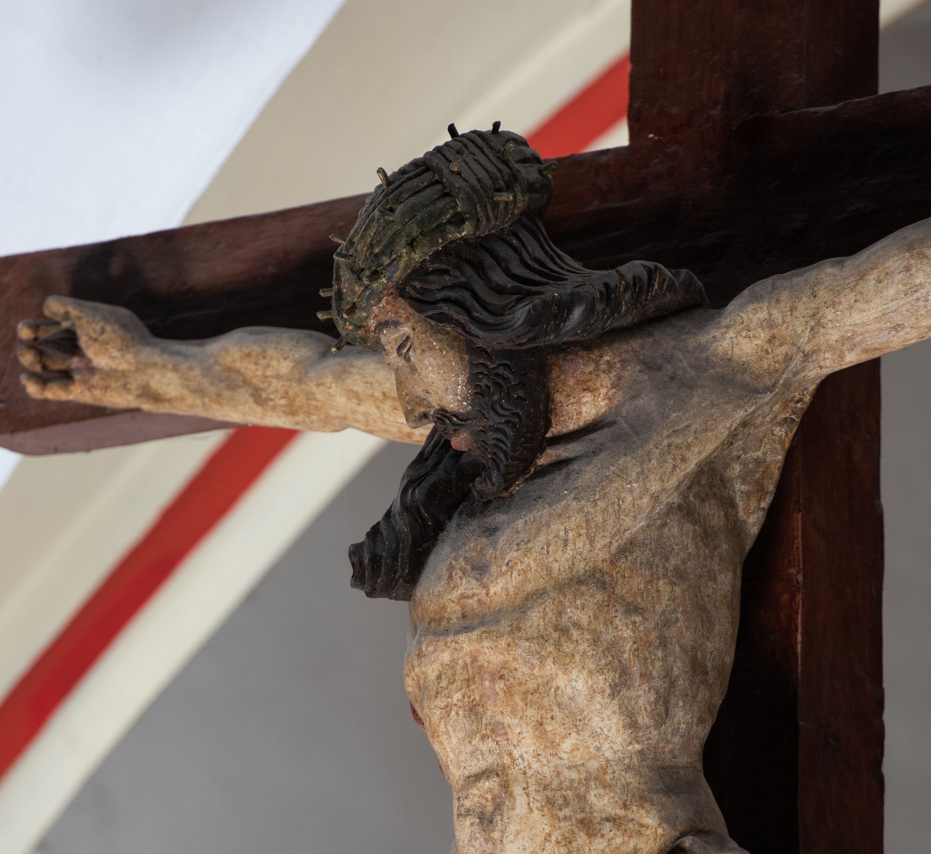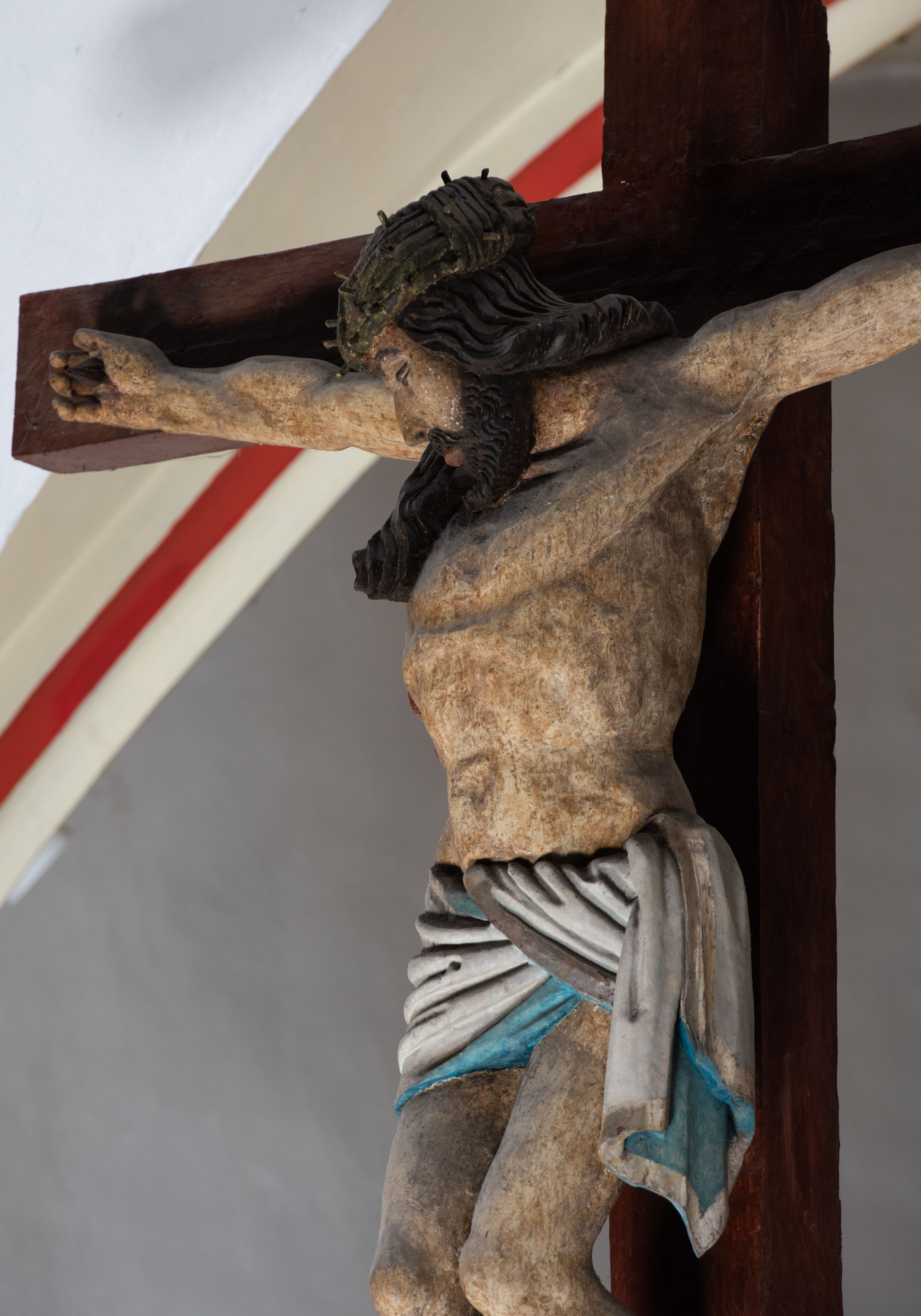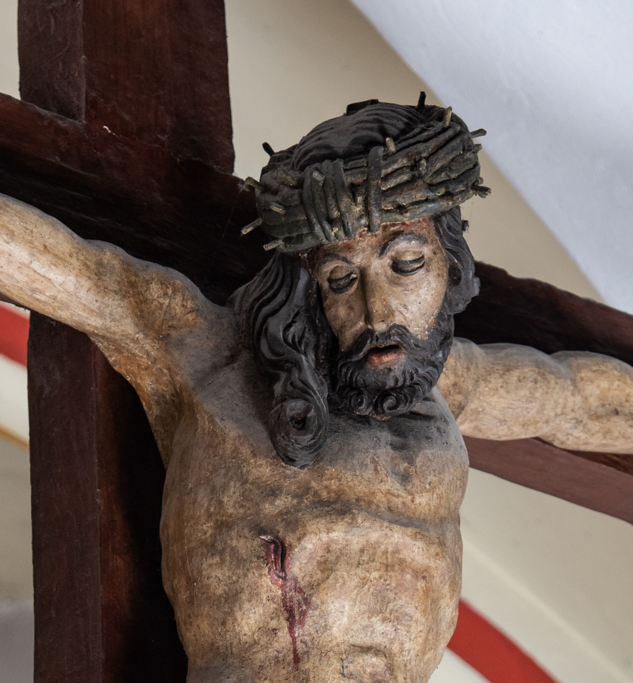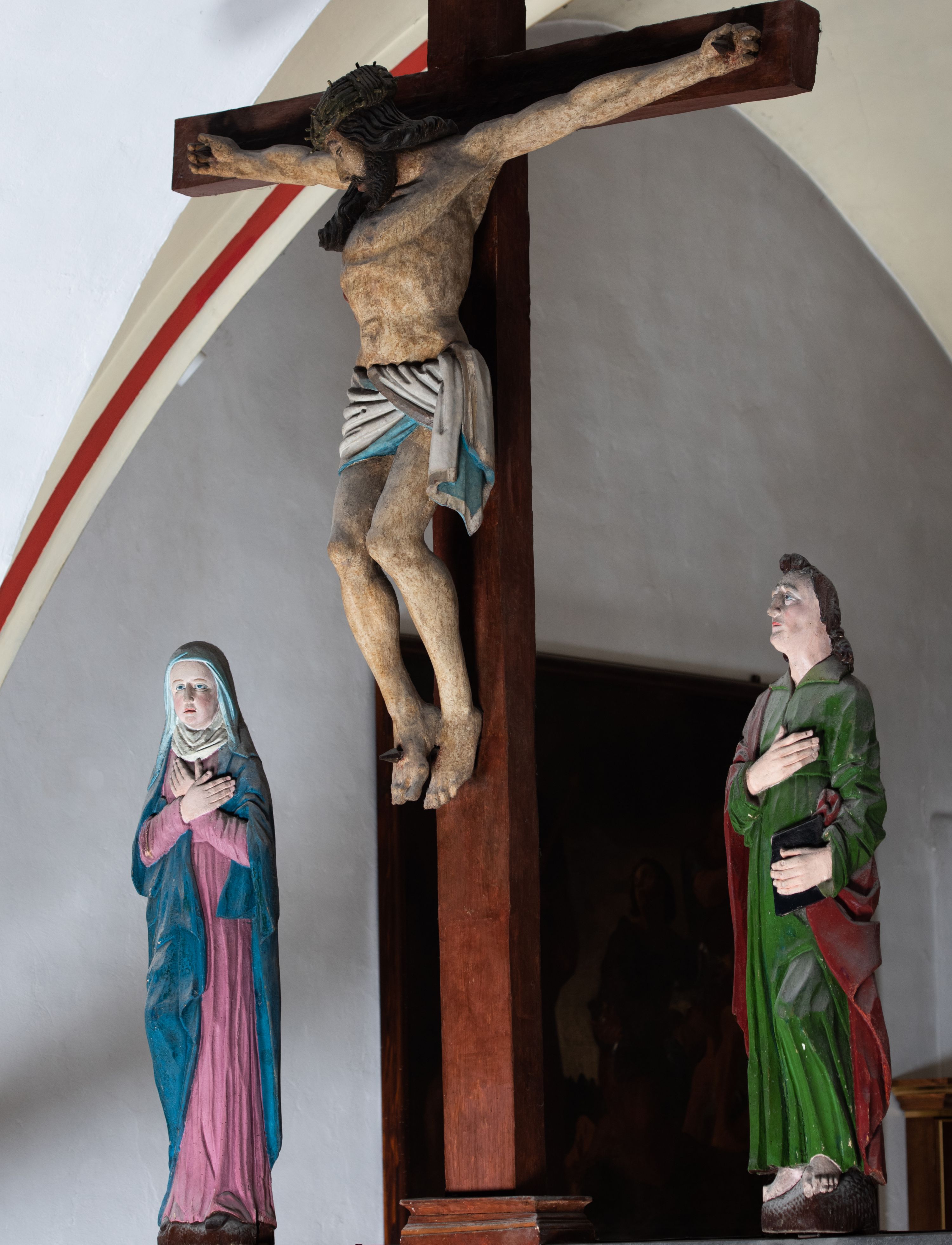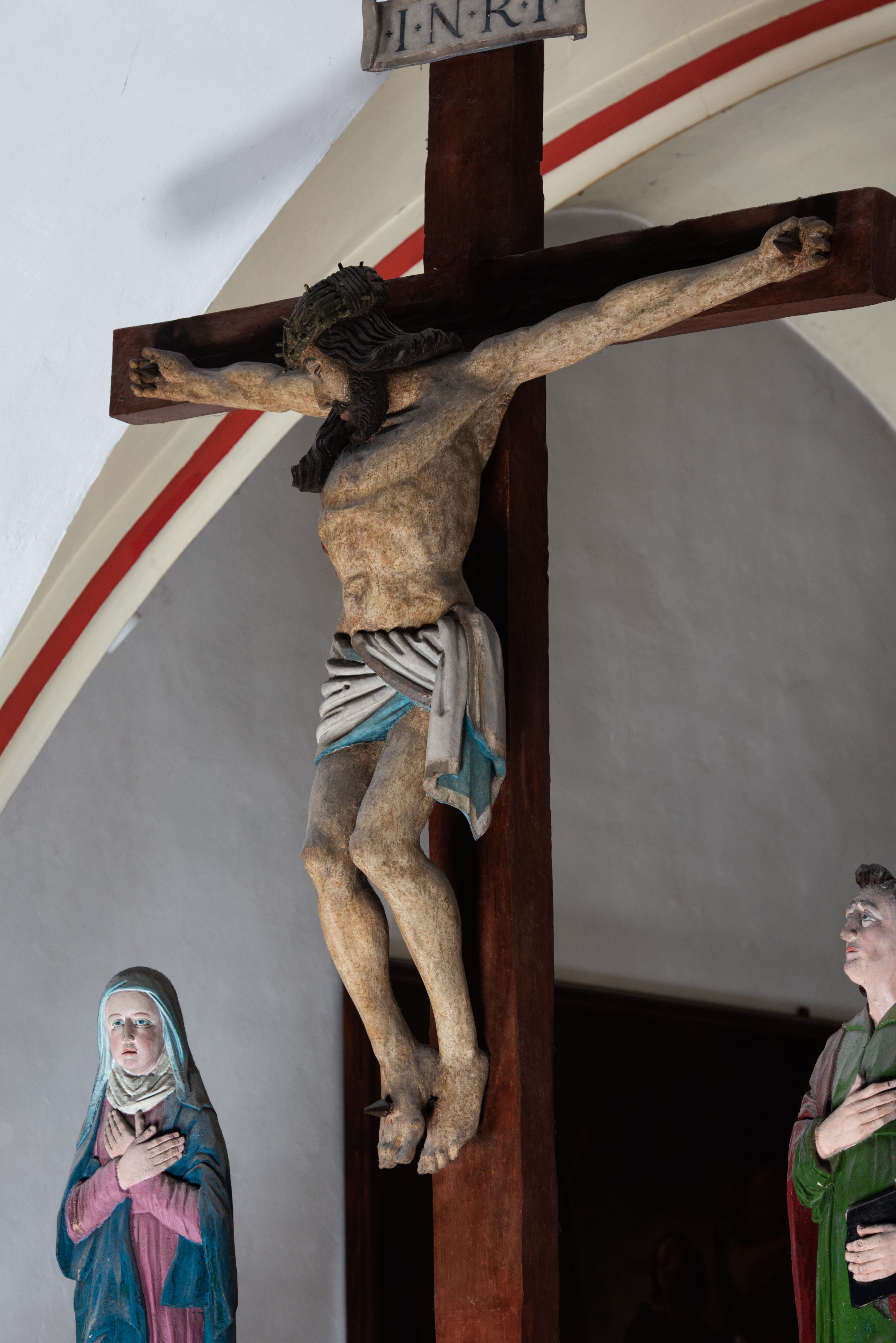 Rzeźba drewniana, pełnoplastyczna, polichromowana przedstawia Chrystusa Ukrzyżowanego i jest umieszczona na profilowanej belce tęczowej wspartej na kroksztynach. Chrystus jest ukazany frontalnie, w typie Christo morto, przybity do krzyża trzema gwoździami. Jego ramiona są silnie wyprężone, rozłożone horyzontalnie. Głowa w ciężkiej koronie cierniowej, opada na prawe ramię. Twarz ma owalną, oczy zamknięte, nos wydatny, usta lekko rozchylone. Twarz okala bujny, ciemny zarost. Długie ciemne włosy ułożone w pukle opadają po prawej stornie na ramie, po lewej na plecy Chrystusa. Korpus z zaznaczoną klatką piersiową, wyraźnym przewężeniem w talii, w prawym boku widoczna krwawiąca rana. Perizonium na biodrach jest krótkie, przewiązane, z końcem opadającym wzdłuż lewego boku. Nogi lekko ugięte w kolanach, stopy skrzyżowane, prawa założona na lewą, przebite jednym gwoździem. Na belce krzyża, nad głową Chrystusa titulus w kształcie banderoli. Ciało Chrystusa w kolorze naturalnym. Perizonium jest w kolorze perłowo-szarym, z błękitną podszewką.