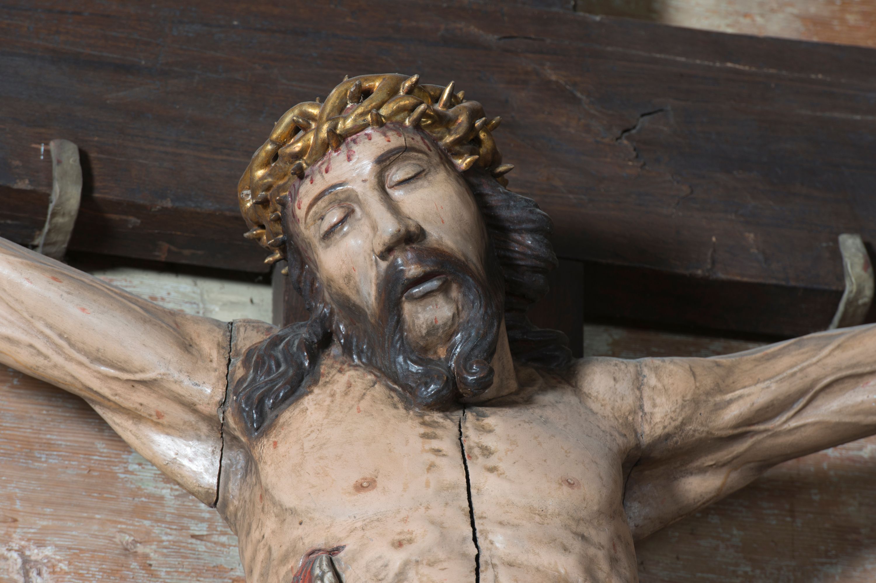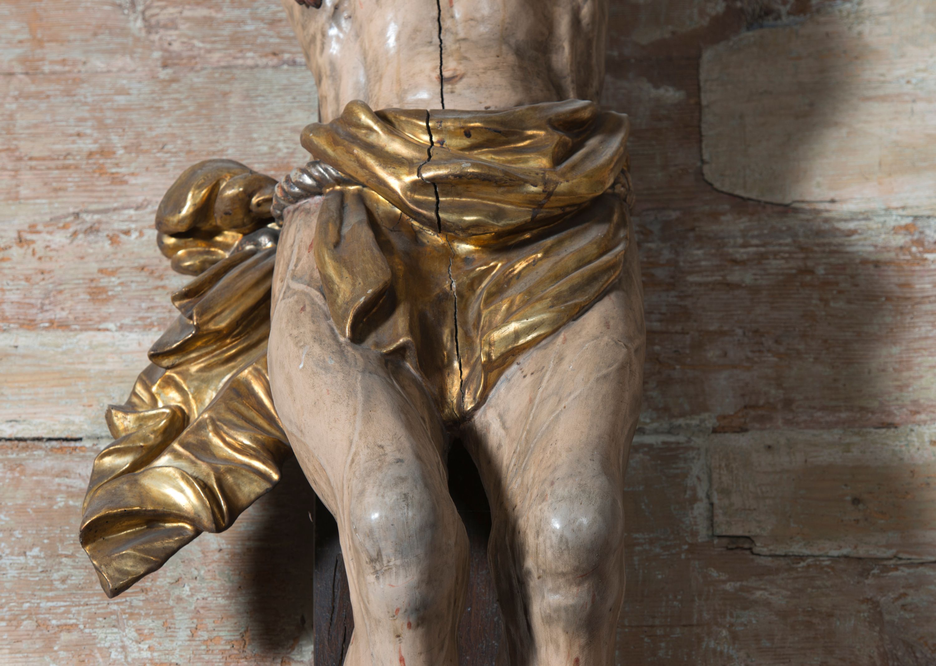 Krucyfiks z drugiej połowy XVII wieku o prawie naturalnych rozmiarach reprezentuje liczną grupę rzeźbionych przedstawień Ukrzyżowanego Chrystusa umieszczanego na belkach tęczowych lub np. w refektarzach zakonnych.