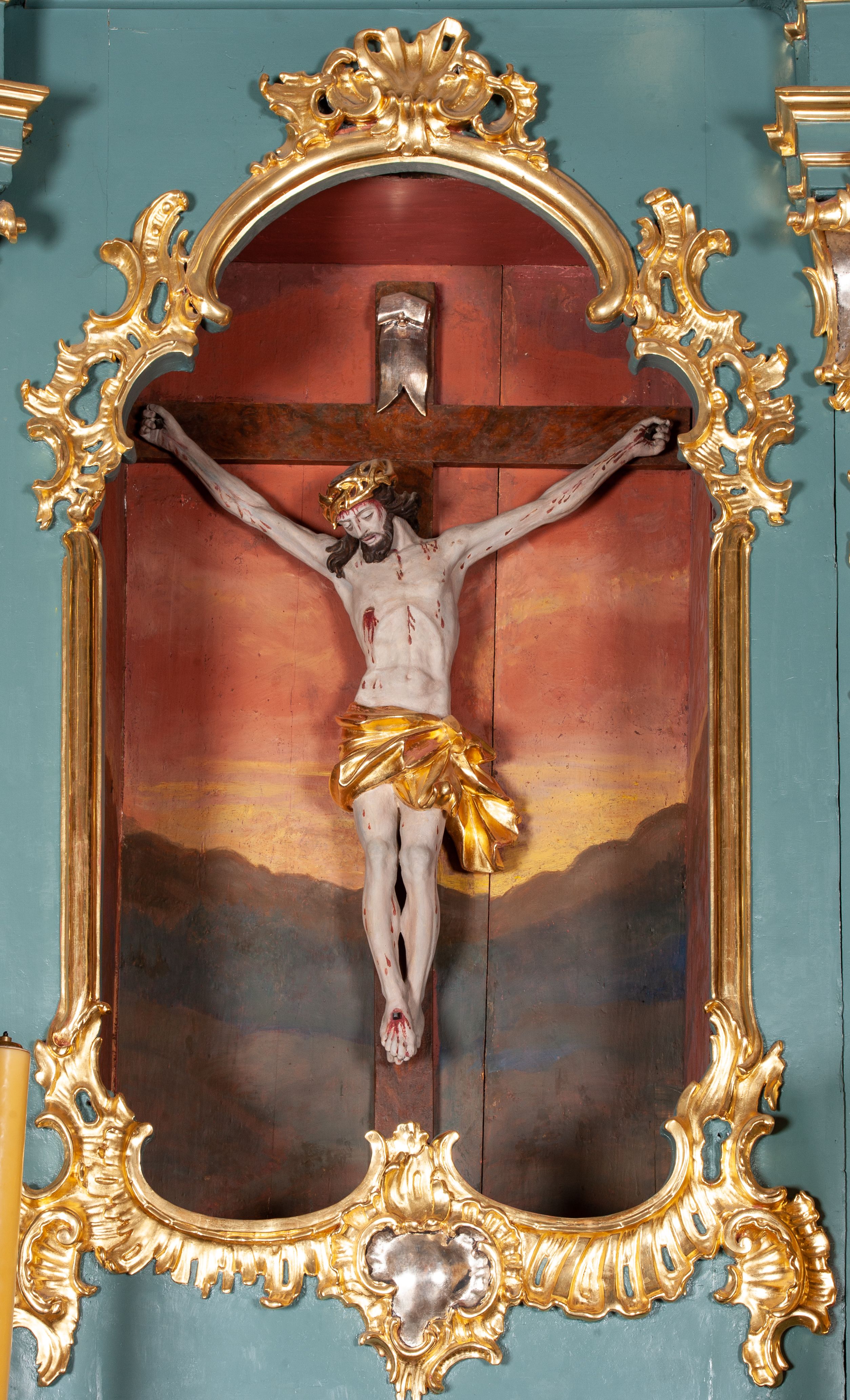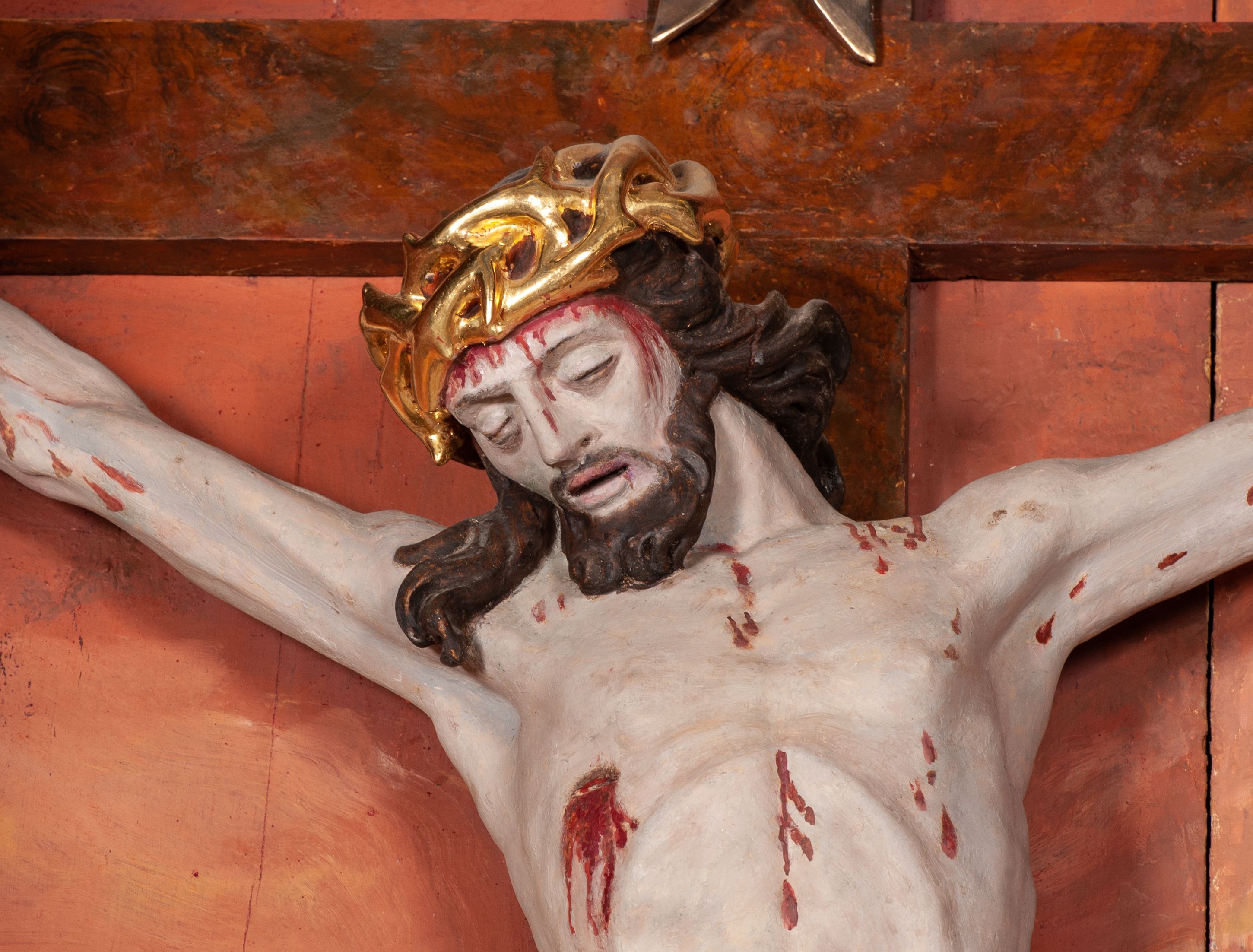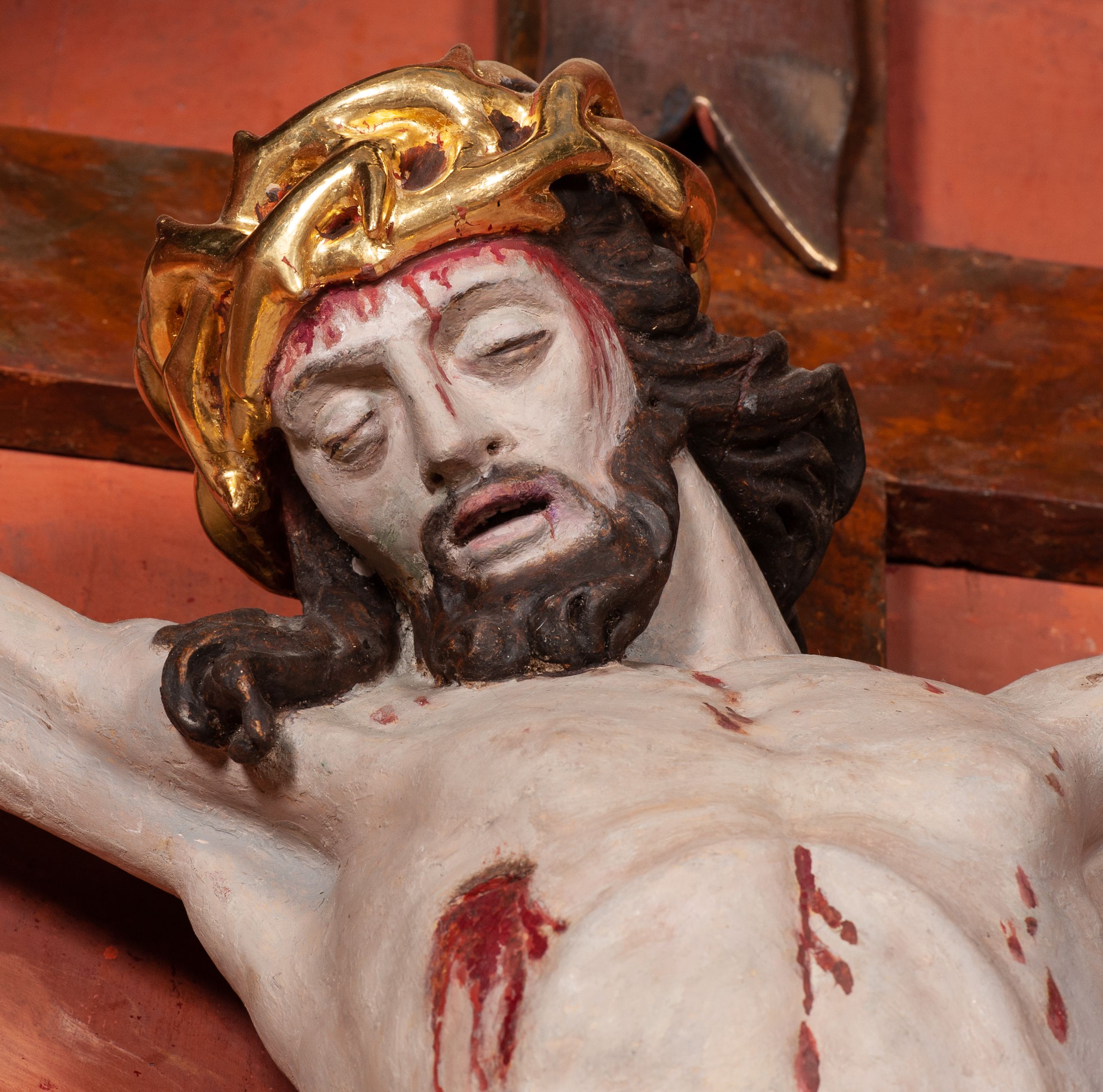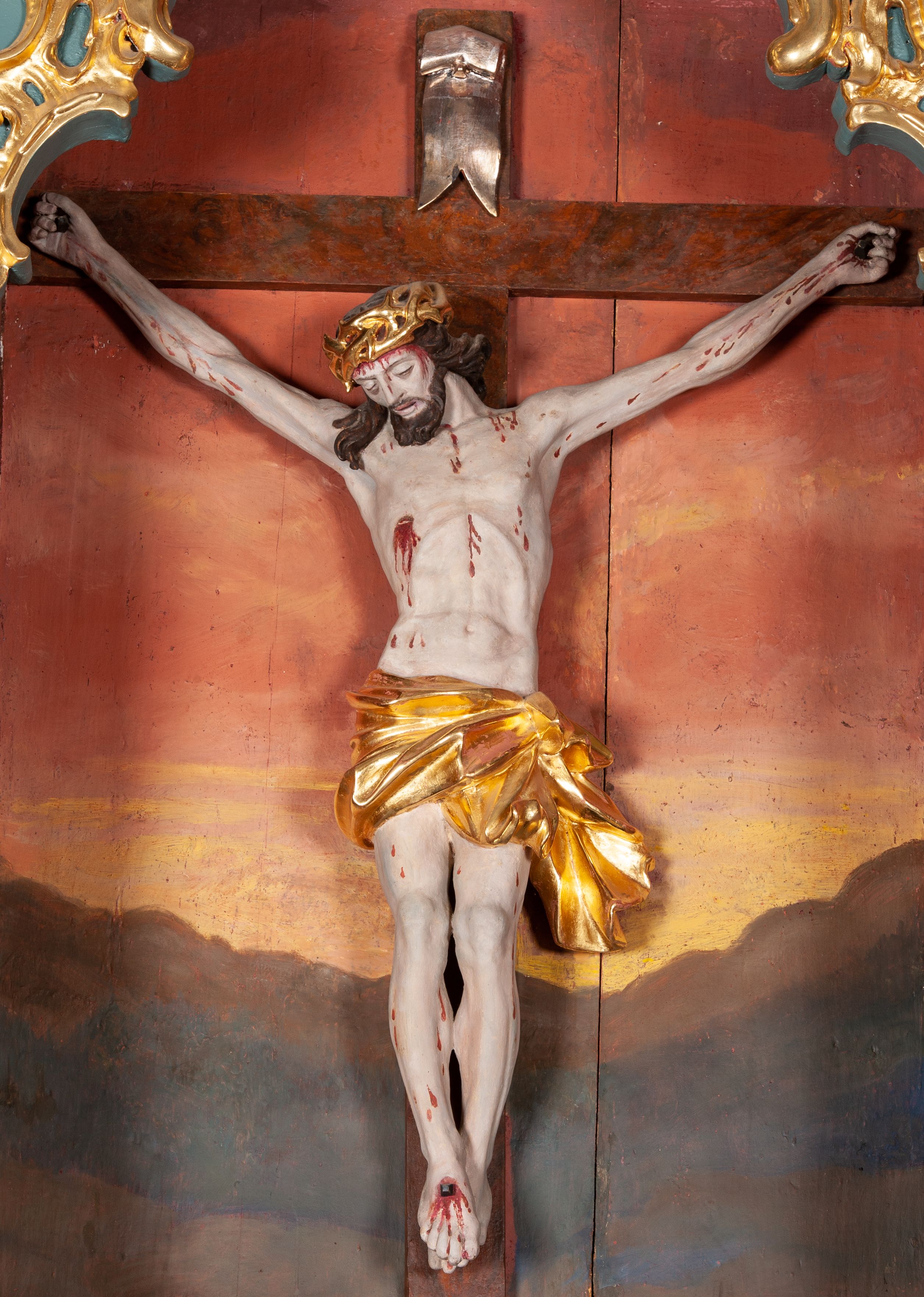 Figura Chrystusa ścięta z tyłu, przybita do belki krzyża trzema gwoździami, w typie Christo morte. Ciało w głębokim zwisie, ramiona ułożone w kształt litery „Y”. Głowa opadająca na klatkę piersiową, przechylona na prawe ramię. Twarz szeroka, okolona krótką brodą i włosami opadającymi na prawe ramię. Oczy zamknięte, nos niewielki, prosty, usta rozchylone. Na głowie korona cierniowa. Sylwetka ciała smukła o wyraźnie zaznaczonej muskulaturze, zwłaszcza w partii klatki piersiowej i ramion. Dłonie o zaciśniętych palcach. Wokół bioder perizonium układające się w głębokie poprzeczne fałdy, z rozwianym zwisem przy lewym boku. Stopy skrzyżowane, prawa założona na lewą. Karnacja ciała w jasnoszarym odcieniu z zaznaczonymi czerwoną farbą śladami męki. Włosy i zarost ciemnobrązowe, perizonium i korona cierniowa złote. Nad głową srebrny titulus w formie banderoli.