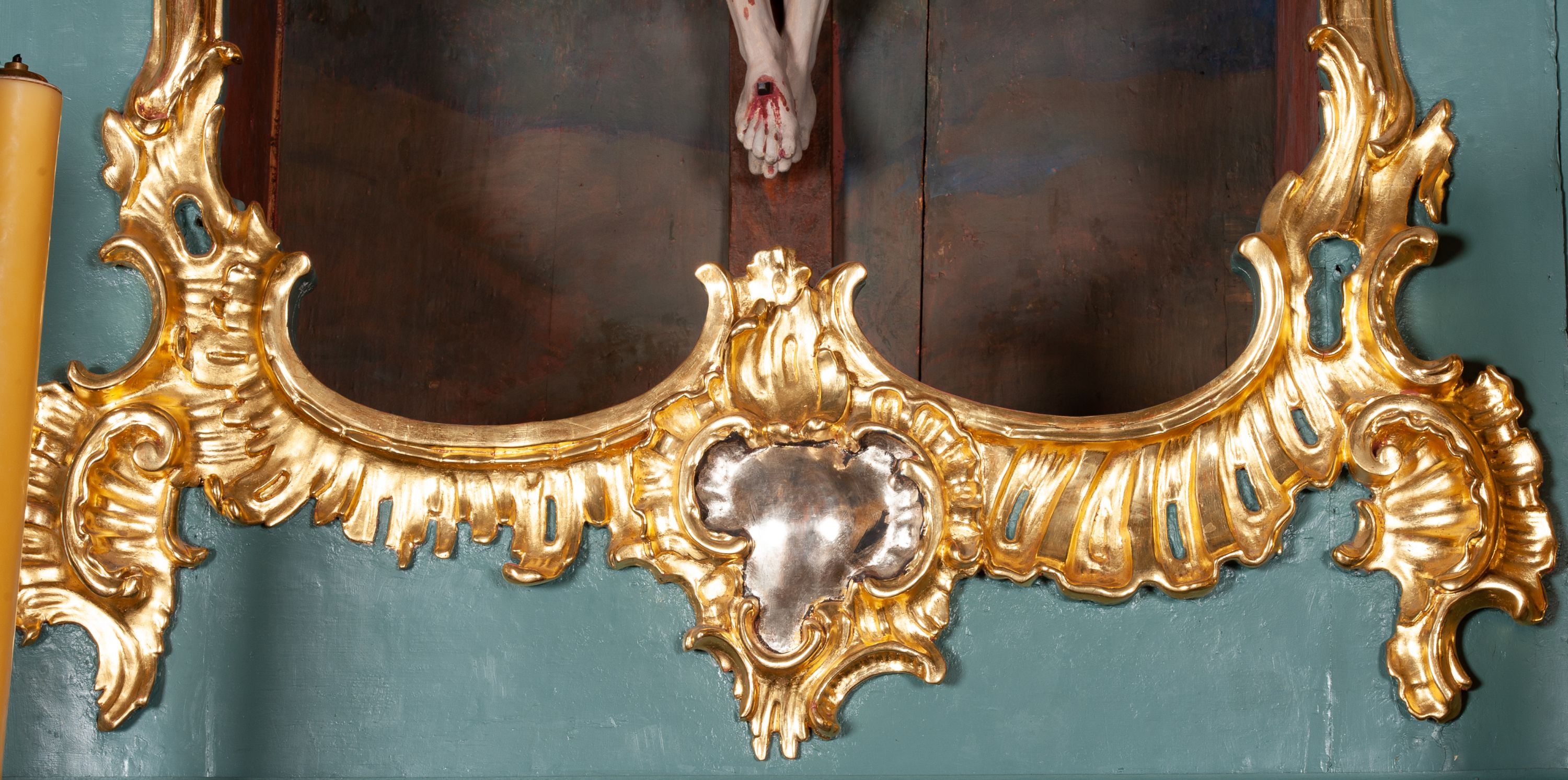 W inwentarzu z 1754 roku, w części, gdzie opisano wyposażenie ówczesnej świątyni w Podstolicach, wymienione są 4 ołtarze, w tym 3 boczne – jeden z cudownym wizerunkiem Boskiej Łaskawej, drugi („lewy”) poświęcony Matce Boskiej Niepokalanie Poczętej „sprawiony do kościoła w pierwszej połowie XVIII wieku” oraz trzeci („prawy”): „na mensie tego był postawiony drewniany rzeźbiony krucyfiks”. W 1846 roku jeden z ołtarzy bocznych został pozłocony sumptem Jakuba Burmera z Podstolic. Dwa z wymienionych retabulów zostały przeniesione do nowo wzniesionej w 1870 roku świątyni. Można przypuszczać, iż omawiane retabulum w powyższym ołtarzu zostało opisane, jako prawe, zwierające wizerunek Jezusa Ukrzyżowanego.