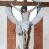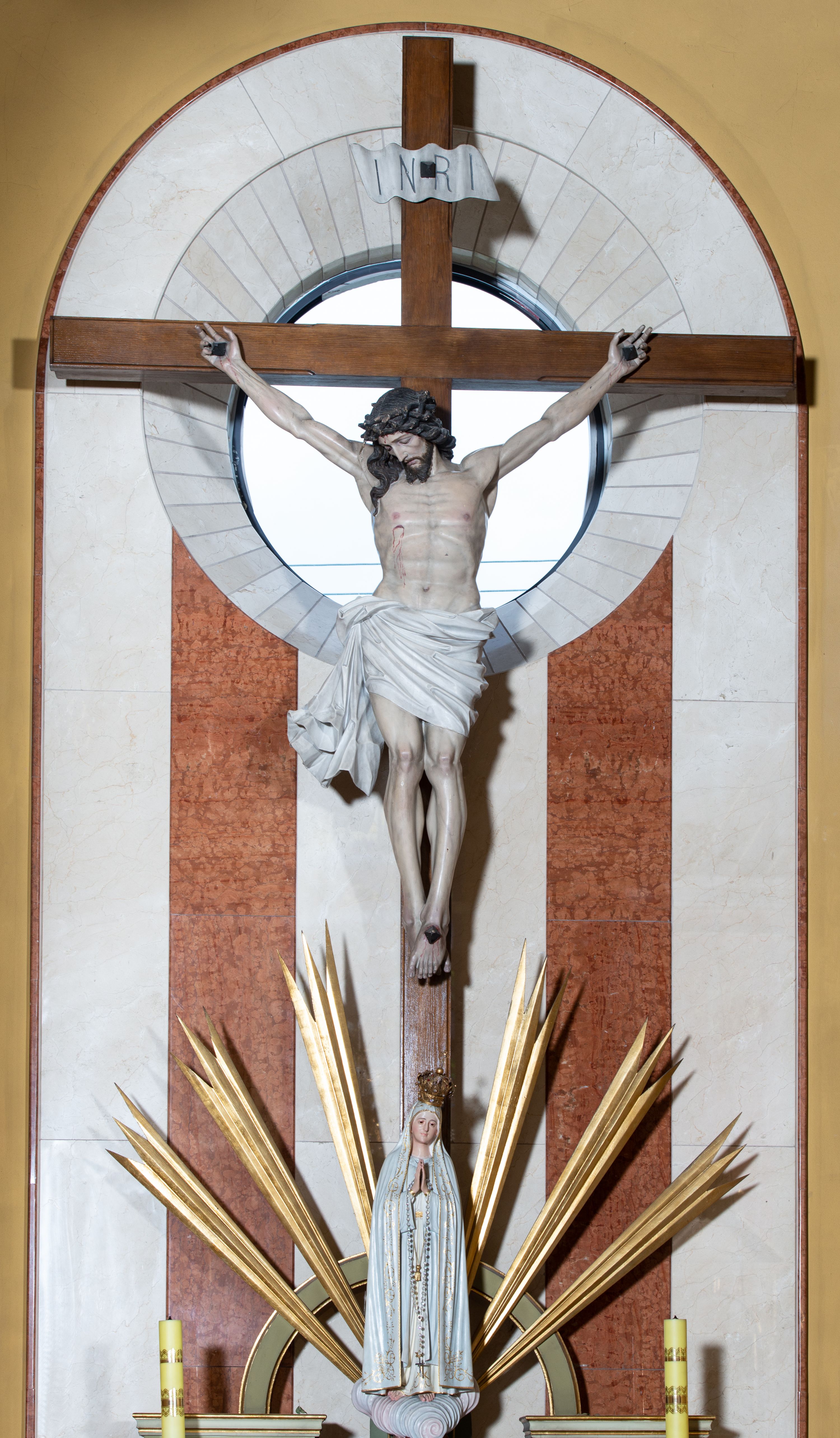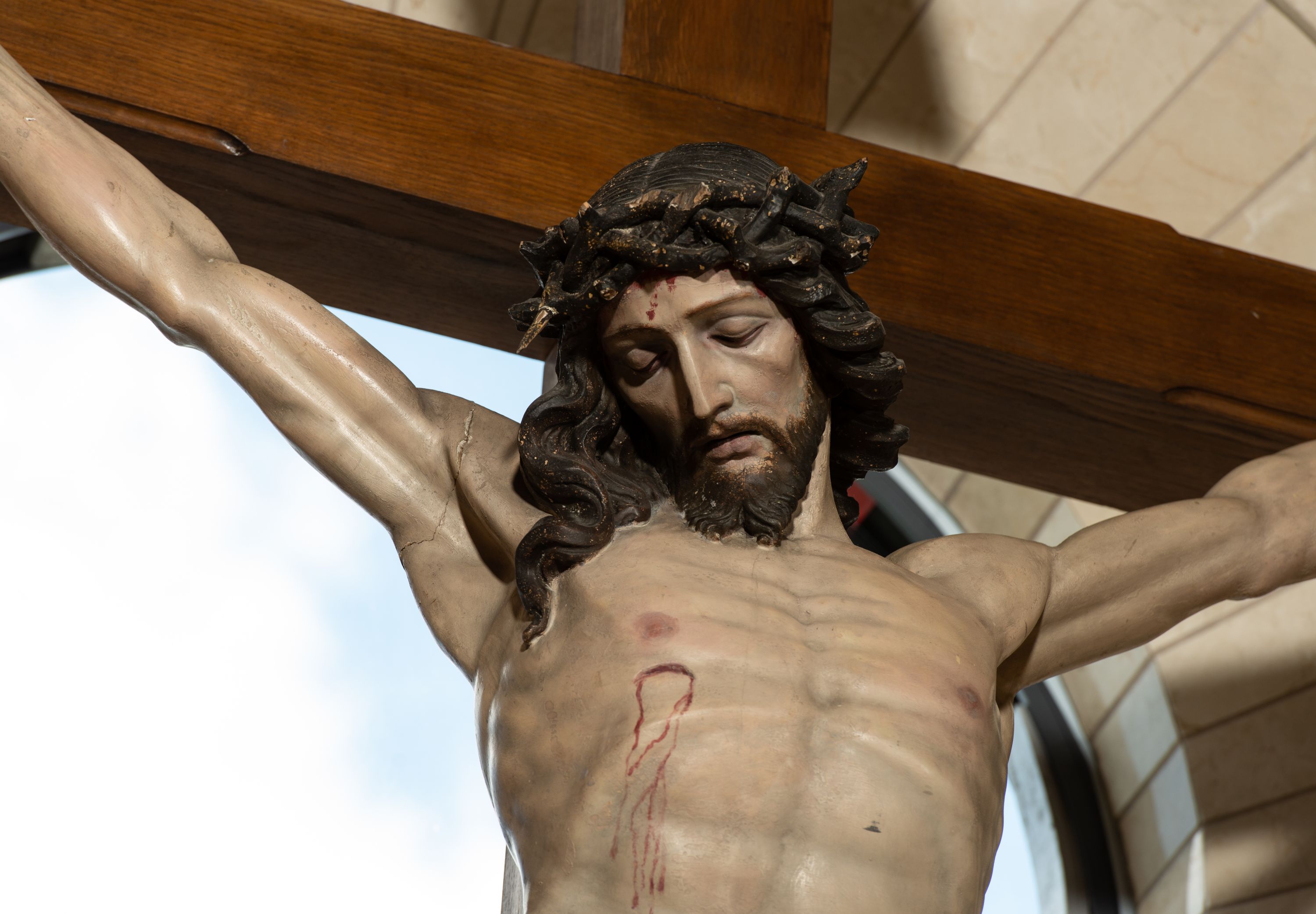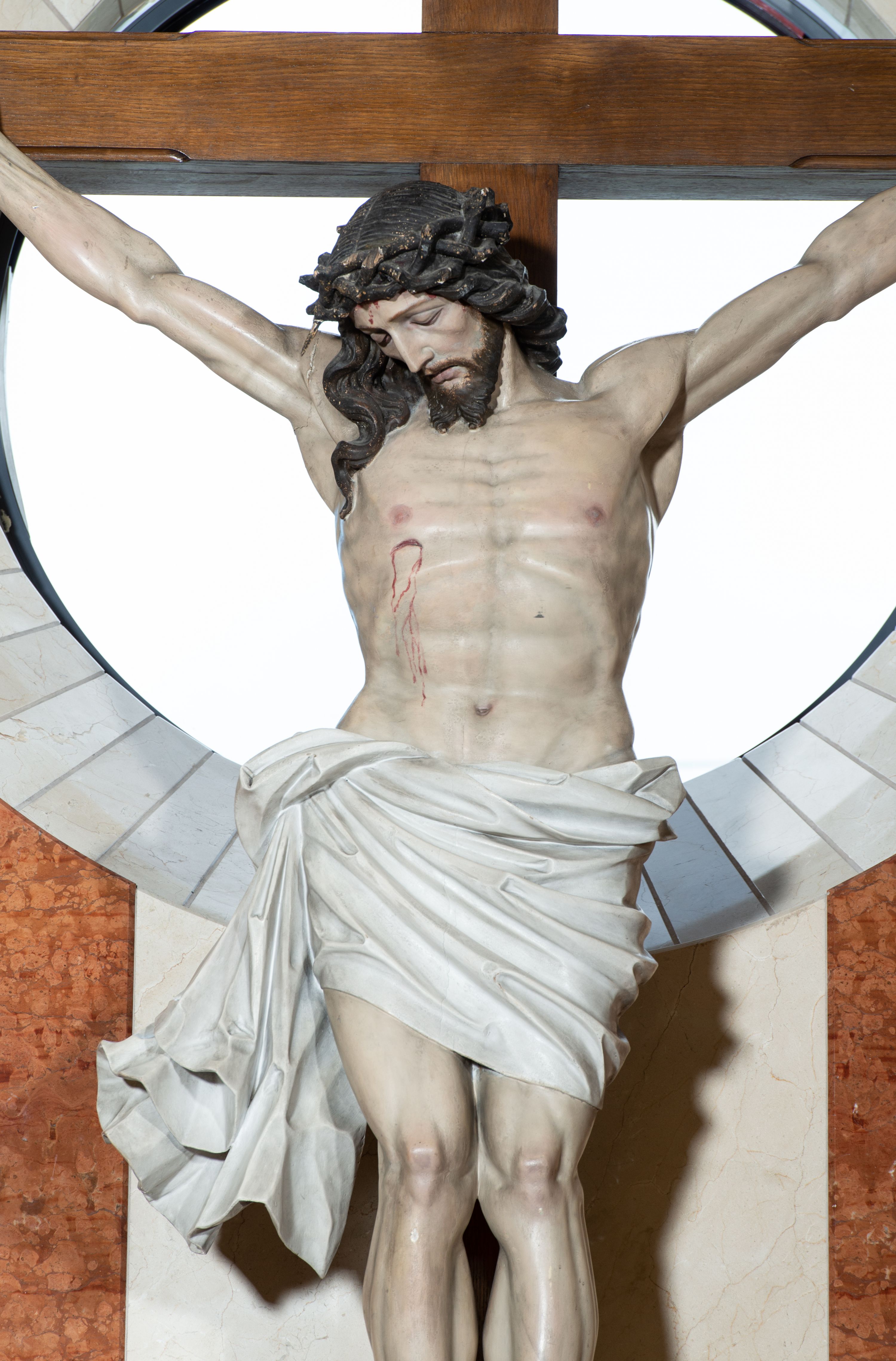 Na krzyżu z jasnego drewna zawieszono polichromowaną figurę martwego Chrystusa o szeroko rozpostartych ramionach. Ciało Zbawiciela do krzyża jest przymocowane za pomocą trzech gwoździ. On sam został ukazany jako martwy z zamkniętymi oczami i nieznacznie słaniającą się głową. Jego postać jest nieznacznie wysmuklona z naturalnie potraktowaną muskulaturą korpusu, zaznaczononą raną prawego boku. Nogi są lekko zwrółcone do osi środkowej, z założeniem prawej stopy na lewą. Twarz Zbawiciela jest mocno wychudła i pociągła. Charakteryzują ją zamknięte oczy, wydatny nos i usta. Otaczają ją brązowe włosy opadające puklami na kark oraz na prawe ramię oraz brązowy zarost. Chrystus ma na głowie cierniową koronę, spod której na czoło spływają nieznaczne krople krwi. Biodra Zbawiciela przepasane są szarobiałym perizonium w formie zawoju z rozwianym festonem przy prawym boku. Tkaninę drapują ostre załamania. Ponad głową Chrystusa na pionowej belce krzyża zawieszono rozwiany titulus z napisem INRI przytwierdzone do krzyża wbitym na środku gwoździem. Całą figurę pokrywa naturalistyczna polichromia.