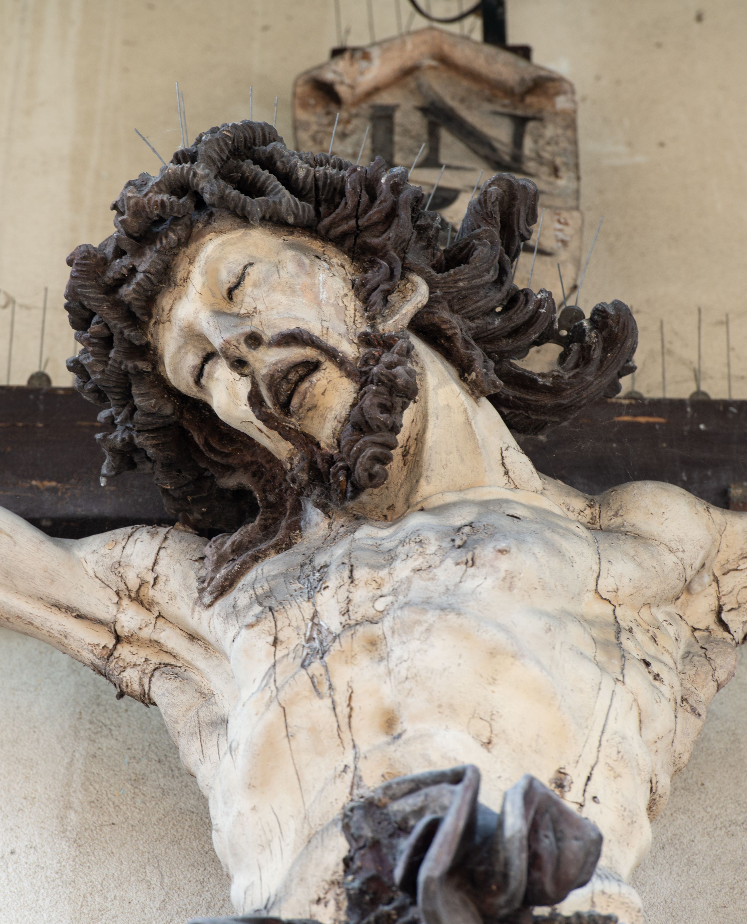 Figura Chrystusa umarłego została przybita do drewnianego krzyża za pomocą trzech gwoździ. Ciało Zbawiciela ujęto w lekkim zwisie o szeroko rozłożonych ramionach. Jego głowa bezwładnie opada na prawy bark, nogi zostały ugięte w kolanach, stopy skrzyżowane w układzie prawa na lewą. Twarz Jezusa jest szczupła o zamkniętych oczach, prostym nosie i otwartych ustach. Okala ją krótka, silnie kręcona broda oraz długie, skręcające się w pukle i rozwiane włosy. Na głowie widoczna jest korona cierniowa. Ciało Chrystusa jest wychudzone z silnie podkreślonymi wklęsło-wypukłymi mięśniami i zaznaczonymi żebrami. Perizonium widoczne na biodrach zostało zawieszone na podwójnym sznurze odsłaniającym lewe biodro z silnie drapowaną i ekspresyjnie rozwianą tkaniną. Ciało zostało polichromowane w kolorze naturalnym, włosy i perizonium są brązowe.