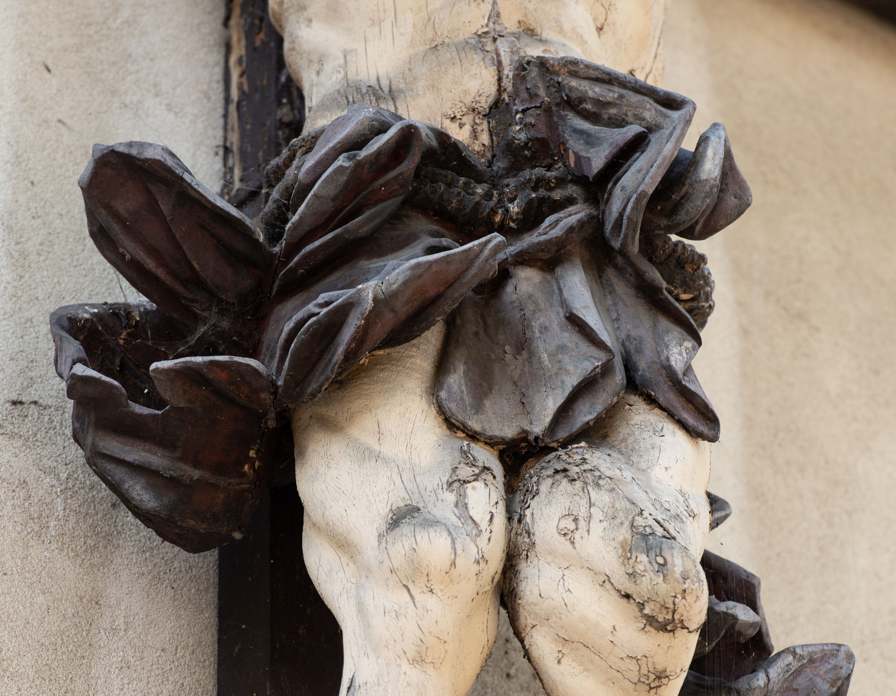 Zły. Rzeźba Ukrzyżowanego jest mocno spękana i zabrudzona. Widoczne są ubytki i spękania warstwy gruntu i warstwy malarskiej.