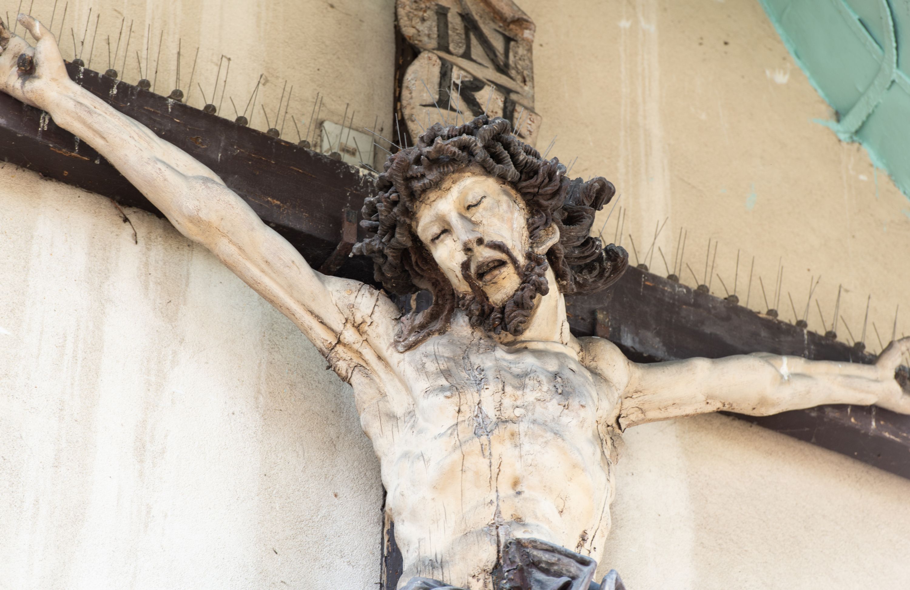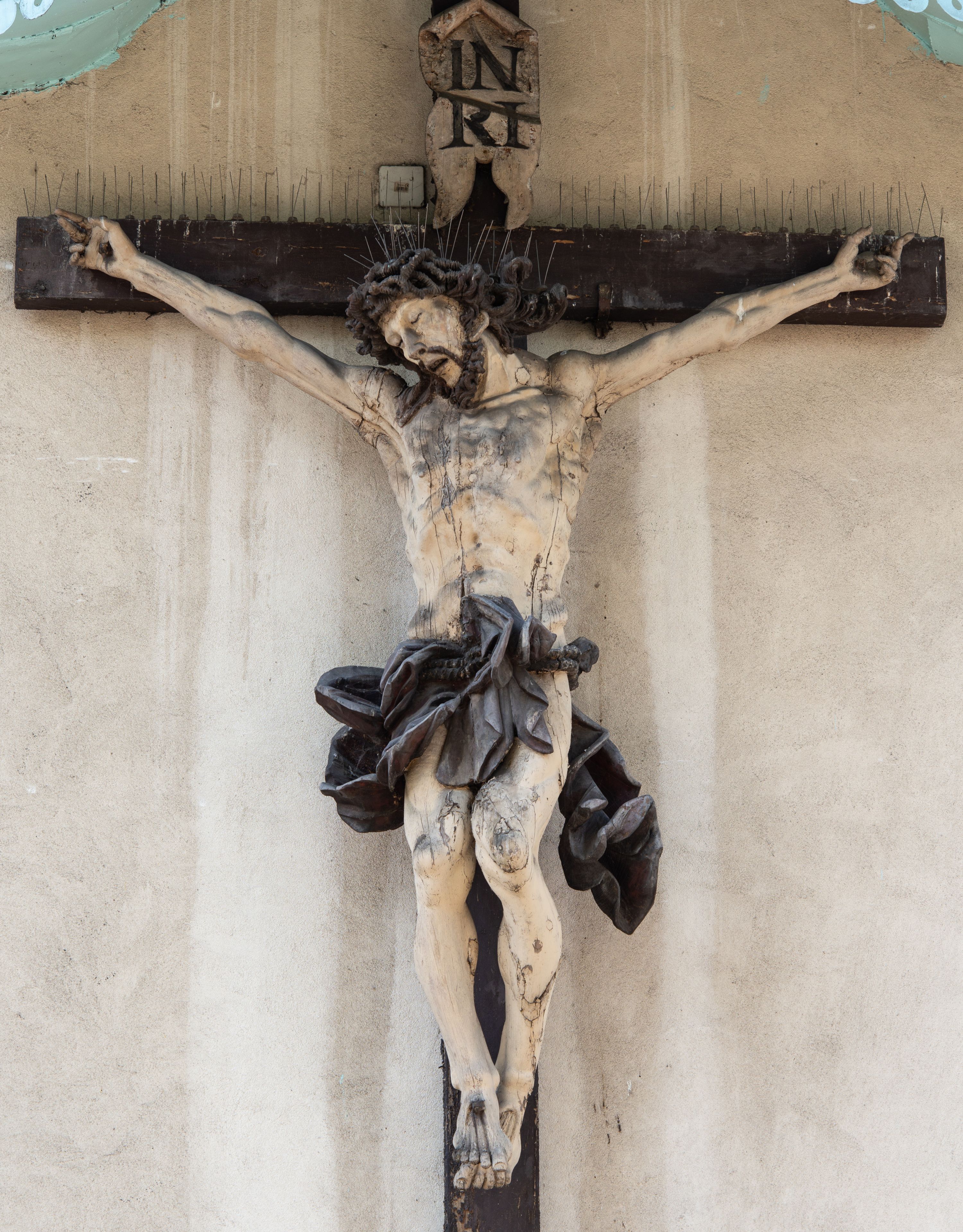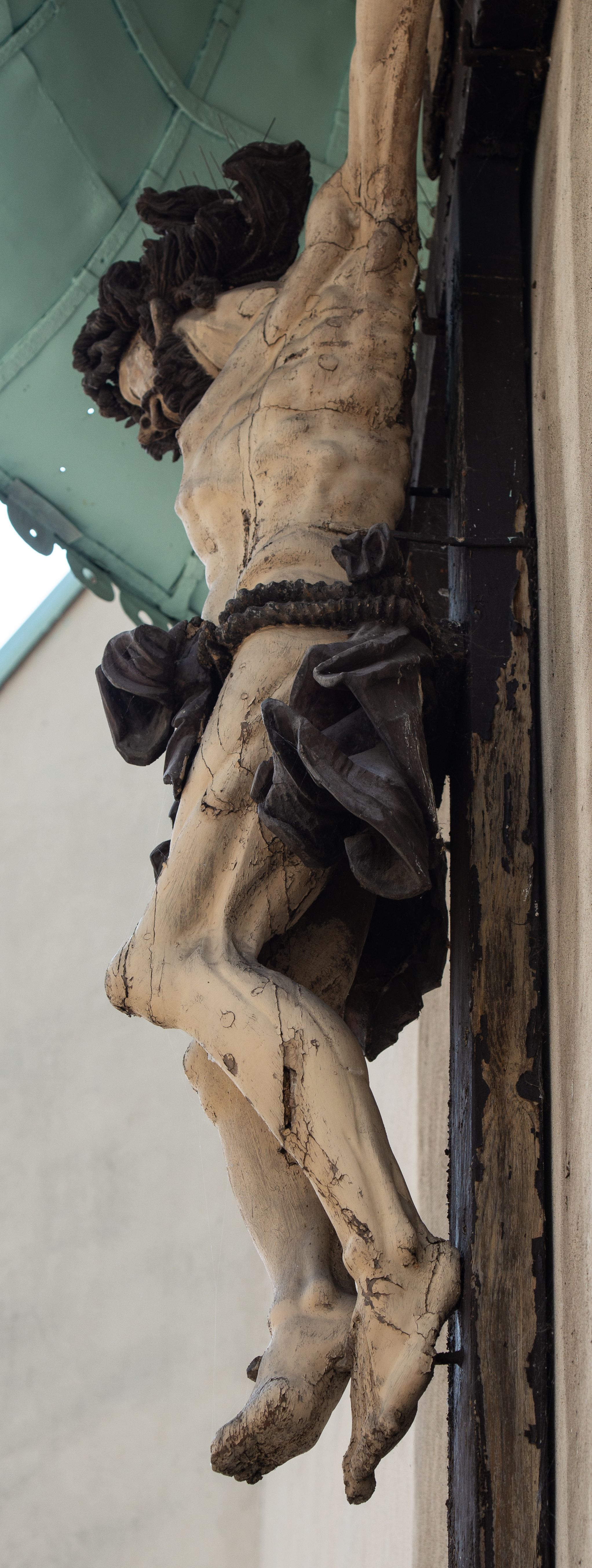 Wykonany w połowie XVIII wieku krucyfiks został umieszczony na osi zewnętrznej, wschodniej ściany prezbiterium. Rzeźbę przed czynnikami atmosferycznymi zabezpiecza półsferyczny daszek miedziany zawieszony ponad nią.