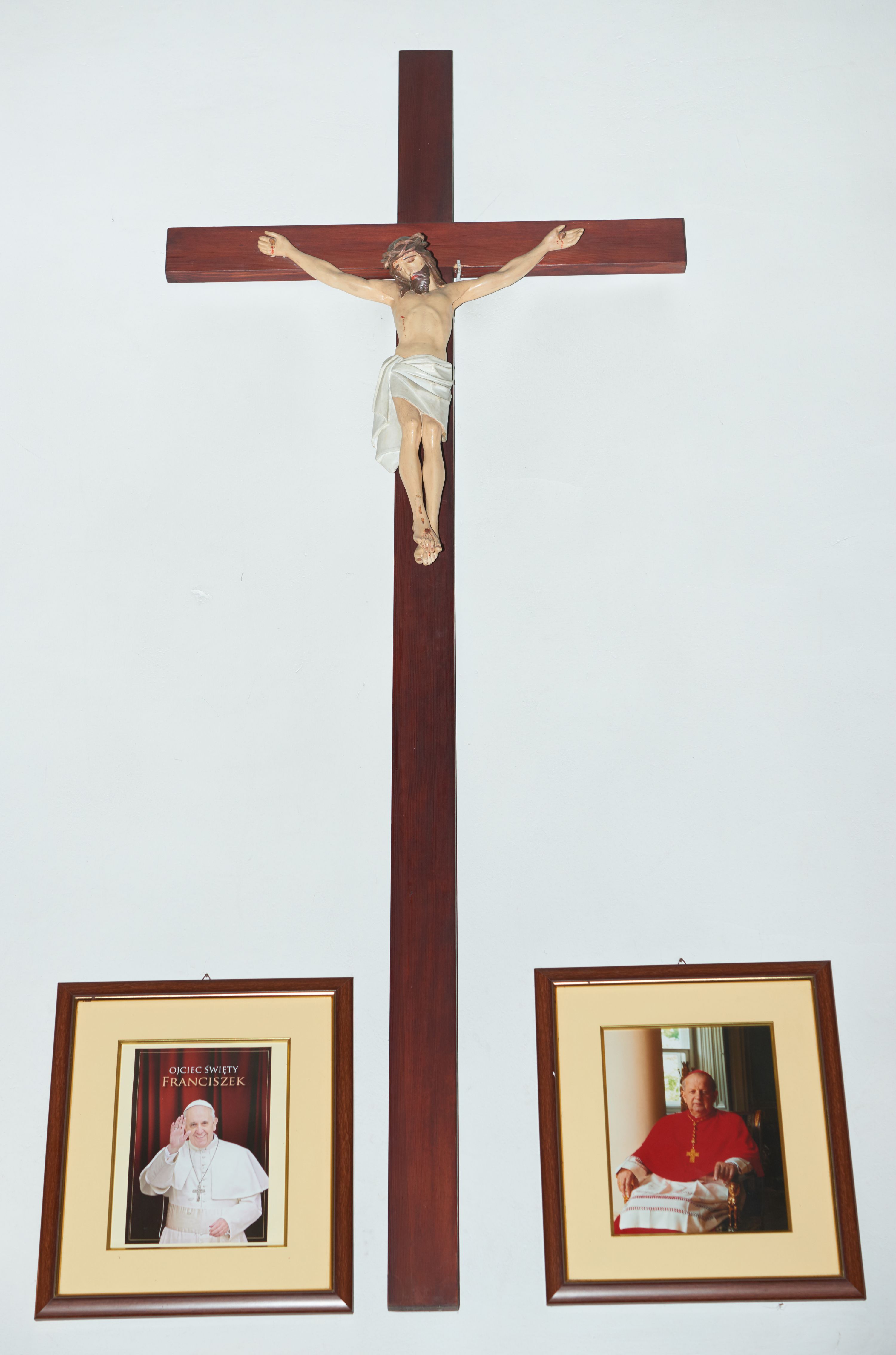 Pełnoplastyczna, polichromowana figura Chrystusa na krzyżu. Sylwetka zmarłego Chrystusa smukła, o naturalnej karnacji, z delikatnie zarysowaną muskulaturą. Ramiona uniesione do góry tworzą łuk palce dłoni wyprostowane. Nogi lekko ugięte w kolanach. Głowa nieznacznie przechylona w prawą stronę , twarz pociągła, oczy i usta zamknięte, nos szpiczasty o prostym profilu. Na prawe ramię spływa pukiel włosów, broda krótka, ciemnobrązowa. Na głowie brązowa korona cierniowa. Perizonium krótkie, białe, ukośnie udrapowane, z węzłem i kaskadą fałd sięgającą połowy prawej łydki. Dłonie i skrzyżowane stopy przebite gwoździami, ślad krwi przy ranie w boku. Krzyż współczesny.