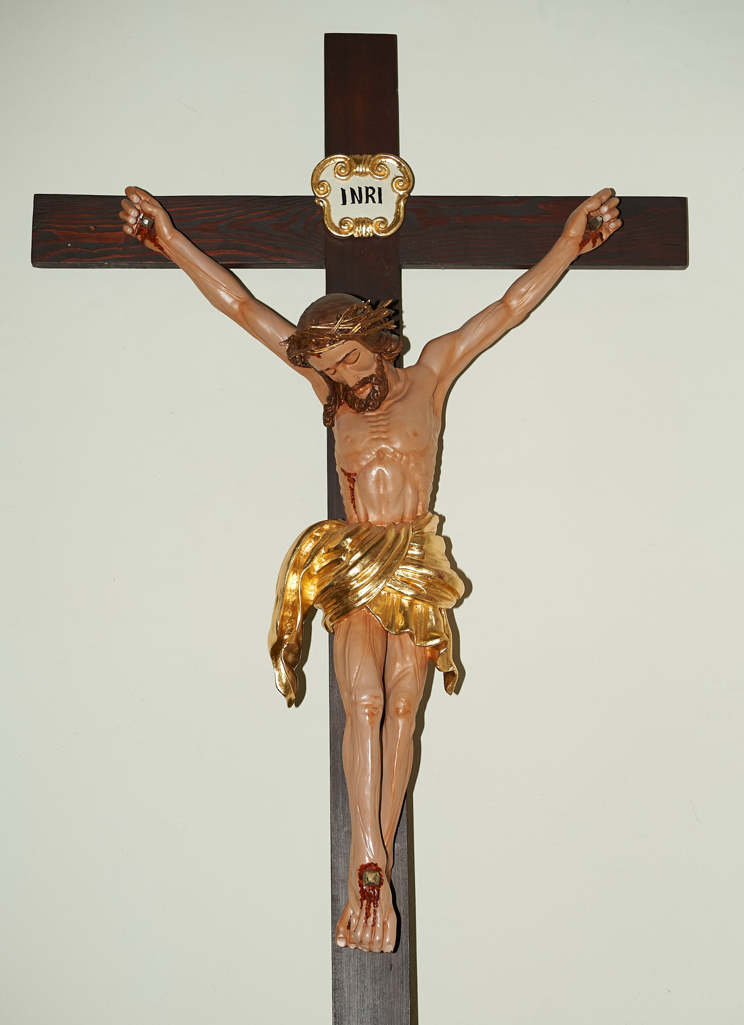 Wizerunek Chrystusa przybitego trzema gwoździami do krzyża. Ciało wyprostowane, o wyraźnie wyeksponowanej linii żeber i muskulaturze, długie i szczupłe ręce rozciągnięte powyżej głowy, nogi delikatnie ugięte w kolanach, prawe kolano powyżej lewego. Głowa pochylona na prawy bark. Twarz szczupła, oczy zamknięte, nos prosty. Włosy długie, ciemnobrązowe, lekko falowane opadające na prawe ramię postaci. Na twarzy ciemny zarost – krótka, ciemnobrązowa broda i wąsy. Na głowie złocona korona cierniowa. Biodra otacza krótkie, złote perizonium przewiązane w węzeł. W miejscach przebić gwoździami oraz na ranie w boku ślady krwi. Krzyż gładki, ciemnobrązowy, na górnej belce titulus w formie złoconego, wolutowego kartusza z napisem „INRI” (łac. Iesus Nazarenus Rex Iudaeorum) na białym tle. Figura w pełni polichromowana, partie szat złocone.