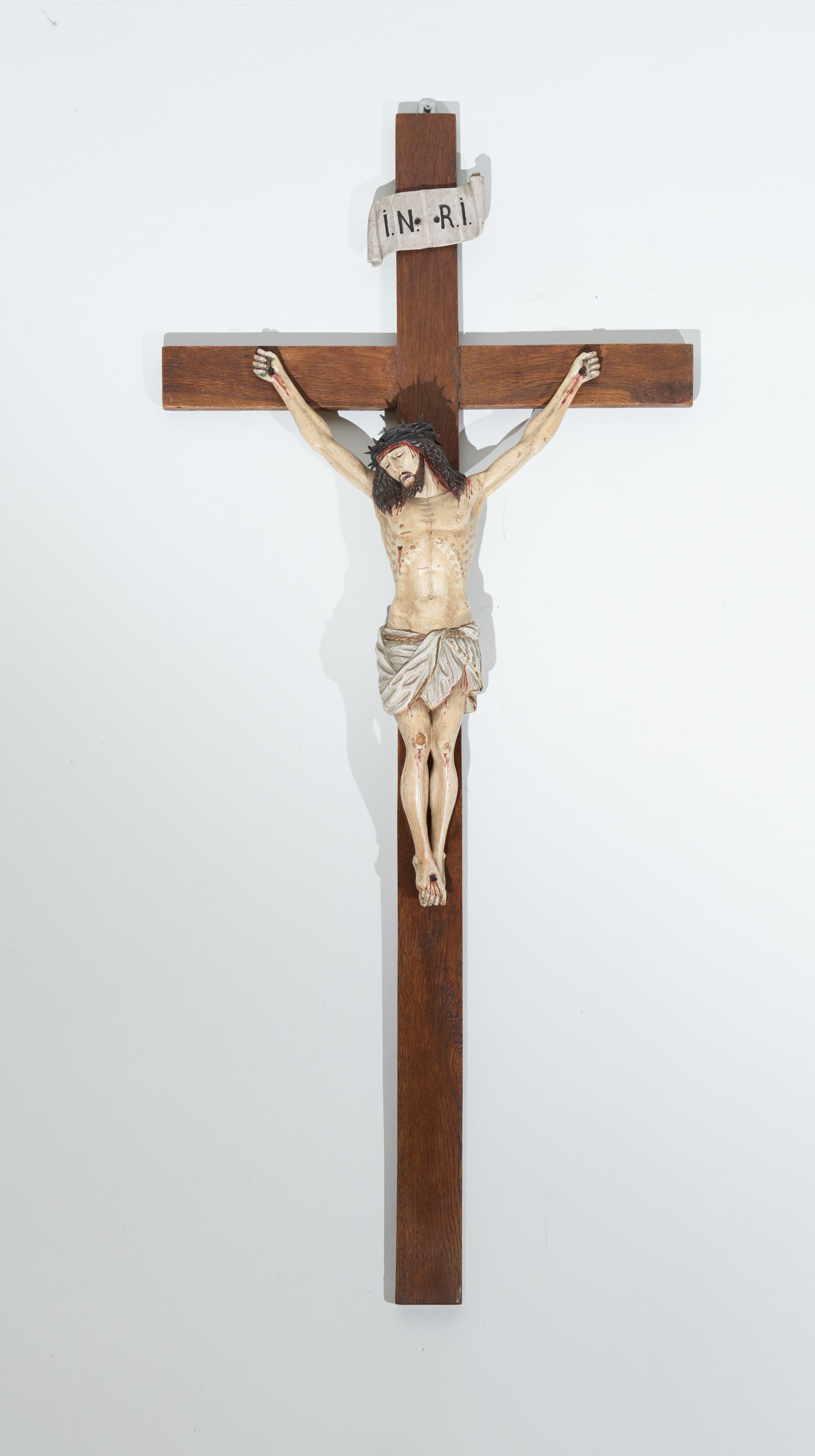 Rzeźba Chrystusa przybita do krzyża trzema gwoździami w głębokim zwisie na ramionach. Sylwetka szczupła o mocno podkreślonej anatomii, głowa przechylona na prawe ramię, kolana przylegające do siebie, stopy w układzie prawa na lewą. Twarz szczupła, trójkątna z długim nosem, zamkniętymi oczami, otwartymi ustami, okolona krótką brodą rozdzieloną na końcu w dwa pukle. Włosy długie, bujne i ciemnobrązowe, spływające na ramiona; na głowie szeroka korona cierniowa. Perizonium białe ze złotą lamówką na brzegach, ciasno oplatające biodra, przewiązane sznurem. Z boku, dłoni, stóp i spod korony cierniowej spływają strużki krwi. Polichromia ciała naturalistyczna. Krzyż gładki, prosty; nad głową Chrystusa titulus w formie poziomej banderoli z napisem „IN / RI”.