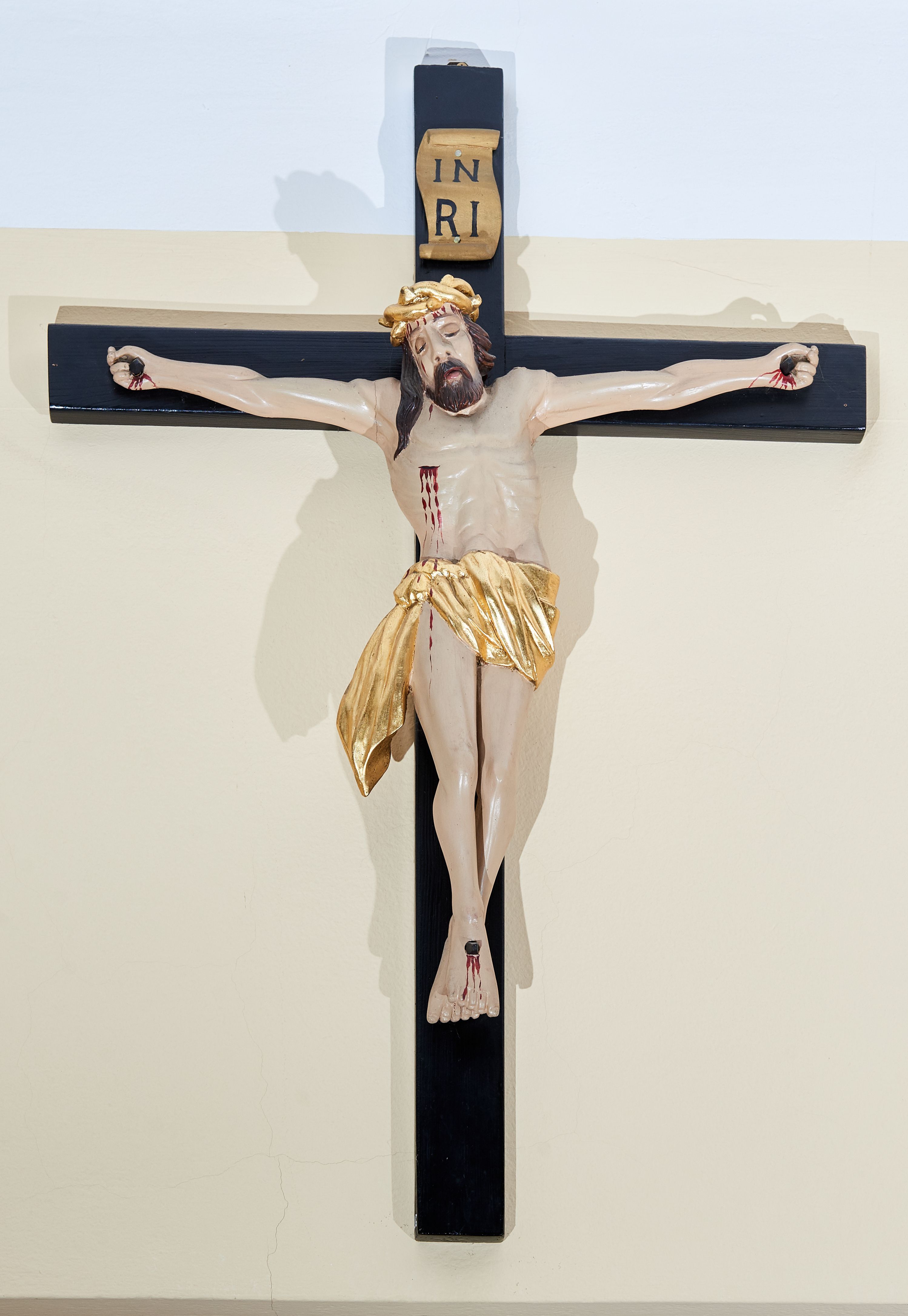 Rzeźba Chrystusa przybita do krzyża trzema gwoździami na silnie wyprostowanych ramionach. Sylwetka o mocno podkreślonej muskulaturze, kolana delikatnie ugięte, stopy w układzie prawa na lewą. Chrystus ma głowę przechyloną na prawe ramię. Twarz podłużna z szerokim i długim nosem, zamkniętymi oczami, na wpół otwartymi ustami, okolona krótką brodą. Włosy długie i ciemnobrązowe, spływające na prawe ramię, na głowie szeroka i złocona korona cierniowa. Perizonium złocone, ciasno oplatające biodra, przewiązane na prawym boku, z jednym końcem dłuższym i zwisającym wzdłuż prawego uda. Z boku, dłoni, stóp i spod korony cierniowej spływają strużki krwi. Polichromia ciała naturalistyczna. Krzyż gładki, prosty, pomalowany na czarno; nad głową Chrystusa titulus z napisem „IN / RI”.