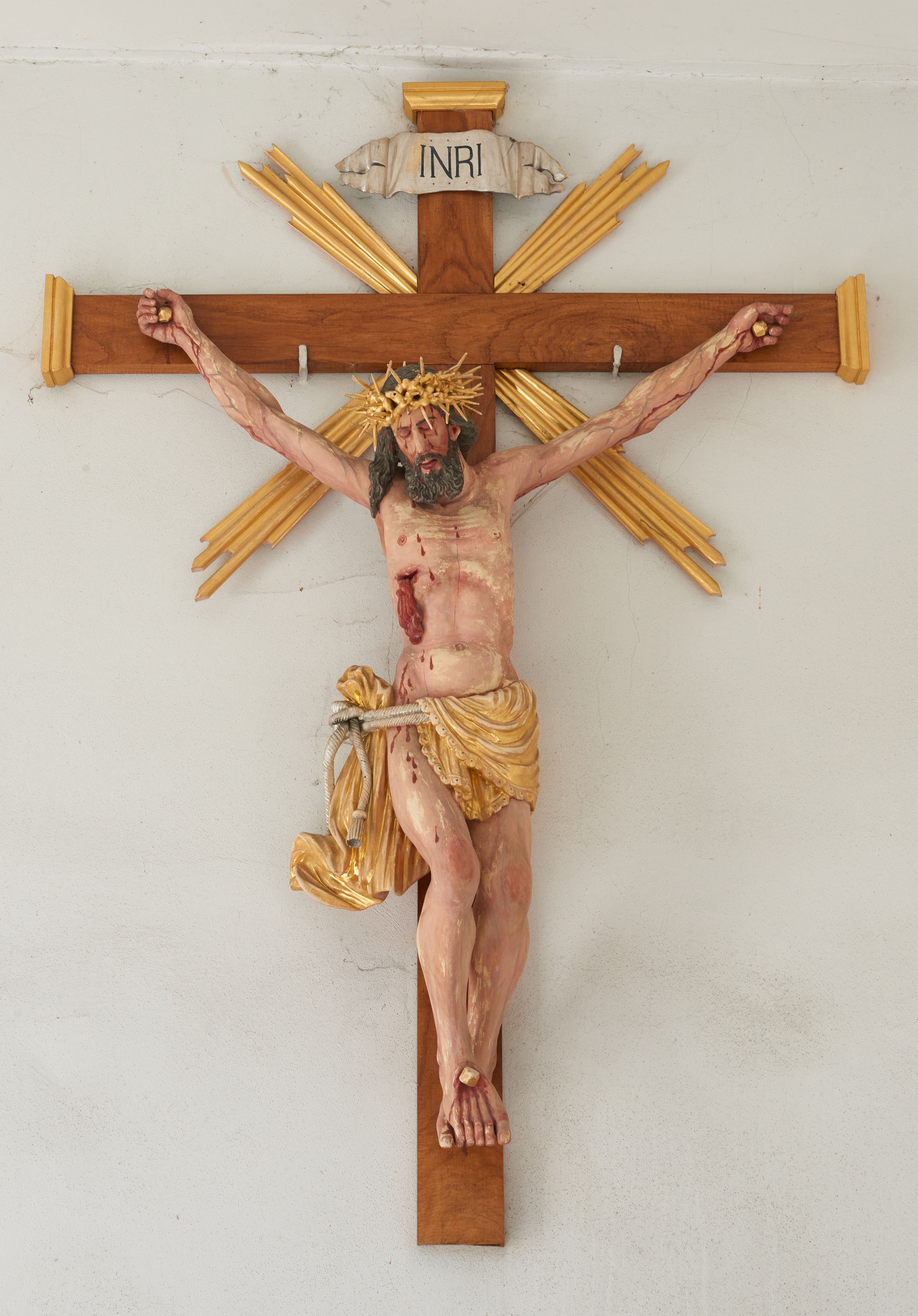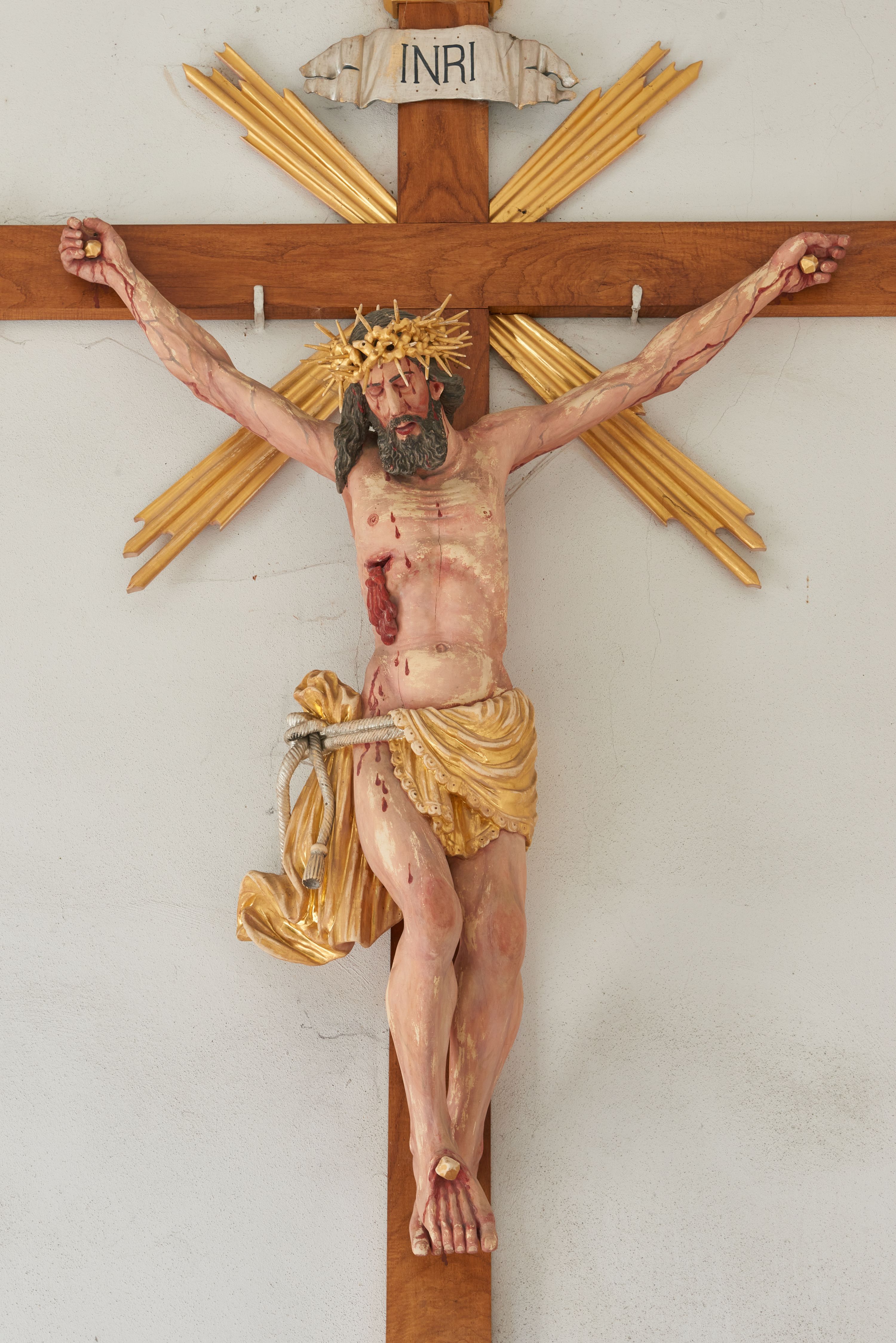 Chrystus przybity do krzyża na wyciągniętych do góry ramionach z prawą nogą ugiętą w kolanie i stopami przebitymi jednym gwoździem w układzie prawa na lewą. Klatka piersiowa smukła z wyraźnie zaznaczoną linią żeber i mostka, wciętą talią i dużą raną na prawym boku z wyrzeźbioną obficie broczącą krwią. Chrystus ma głowę opuszczoną w dół o podłużnej twarzy z zamkniętymi oczami, długim nosem i rozchylonymi ustami. Twarz okala bujna broda, rozdzielona na końcu w dwa szerokie pukle; włosy długie, ciemnobrązowe, opadają na prawe ramię. Perizonium jest przewiązane podwójnym sznurem, zakończonym chwostami. Tkanina na lewym boku Chrystusa i na środku jest przewieszona przez sznur i zdobiona na brzegach koronką, a po prawej stronie zawiązana u góry z końcem spływającym wzdłuż prawego uda, silnie drapowana, bez koronki. Na głowie Zbawiciela założona jest złocona, szeroka korona cierniowa z wbitymi oddzielnie długimi kolcami. Nad głową titulus w formie srebrzonej wstęgi z napisem „INRI”. Na skroniach, dłoniach i stopach ślady obficie spływającej krwi, na rękach Chrystusa wyraźnie zaznaczona siatka żył. Krzyż drewniany, gładki u góry i na bokach zakończony profilowanymi, złoconymi gzymsikami; od skrzyżowania ramion odchodzą cztery wiązki promieni o nierównej długości. Perizonium, korona cierniowa, wiązki promieni, gwoździe i gzymsiki złocone.