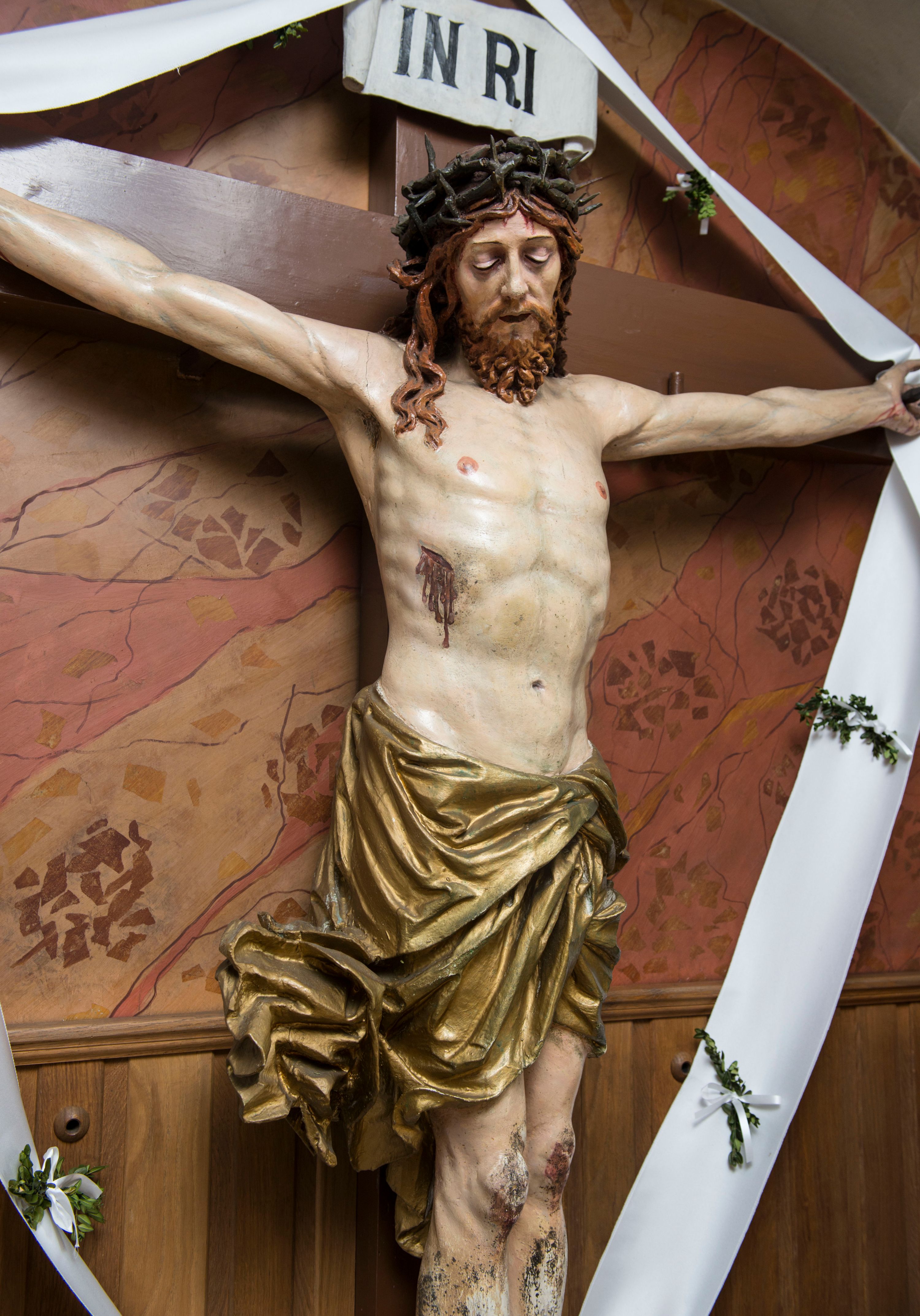 Pełnoplastyczna, polichromowana figura Chrystusa przybitego do krzyża. Ciało o jasnej karnacji i drobiazgowo opracowanej anatomii. Głowa pochylona w dół, lekko w prawo. Twarz owalna o łagodnych rysach, z zamkniętymi, otoczonymi fioletowym cieniem oczami, wąskim nosie i zamkniętych, sinych ustach; z krótkim, brązowym zarostem. Włosy długie, falowane, jasnobrązowe, opadające na plecy i prawe ramię. Na głowie korona cierniowa. Ramiona rozłożone, w prawym boku rana. Nogi wyprostowane, przebite jednym gwoździem, prawa na lewej. Na biodrach krótkie, złote, silnie drapowane, przewiązane na lewym biodrze perizonium, rozwiewające się gęstymi, łamanymi fałdami na wysokości uda w lewą stronę. W środkowej partii pionowej belki biały titulus w formie zwoju z czarnym napisem „INRI”.