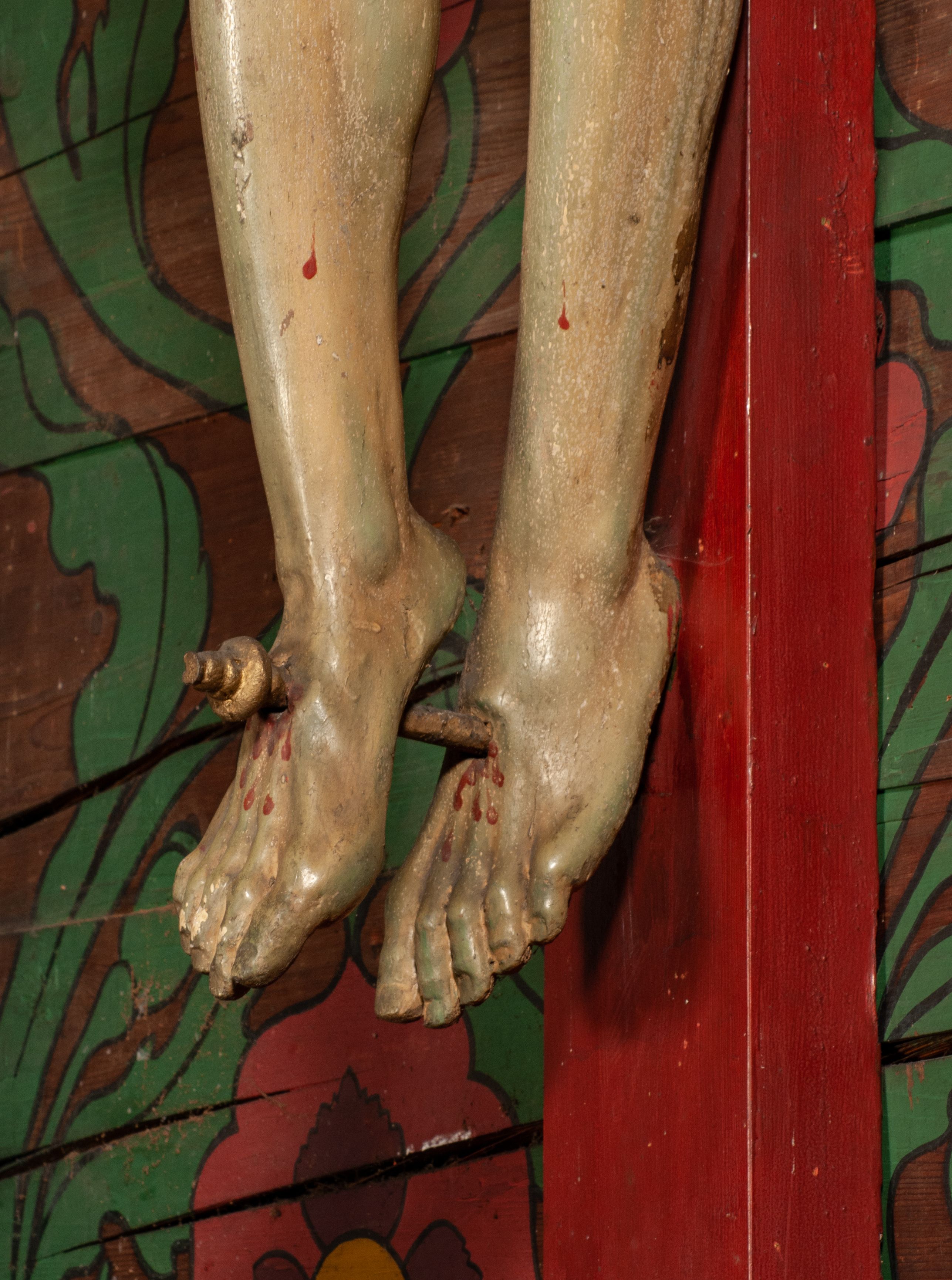 Figura umarłego Chrystusa przybita jest trzema gwoździami do prostego krzyża. Ciało w lekkim zwisie, o szeroko rozłożonych ramionach, układających się w delikatny łuk, głowa opada bezwładnie na prawe ramię, nogi są delikatnie ugięte w kolanach, stopy skrzyżowane w układzie prawa na lewą. Twarz pociągła, o łagodnych rysach i niskim czole, zamkniętych oczach, dużym nosie i rozchylonych ustach, okolona krótką, rozdwajającą się brodą oraz silnie kręconymi włosami opadającymi na prawy bark. Na głowie korona cierniowa. Ciało wychudzone, smukłe, o miękko modelowanej muskulaturze oraz silnie zaznaczonych żebrach i mostku klatki piersiowej, z podkreślonymi liniami ścięgien w partiach ramion i nóg. Biodra przepasane ekspresyjnie drapowanym perizonium zawieszonym na podwójnym sznurze, sięgającym połowy ud, odsłaniającym prawe biodro, ze zwisem rozwianej tkaniny na prawym boku. Polichromia naturalistyczna w partiach ciała z zaznaczonymi śladami męki, perizonium i korona cierniowa pozłacane. W górnej części krzyża banderola z inskrypcją „I.N. / R.I.”.