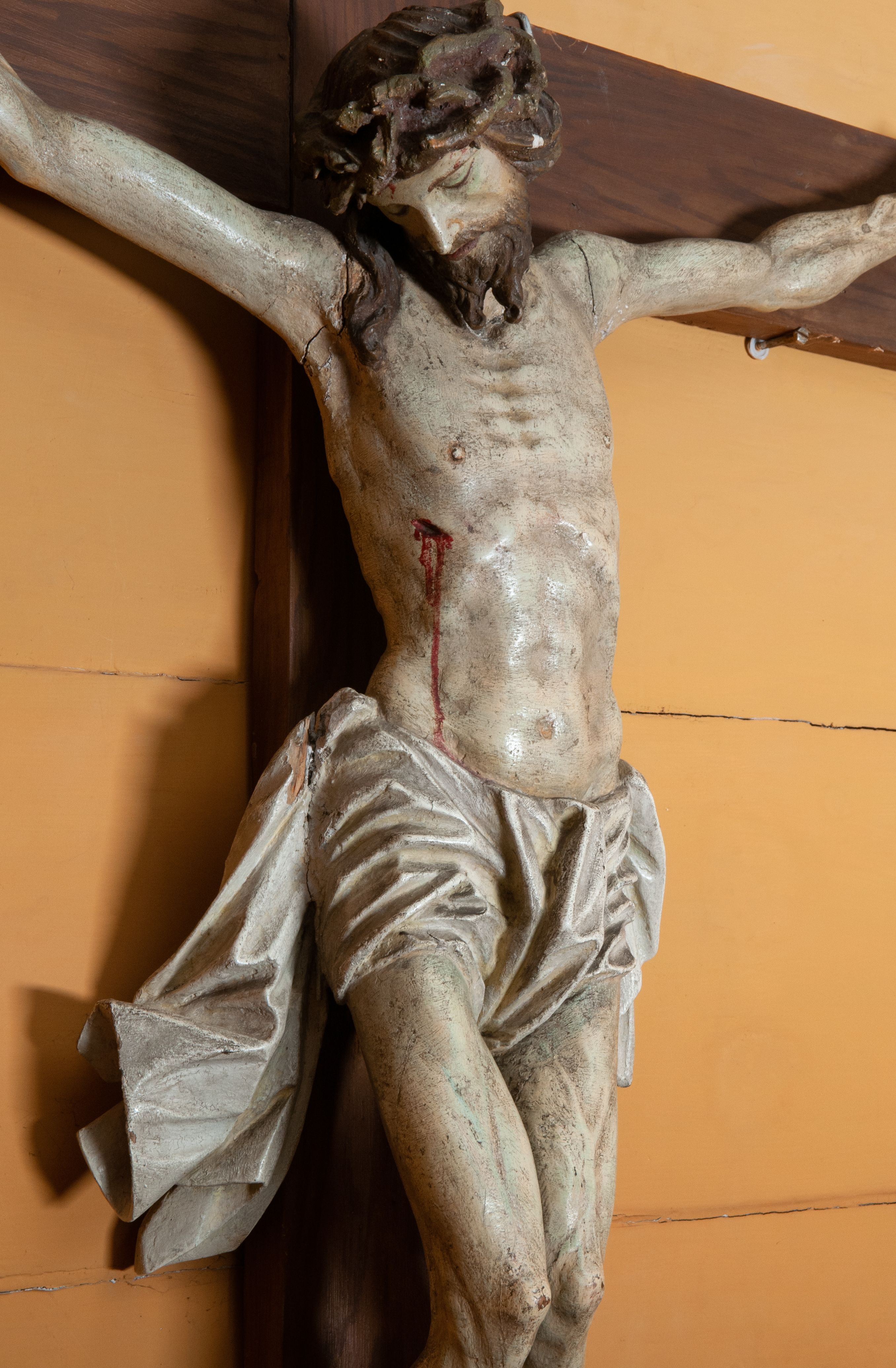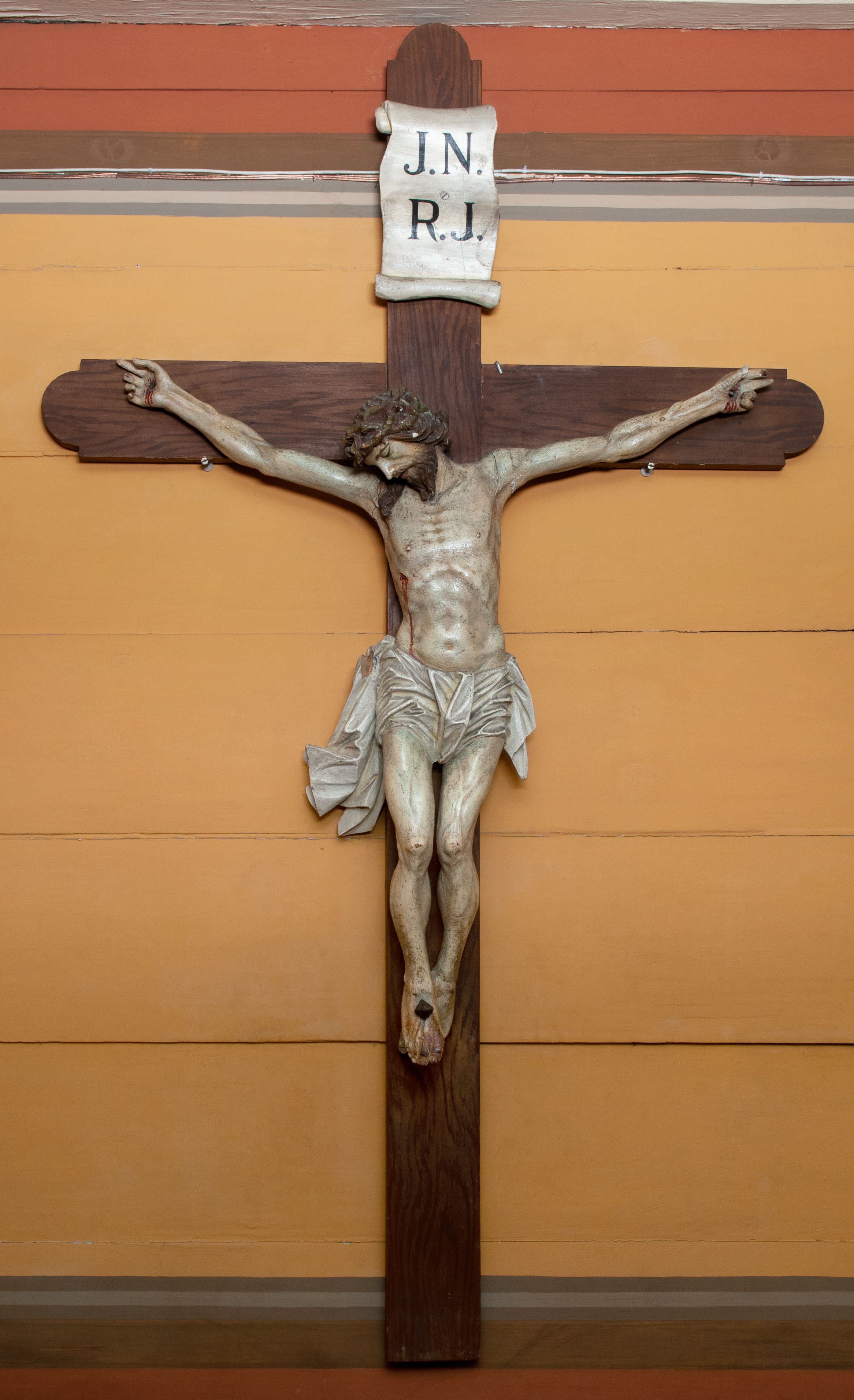 Rzeźba Chrystusa przybita do krzyża trzema gwoździami, ukazana w typie Cristo morte. Ciało w delikatnym zwisie, o szeroko rozstawionych ramionach, sylwetka szczupła, choć muskularna. Chrystus ma głowę przechyloną na prawe ramię. Twarz szczupła, z wąskim i długim nosem, zamkniętymi oczami, na wpół otwartymi ustami, okolona krótką brodą. Włosy długie spływające na prawe ramię, na głowie korona cierniowa. Perizonium ciasno oplatające biodra, z jednym końcem dłuższym, zwisającym wzdłuż prawego uda. Z boku, dłoni, stóp i spod korony cierniowej spływają strużki krwi. Polichromia ciała naturalistyczna. Krzyż gładki, o ramionach zakończonych łukiem nadwieszonym; nad głową Chrystusa titulus w formie banderoli z napisem „J.N. / R.J.”