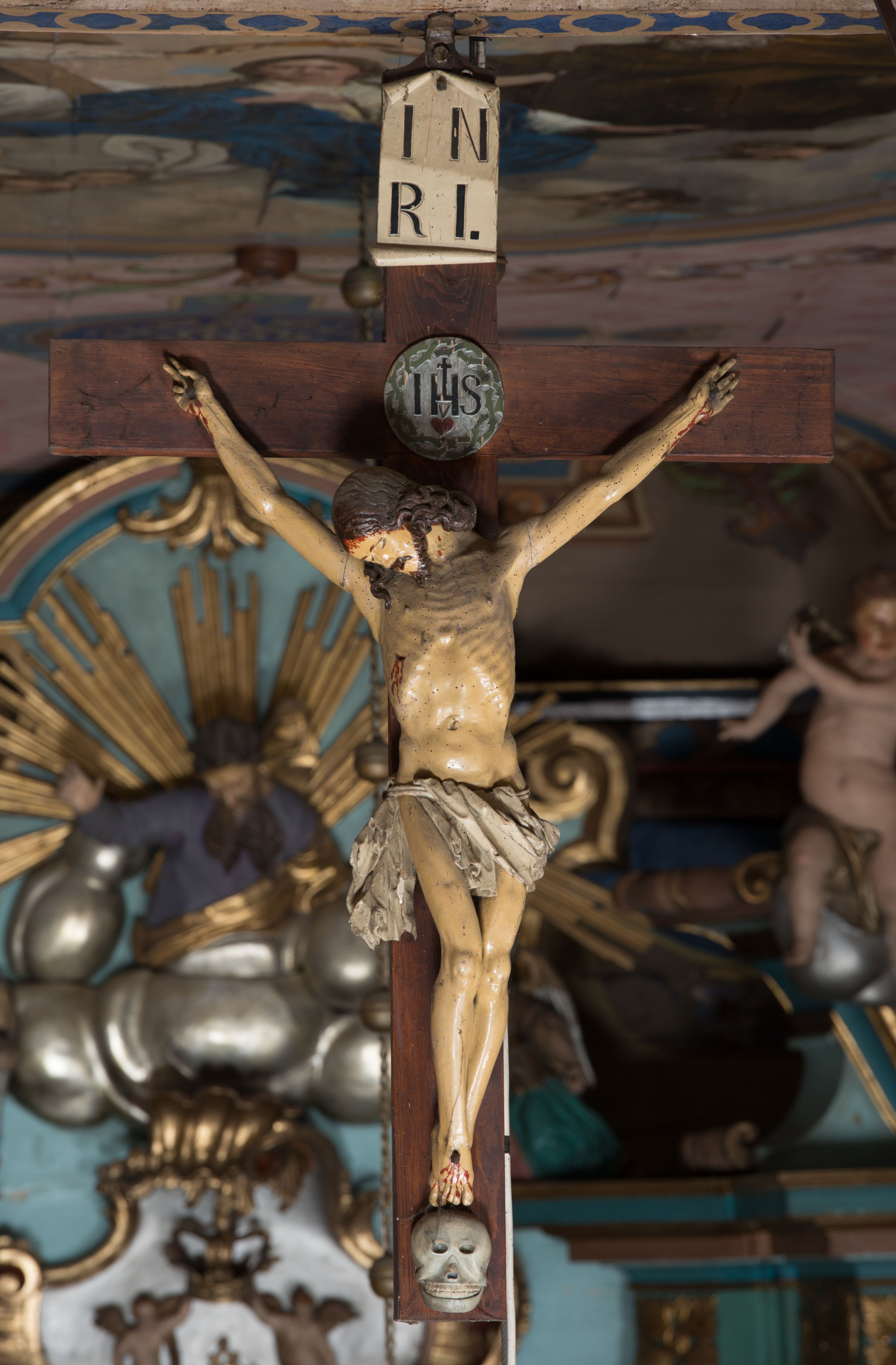 Figura Chrystusa Ukrzyżowanego powstała prawdopodobnie w drugiej połowie XVII wieku i została ukazana w typie Cristo morte, a więc Chrystusa umarłego, po tym jak skonał na krzyżu. Jest to przedstawienie Jezusa cierpiącego, ale też zwycięskiego. Czaszka, która znajduje się u jego stóp odwołuje się do tradycji, według której w miejscu postawienia krzyża miał się znajdować grób praojca Adama.