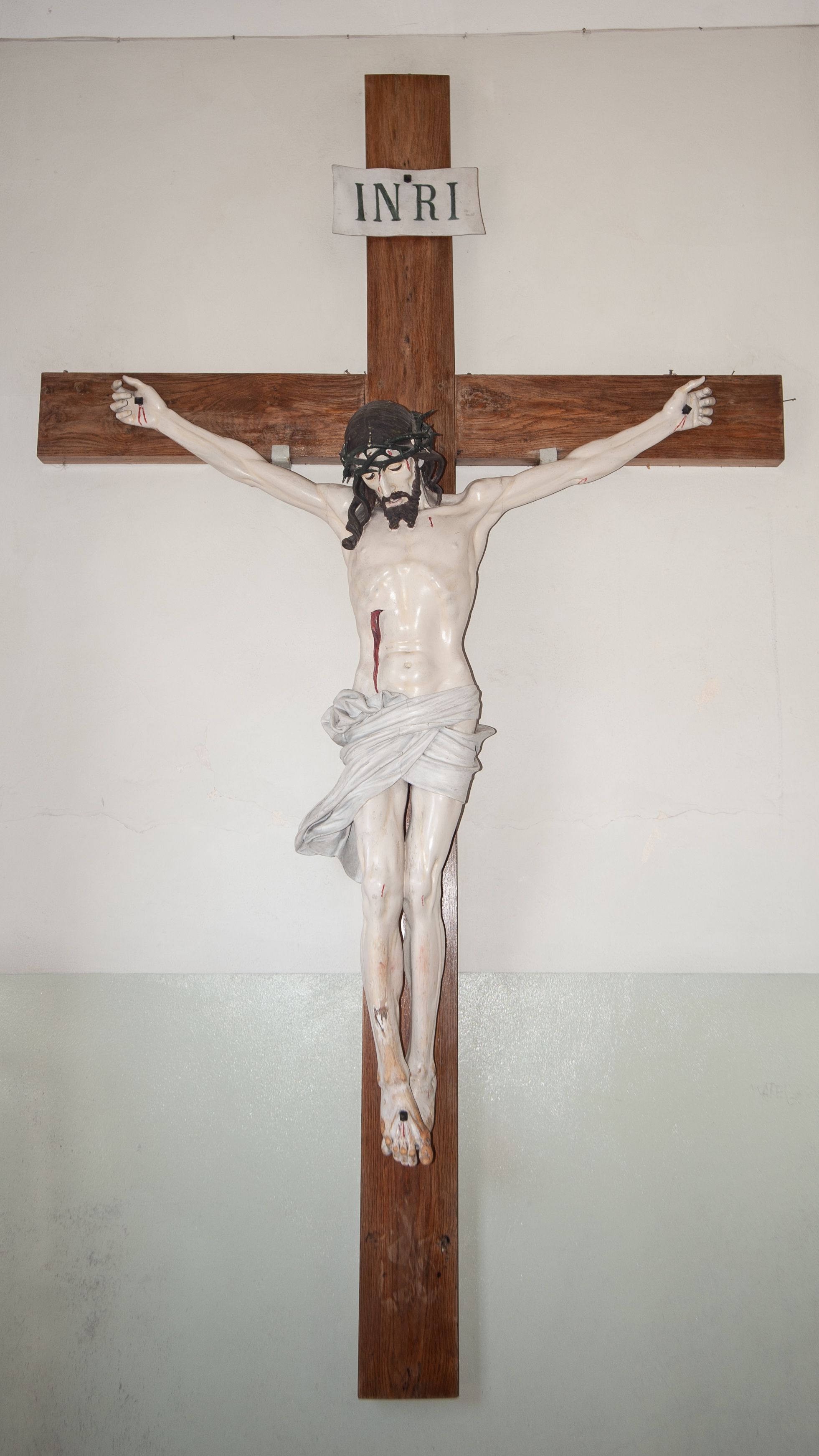 Chrystus ukazany w lekkim zwisie, o silnie zaznaczonej anatomii, z wydatną klatką piersiową i zaznaczoną wyraźnie linią żeber. Nogi przybite do krzyża jednym gwoździem, założone prawa na lewą. Głowa lekko zwrócona w prawą stronę, skłoniona w dół. Twarz pociągła, nos prosty, oczy i usta lekko otwarte. Twarz okolona niewielkim zarostem ułożonym na końcu w dwa pukle; włosy długie, opadające na plecy i prawe ramię. Na głowie masywna korona cierniowa. Perizonium białe, ciasno oplatające biodra, z dłuższym końcem spływającym wzdłuż prawego uda. Nad głową Chrystusa prosty titulus z napisem „INRI”. Polichromia w odsłoniętych partiach ciała naturalistyczna. Krzyż gładki, ciemnobrązowy.