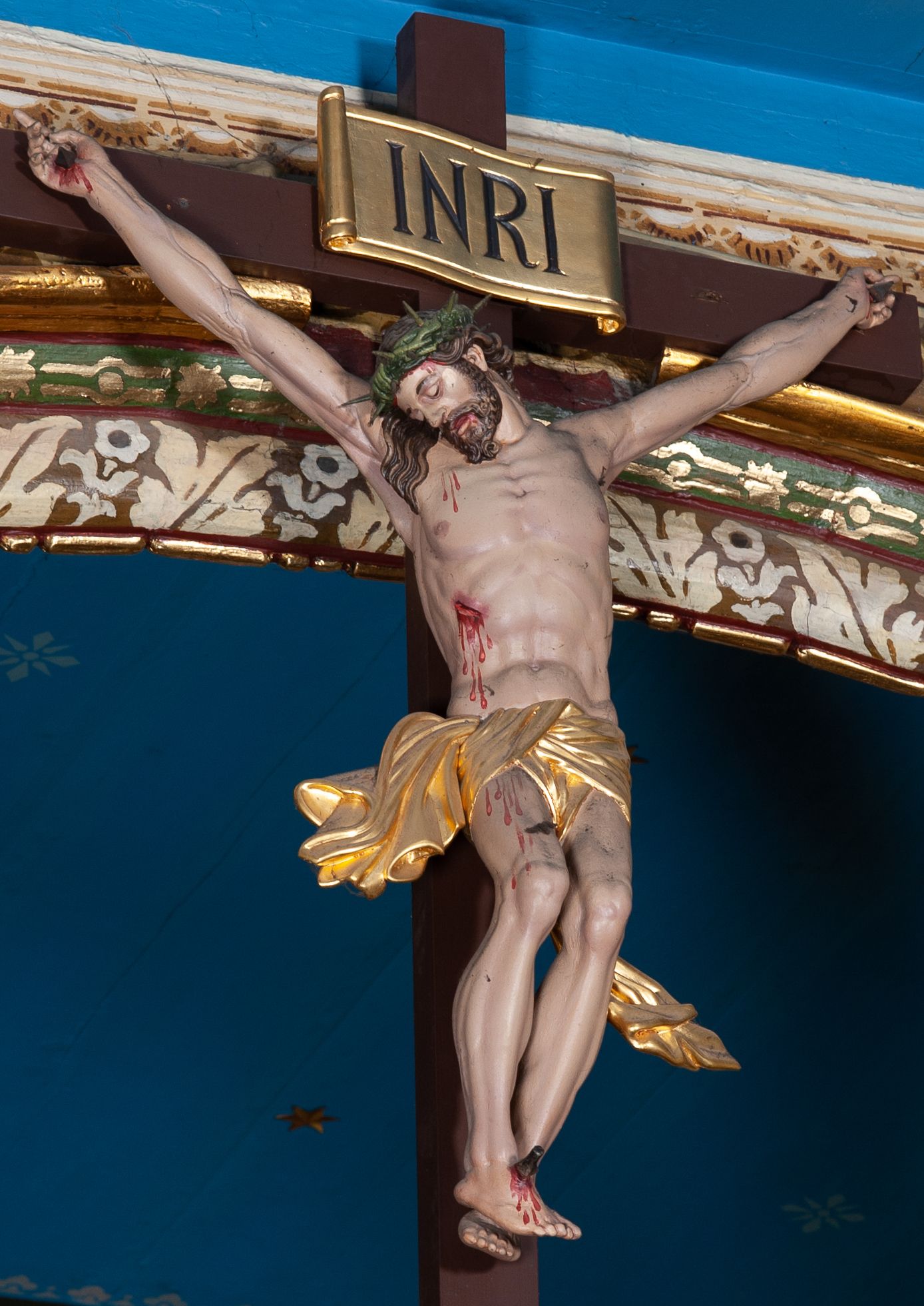 Krucyfiks, to przedstawienie ukrzyżowanego Jezusa. Martwe ciało Zbawiciela o wyraźnie zaznaczonej muskulaturze jest rozciągnięte i przybite trzema gwoździami do prostego krzyża. Widać na nim ślady męki: strużki krwi płynące po ciele, przebity bok oraz krwawiące rany. Głowa jest opuszczona na prawe ramię, oczy i usta zamknięte; na głowie zielona korona cierniowa. Chrystus ma rozpostarte ręce, stopy założone na siebie, prawa na lewej, przybite jednym gwoździem. Biodra otacza złote perizonium przewiązane z przodu z końcami rozwiewającymi się na boki. Na górnym ramieniu krzyża widnieje rozwinięty titulus z majuskułowymi literami „INRI” (łac. Iesus Nazarenus Rex Iudaeorum).
