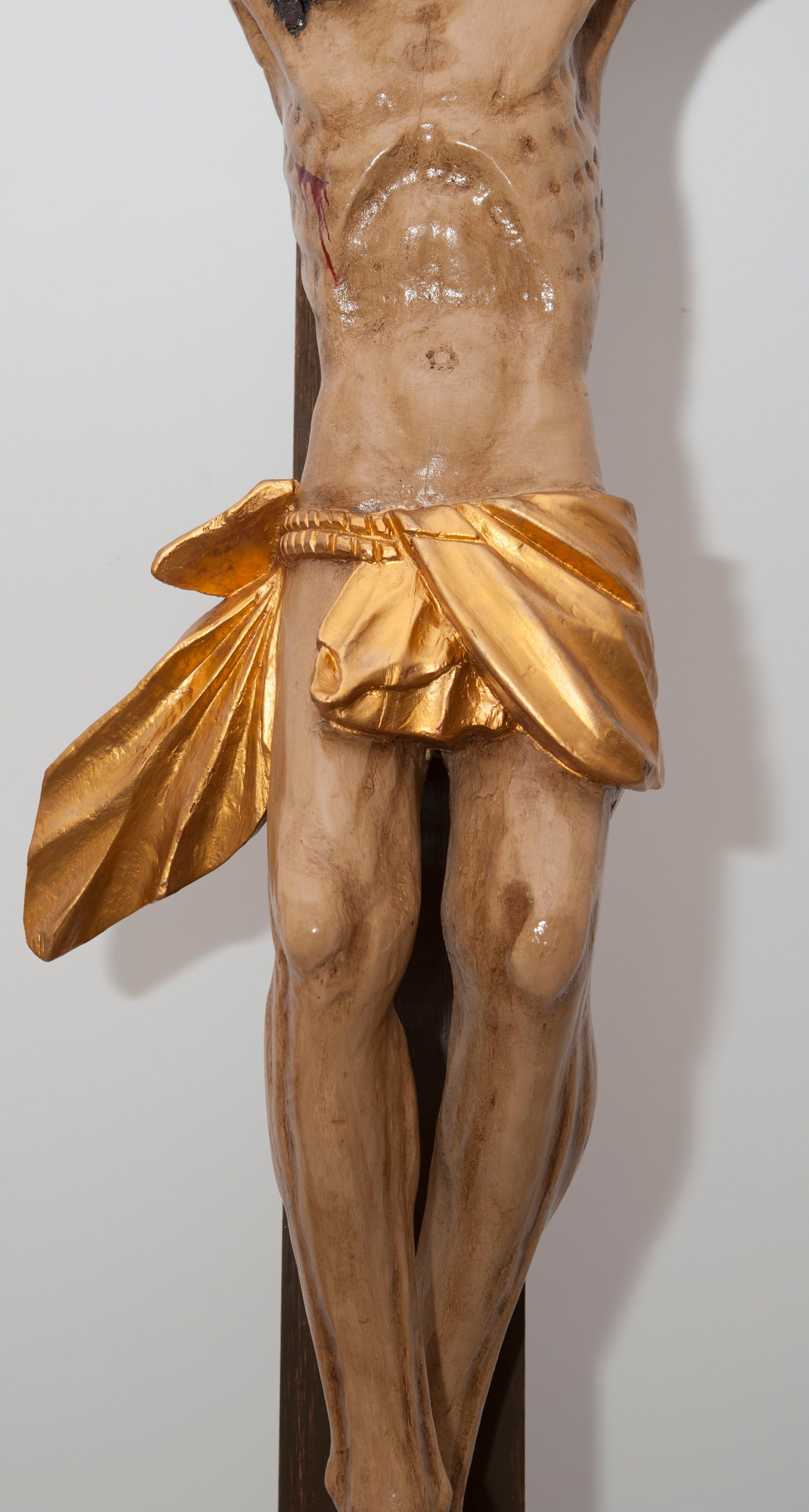 Wizerunek Chrystusa przybitego trzema gwoździami do krzyża. Ciało wyprostowane, o wyraźnie zaznaczonej linii żeber, długie ręce rozciągnięte powyżej głowy, nogi delikatnie ugięte w kolanach, prawe kolano powyżej lewego. Głowa opada na prawy bark. Jezus ma wielokątną twarz, oczy zamknięte, usta rozchylone, nos prosty; okala ją broda o zaznaczonych pasmach oraz zwijające się w fale włosy opadające na plecy i prawy bark. Na głowie gruba, ciemnozielona korona cierniowa. Biodra otacza złote perizonium ułożone w sztywne, równoległe fałdy i przytrzymane sznurem związanym na prawym boku. W miejscach przebić gwoździami oraz w ranie w boku ślady krwi. Krzyż gładki, ciemnobrązowy, na górnej belce titulus w formie równoległobocznej tabliczki z literami „INRI” (łac. Iesus Nazarenus Rex Iudaeorum). Polichromia w partiach ciała naturalistyczna.
