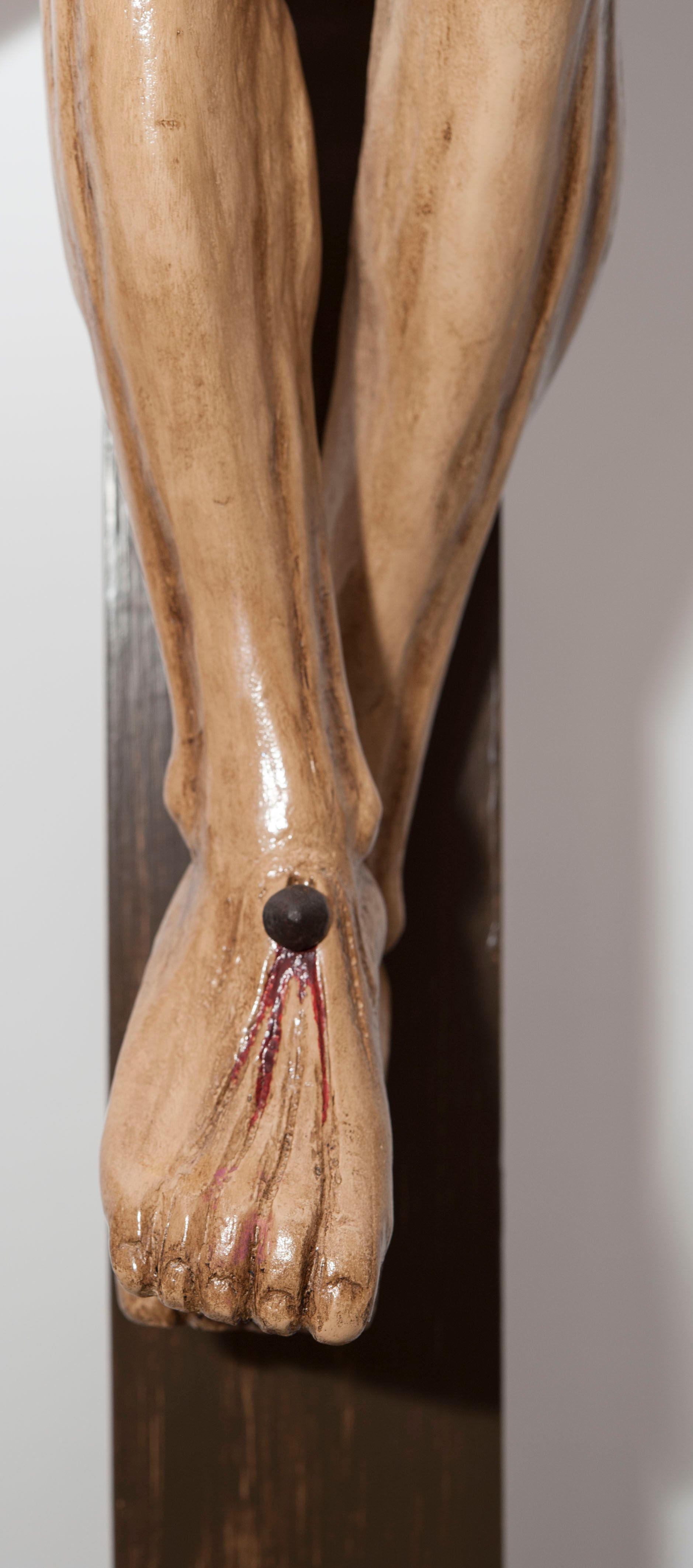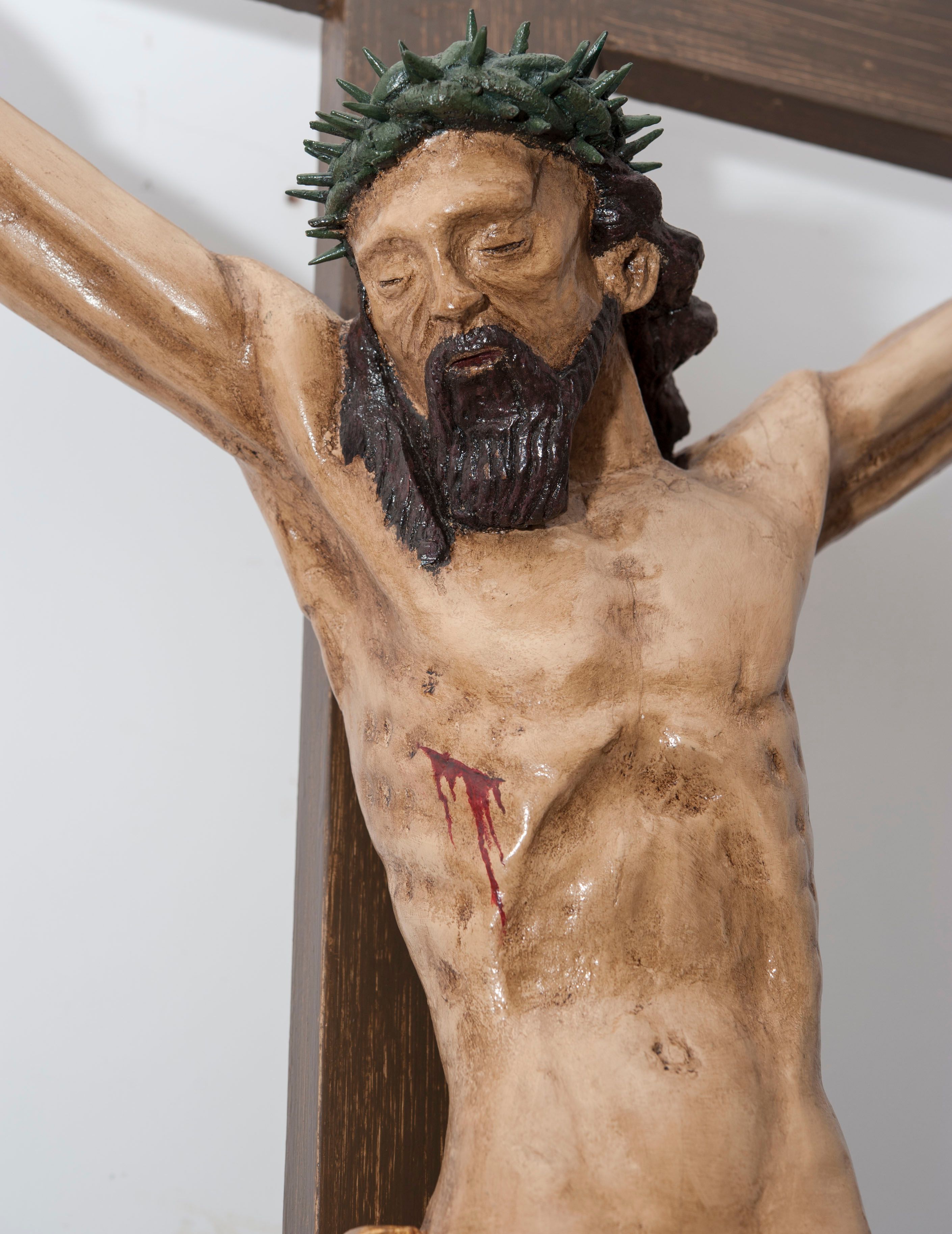 Ukrzyżowanie, kulminacyjny moment Pasji, opisany przez każdą z czterech Ewangelii, stanowi najczęściej ukazywany temat w sztuce chrześcijańskiej. Od XI wieku nacisk kładziono na przedstawienie nie triumfu, lecz cierpienia Chrystusa – zmarłego lub umierającego – w koronie cierniowej i z opuszczoną głową, również w towarzystwie innych osób świętych. Przedstawienie zredukowane, jak w przypadku tej rzeźby, wyłącznie do postaci wiszącego na krzyżu, martwego Jezusa uwypukla jego osamotnienie w czasie męki i stanowi obowiązkowe wyposażenie każdego kościoła. Nazwa krucyfiks pochodzi od łacińskiego słowa „crucifixus” i oznacza „przybity do krzyża”. Krucyfiks zachęca do refleksji nad sensem cierpienia i ofiary Jezusa, które prowadzą do odkupienia ludzkości i nad ograniczonym czasem ludzkiego życia oraz wiecznością.