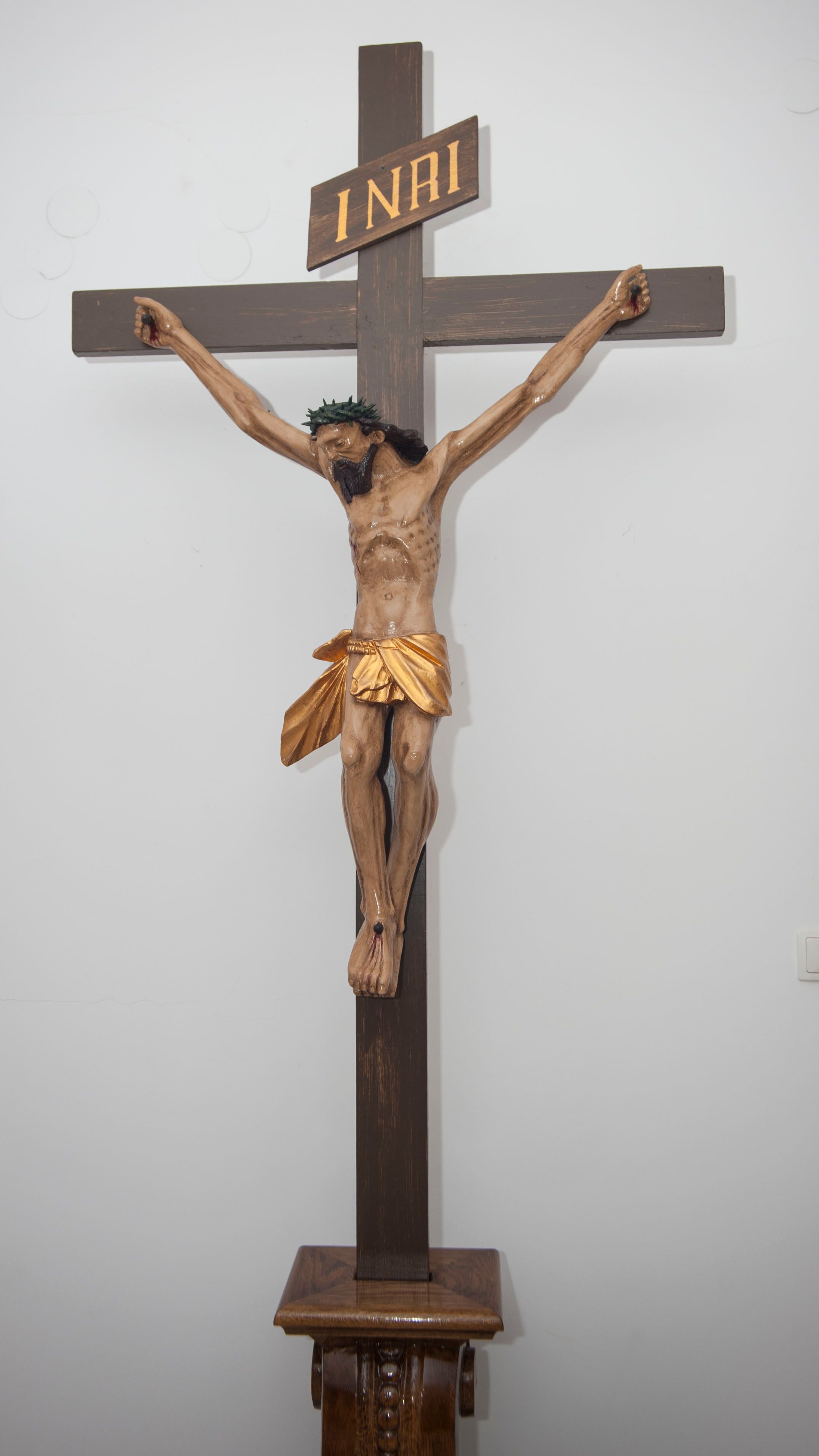Nazwa krucyfiks pochodzi od łacińskiego słowa „crucifixus” i oznacza „przybity do krzyża”. Dziewiętnastowieczne przedstawienie znajdujące się w zakrystii kościoła wykazuje cechy sztuki ludowej, co można rozpoznać w schematycznym traktowaniu fałd perizonium oraz muskulatury.