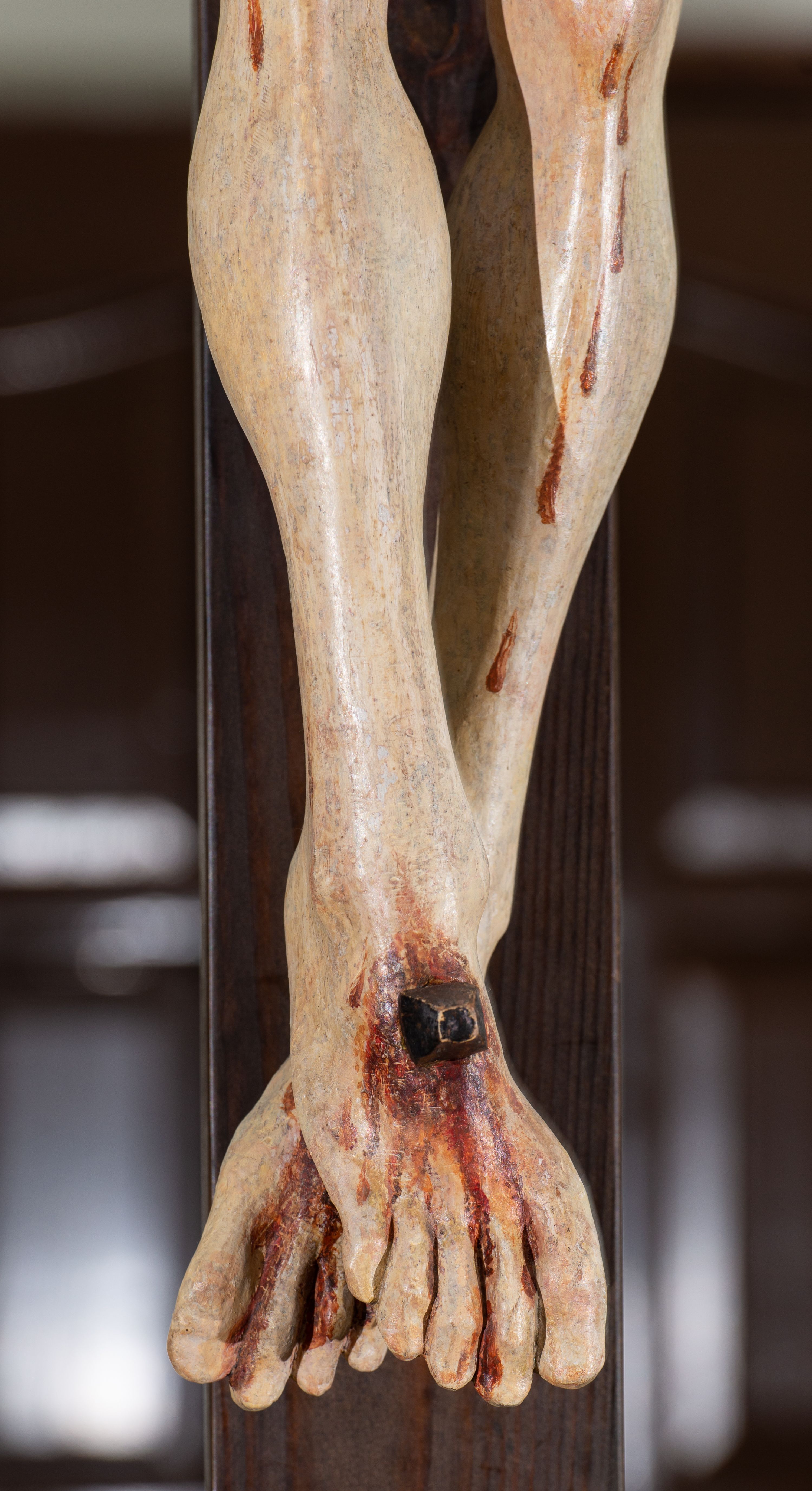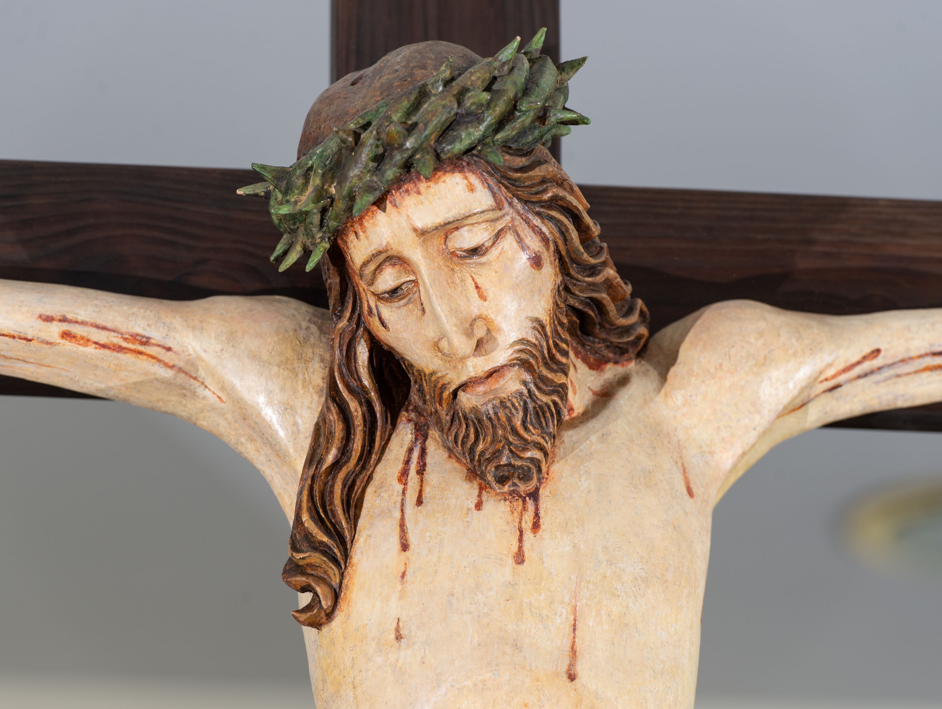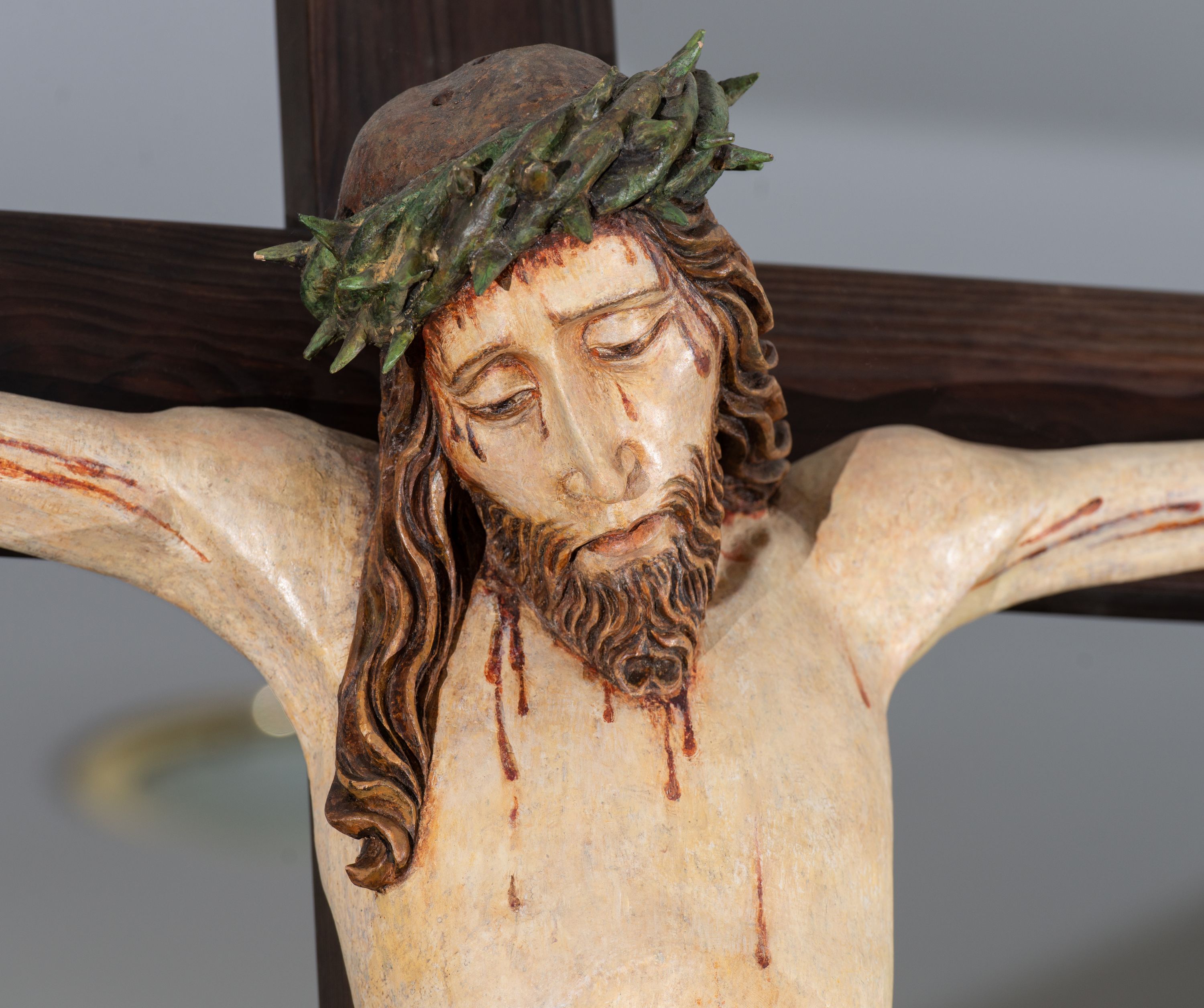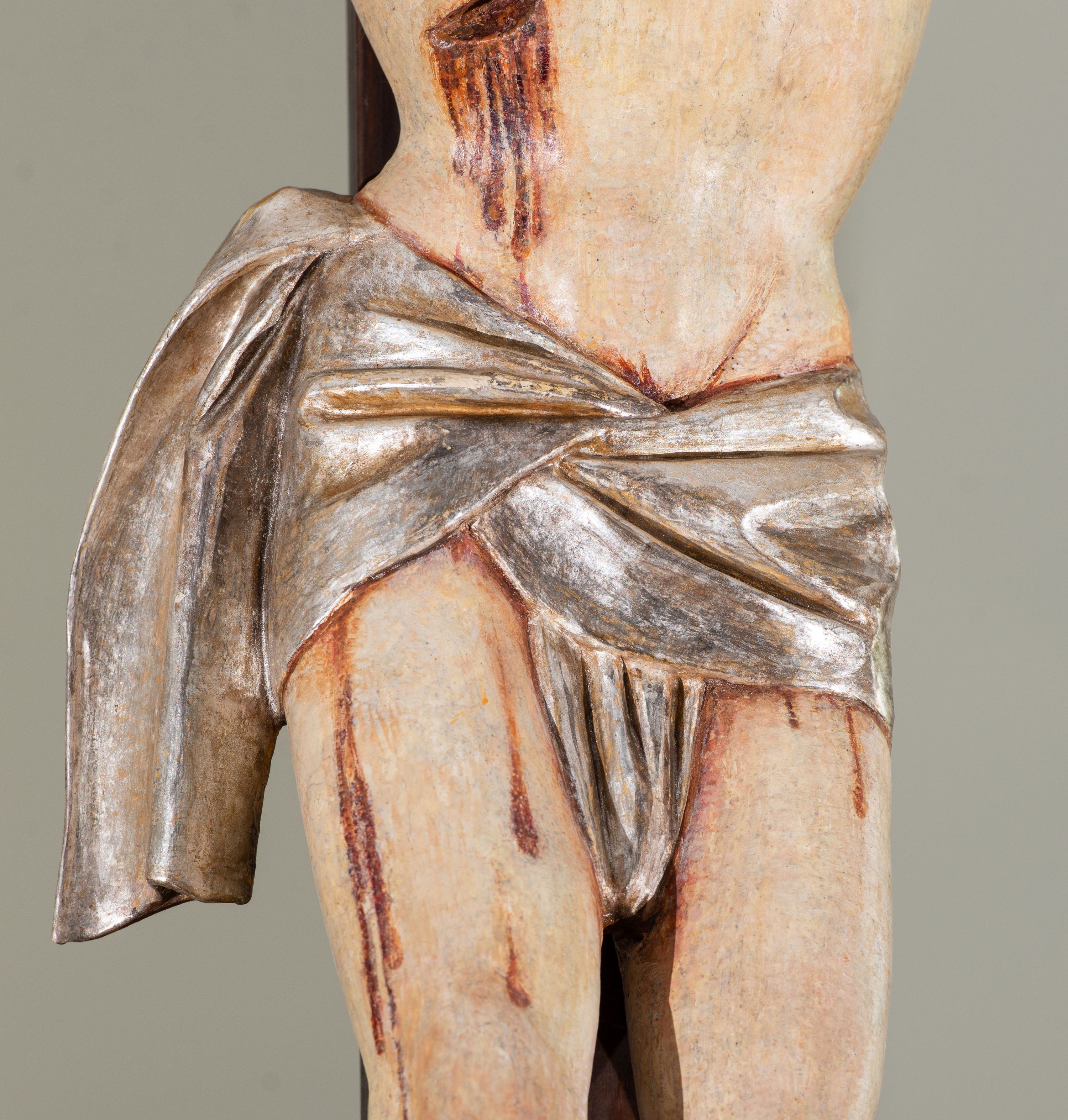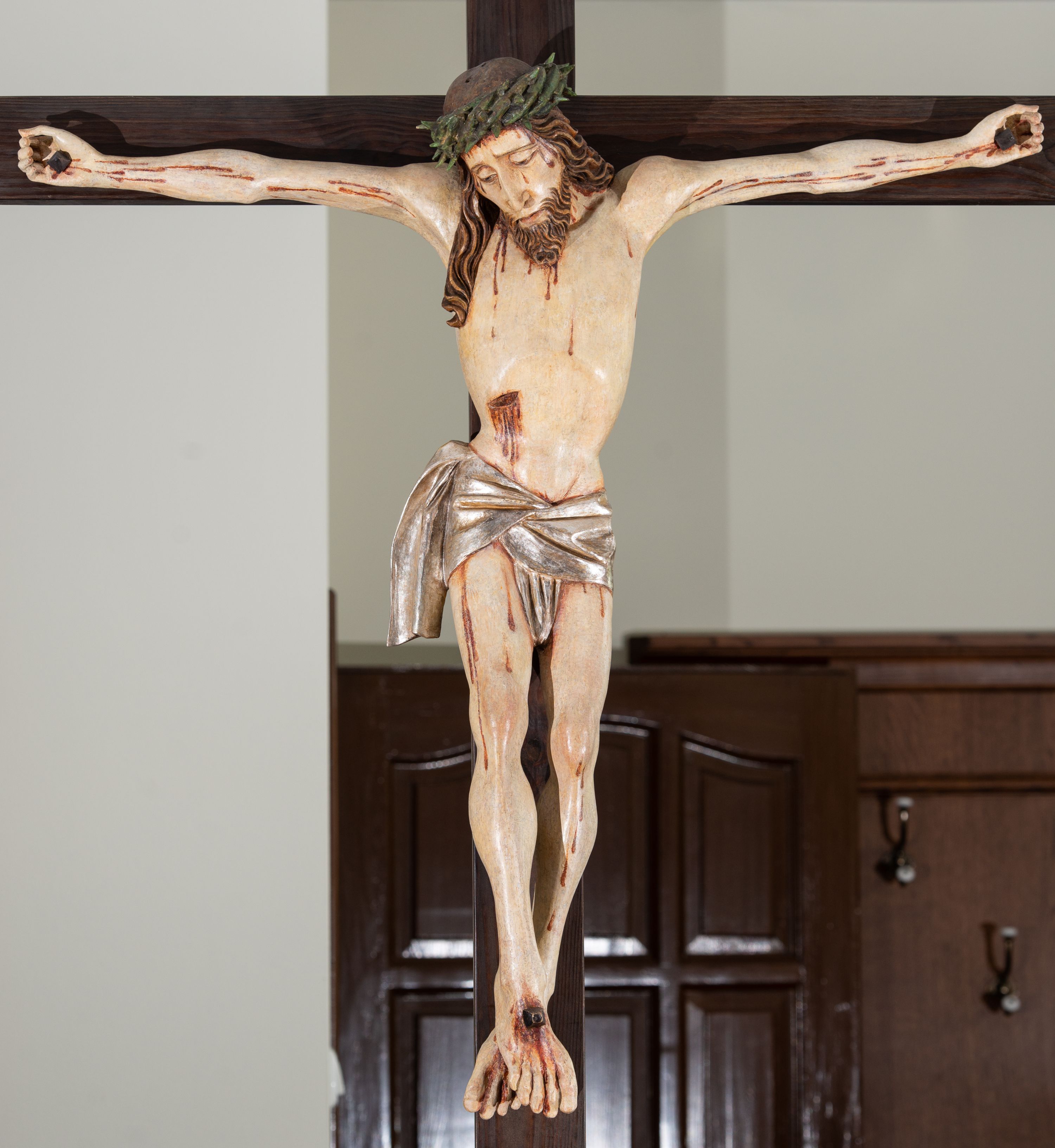 Na krucyfiksie przedstawiono ściętą z tyłu rzeźbioną figurę ukrzyżowanego Chrystusa. Jego ramiona ukazane zostały w lekkim zwisie, zaś układ ciała przyjmuje kształt litery „T”. Postać Ukrzyżowanego charakteryzuje się wydłużonymi proporcjami o wyraźnie zarysowanych mięśniach kończyn oraz zapadłą klatką piersiową. Głowa Jezusa jest przechylona na prawe ramię. Jego twarz jest pociągła o długim, prostym nosie, przymkniętych oczach i ustach wygiętych z kącikami skierowanymi do dołu. Okala ją brązowy zarost o szpicowatym zakończeniu. Włosy Zbawiciela są długie, kształtowane w falujące pukle, z pasmem opadającym na prawe ramię. Na głowie Jezus ma koronę cierniową, spod której spływają na twarz strugi krwi. Krew spływa także wzdłuż ramion, nóg i stóp. Na prawym boku zaznaczono broczącą ranę po włóczni. Ręce i nogi przytwierdzone są do krzyża za pomocą trzech gwoździ w kształcie czworobocznego graniastosłupa ściętego. Biodra Chrystusa przepasane zostały srebrzonym perizonium, przewiązanym na prawym biodrze ze zwisającym festonem wzdłuż prawego uda. Jest ono drapowane w szerokie fałdy wzdłuż przewiązania i na festonie. Ponad głową Zbawiciela widnieje późniejszy titulus z napisem „INRI”. Postać Chrystusa jest polichromowana, a perizonium srebrzone z widocznymi laserunkami.