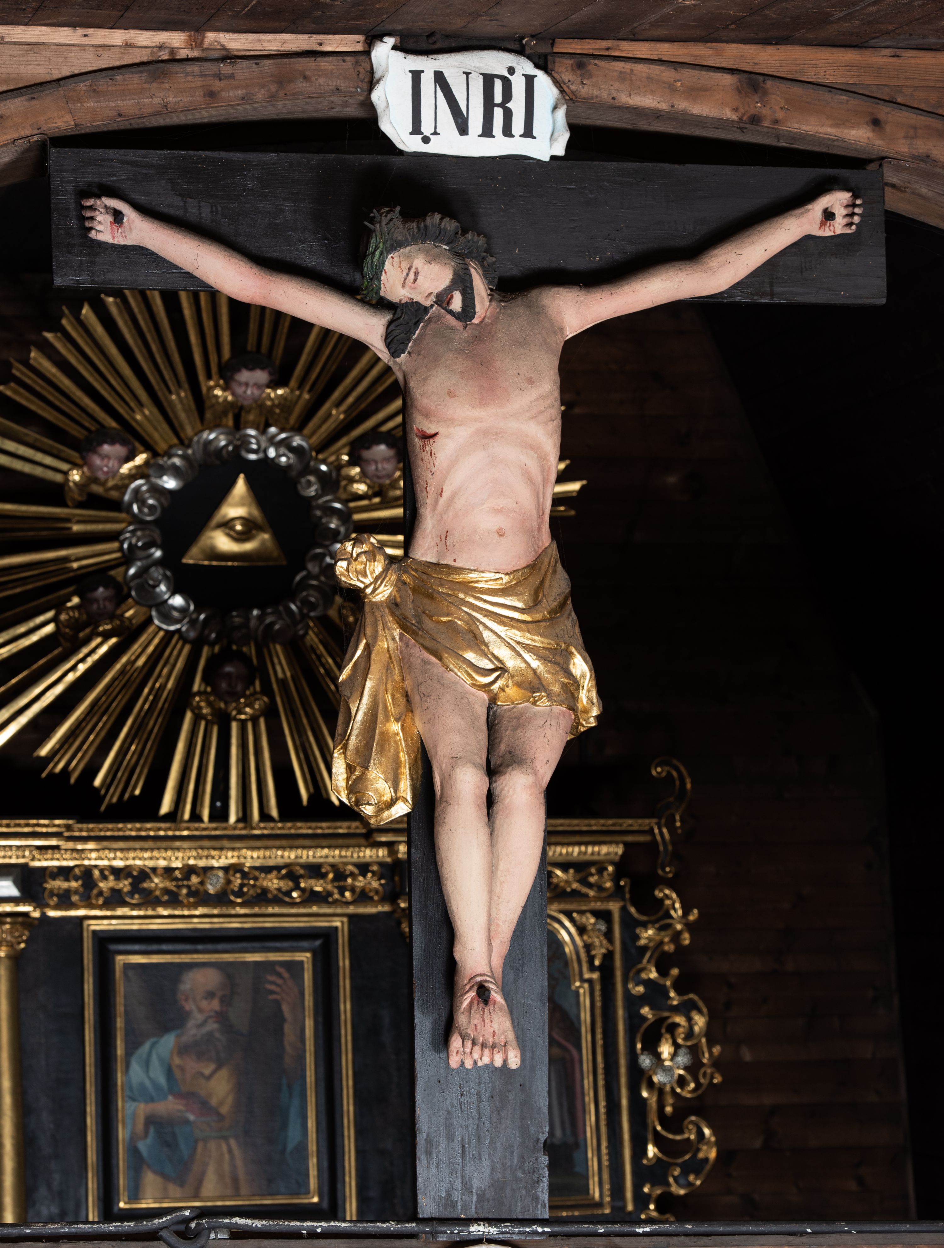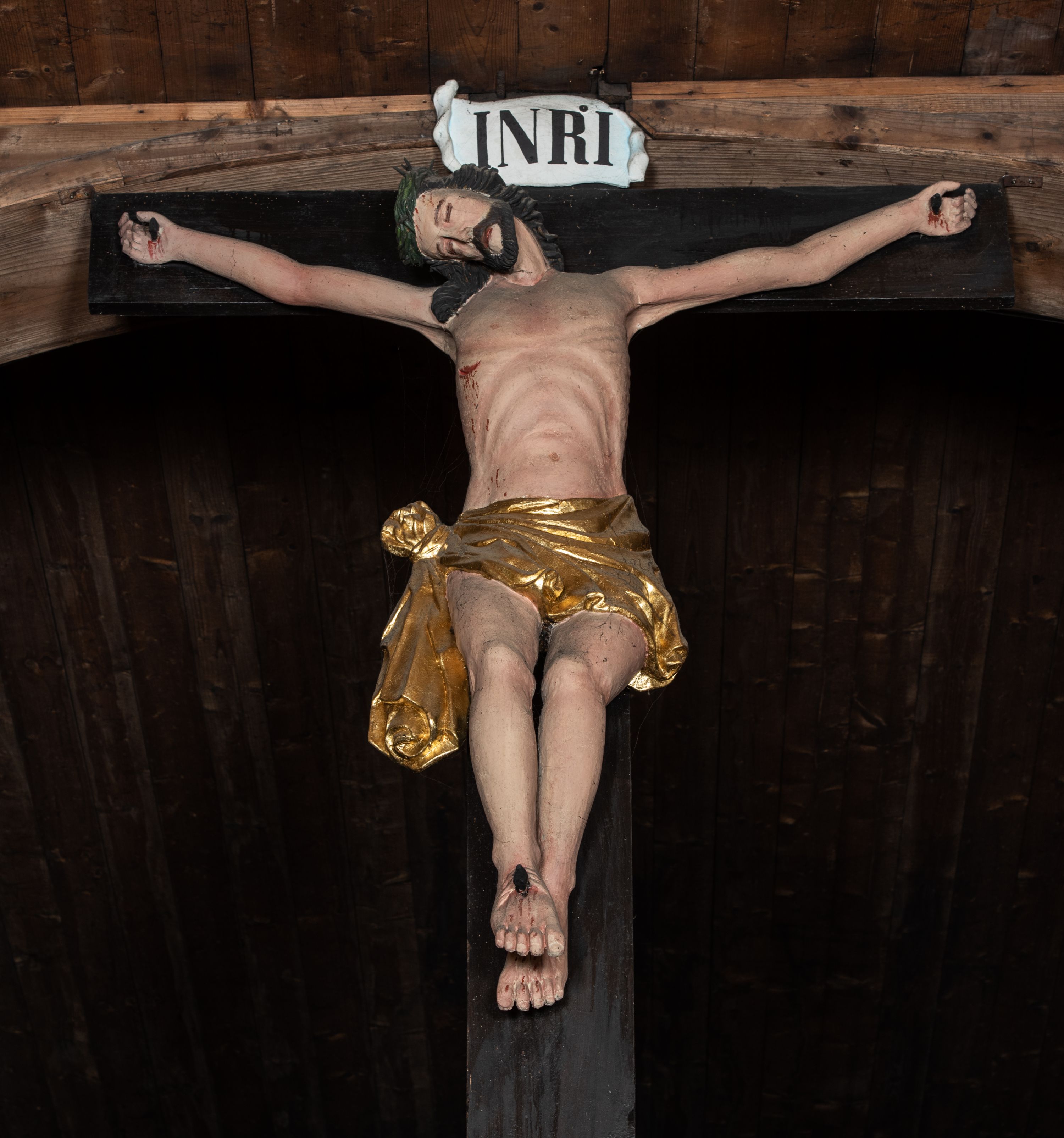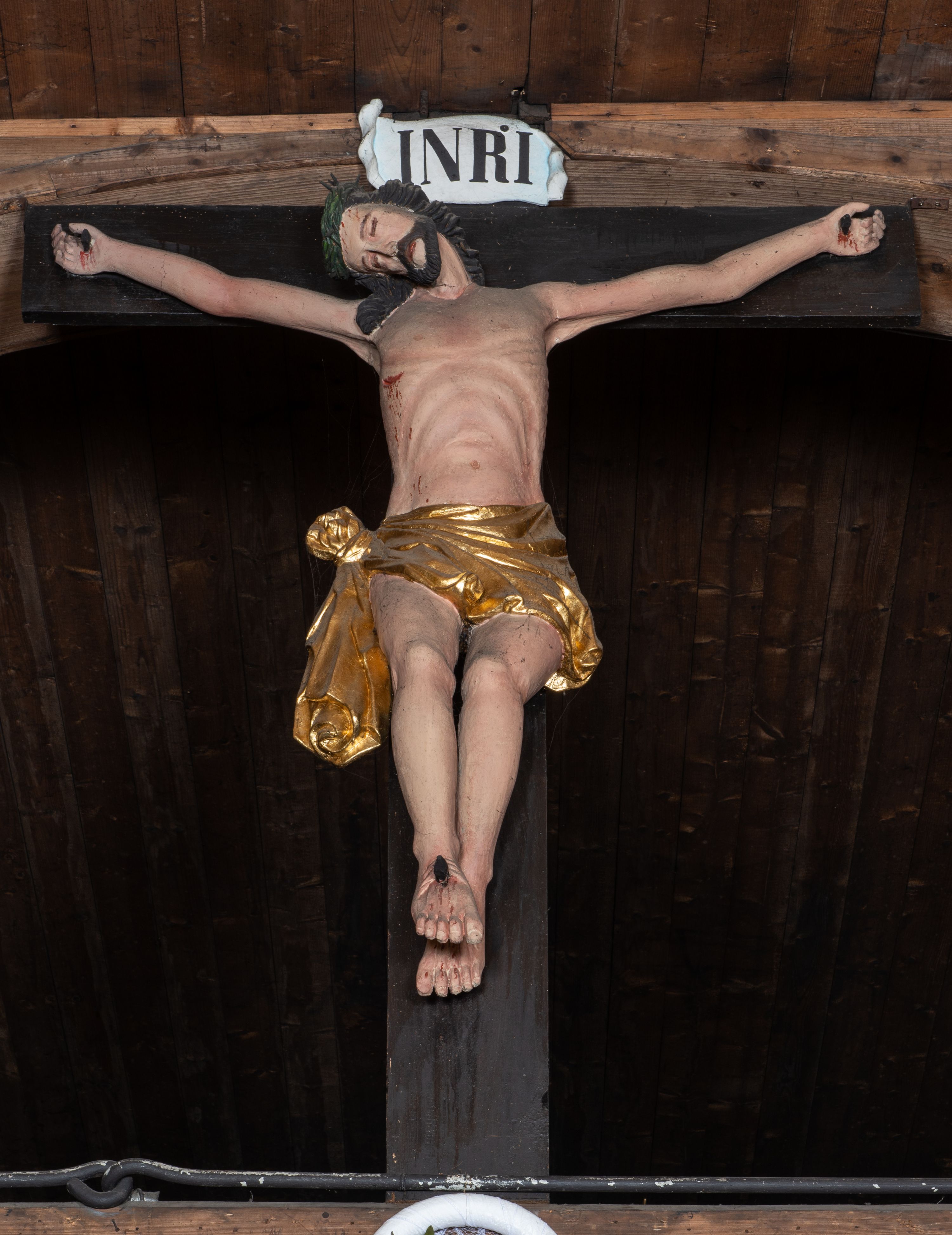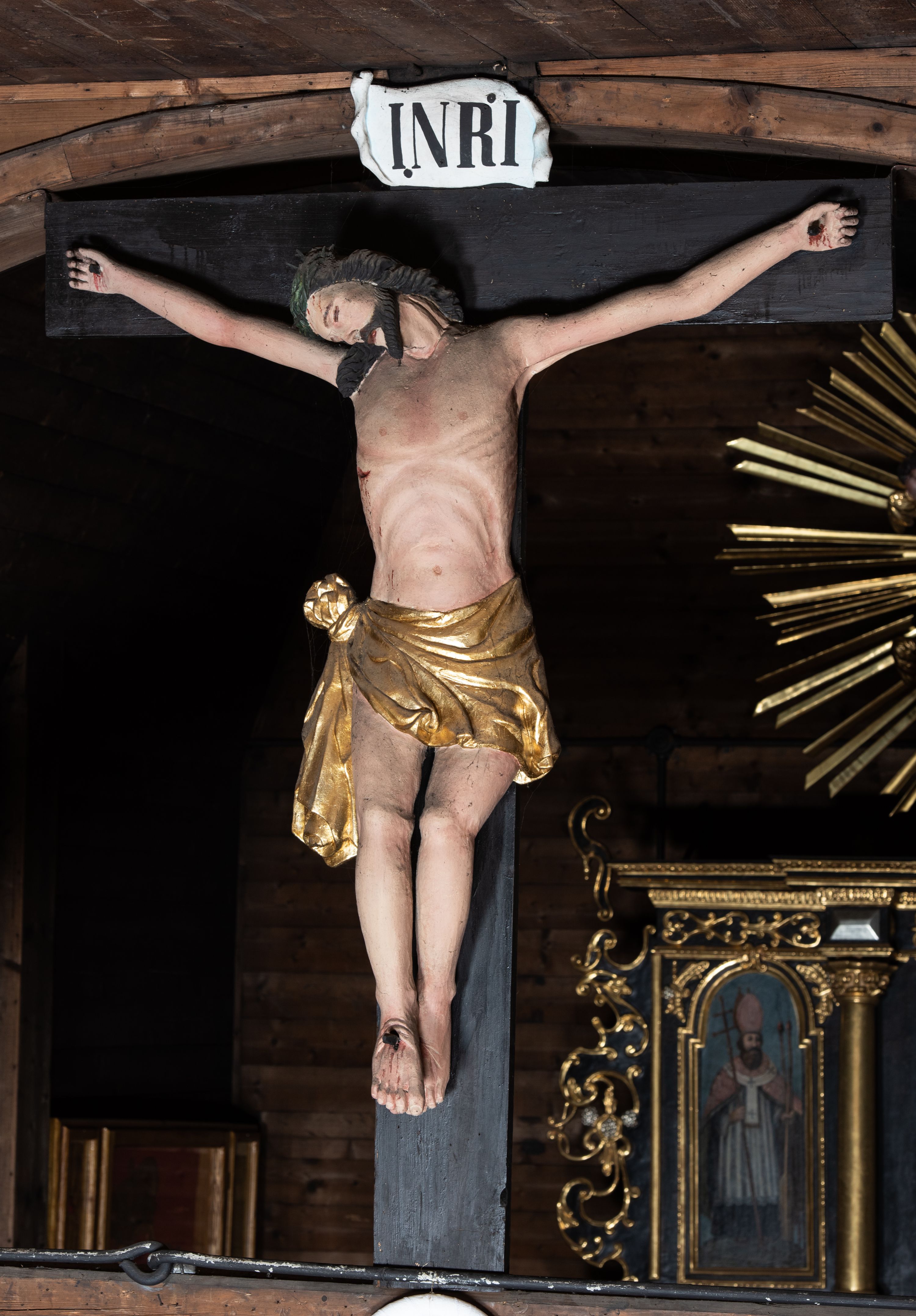Nazwa krucyfiks pochodzi od łacińskiego słowa „crucifixus” i oznacza „przybity do krzyża”. Przedstawienie Ukrzyżowania zredukowane wyłącznie do postaci wiszącego na krzyżu martwego Chrystusa ma uzmysłowić oglądającym jego osamotnienie w czasie męki. Chrystus został ukazany w typie Cristo morte – tzn. jako umarły z zamkniętymi oczami i rozchylonymi ustami. Jego postać pozbawiona jest ekspresji charakterystycznej dla XVIII wieku – sylwetka jest wyraźnie statyczna. Silnie skręcone w loki włosy zawinięte z tyłu głowy niosą echo gotyku. Nieudolnie oddane dłonie i stopy oraz anatomia klatki piersiowej przywodzą na myśl warsztat rzeźbiarza prowincjonalnego.