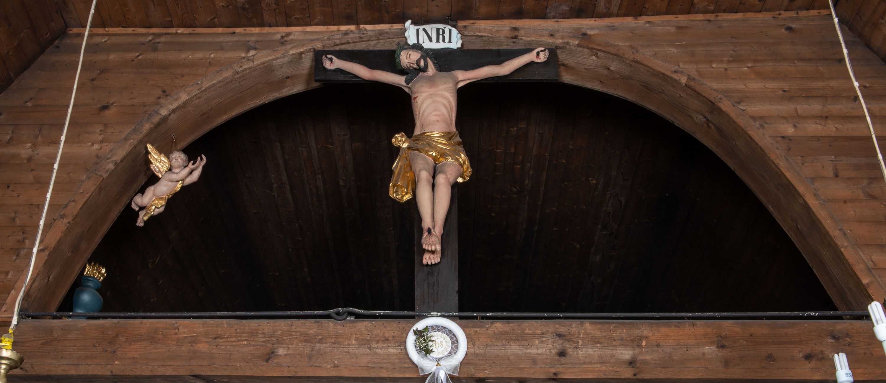 Krucyfiks z rzeźbą Chrystusa w typie Christo morte. Ciało zawieszone na niemal wyprostowanych ramionach; głowa silnie przechylona na prawe ramię; nogi delikatnie ugięte w kolanach, stopy przebite jednym gwoździem w układzie prawa na lewą. Twarz podłużna z zamkniętymi oczami i długim nosem, okolona krótkim zarostem. Na głowie zielona korona cierniowa. Włosy długie, czarne, opadające na prawe ramię oraz na plecy, silnie zawinięte do tyłu w drobne pukle. Klatka piersiowa szeroka z delikatnie, łukowato zaznaczoną linią żeber i mostka. Perizonium przewiązane na prawym boku w supeł z prawym końcem zwisającym wzdłuż prawego uda. Nad głową Chrystusa znajduje się biały titulus z napisem „INRI” w polu. Polichromia naturalistyczna w odsłoniętych partiach ciała z zaznaczonymi śladami męki, perizonium złocone. Krzyż o szerokich ramionach, prosty, malowany na czarno.