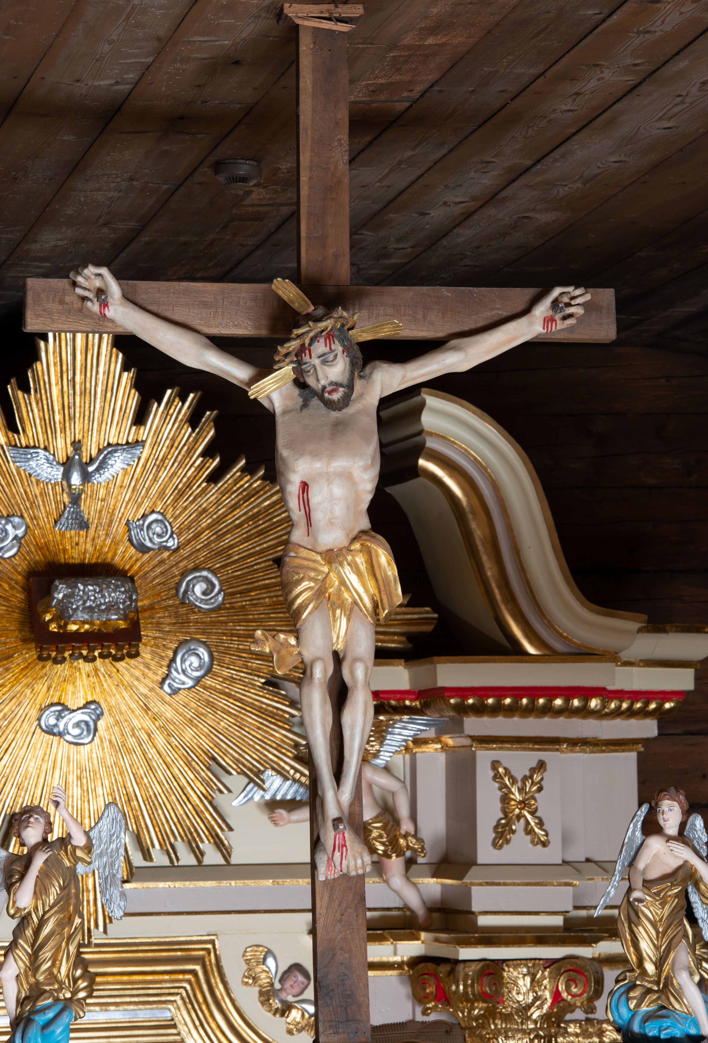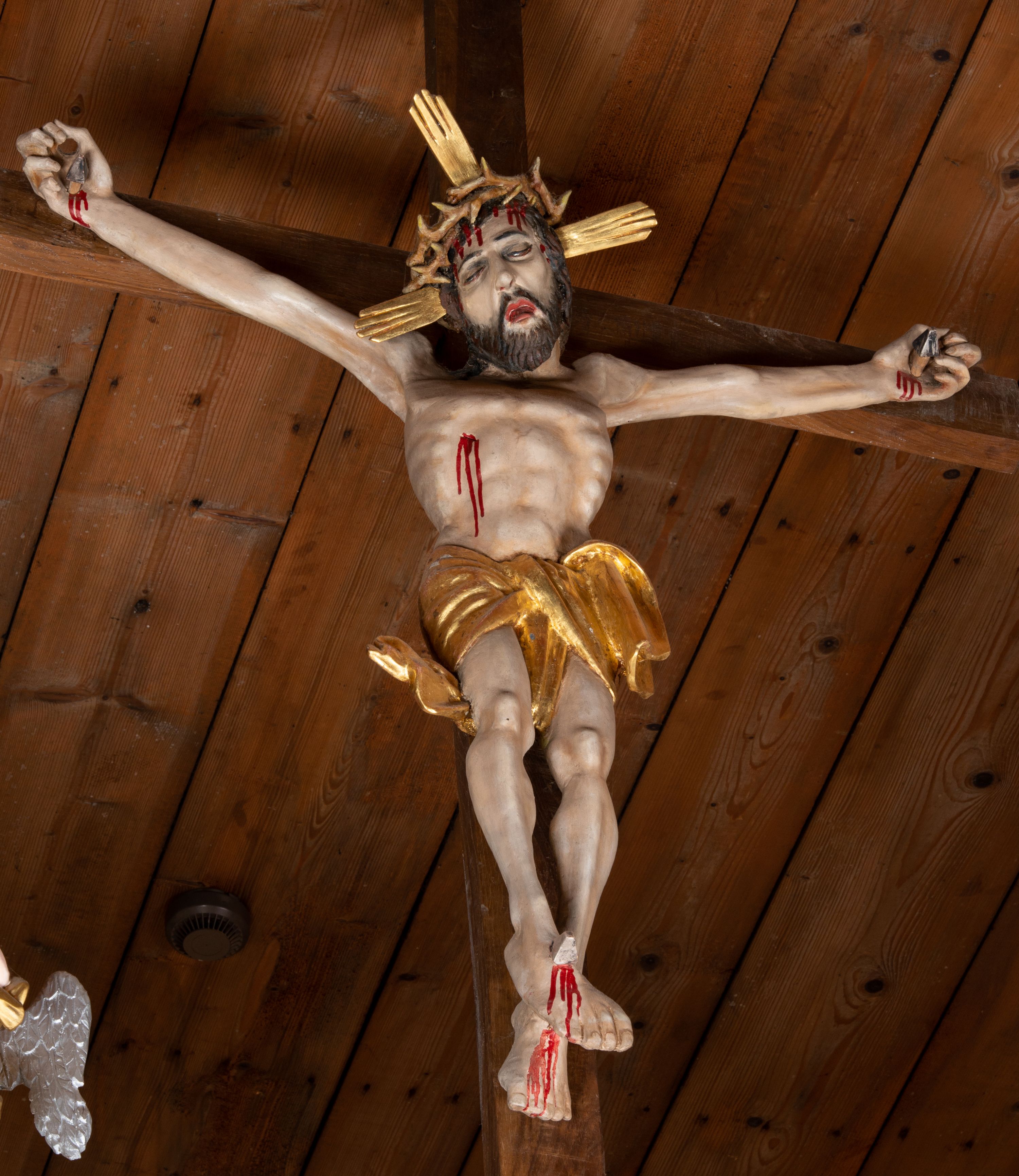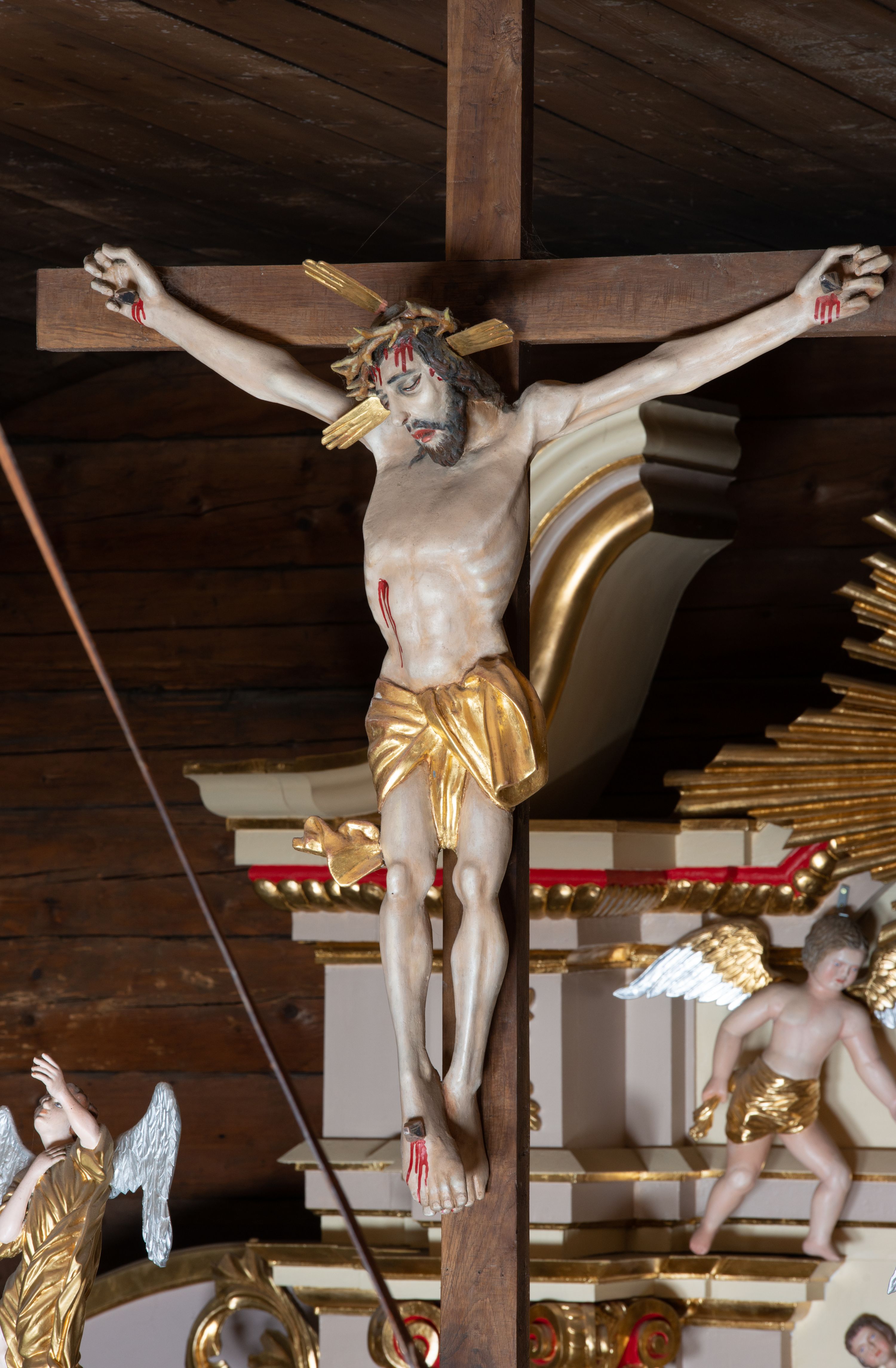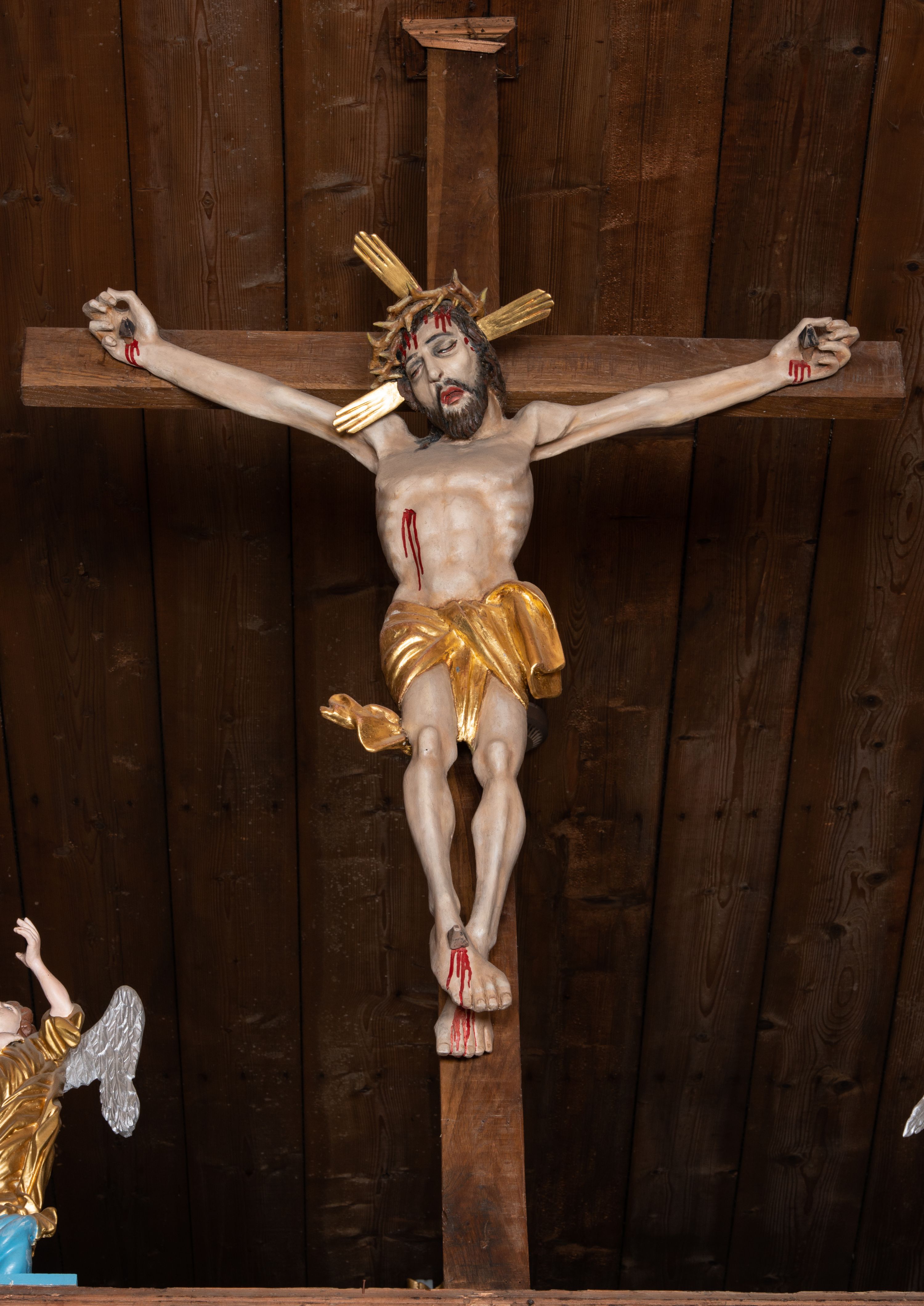Pełnoplastyczna figura Chrystusa przybita do krzyża trzema gwoździami. Postać ukazana w łagodnym zwisie, ramiona ułożone w kształt litery „Y”, dłonie o lekko zaciśniętych palcach. Głowa, przechylona na prawą stronę, nogi skrzyżowane z prawą stopą założoną na lewą. Sylwetka ciała mocno wychudzona, z wydatną, wysuniętą do przodu klatką piersiową i wciętą talią. Twarz pociągła o wyrazistych rysach, okolona krótką brodą. Oczy o opadłych kącikach, usta rozchylone. Wokół bioder krótkie perizonium z fałdą przechodzącą między udami i zawiniętą z tyłu prawej nogi. Na głowie korona cierniowa, a wokół nimb krzyżowy. Karnacja ciała pokryta polichromią w naturalnym jasnokremowym odcieniu z zaznaczonymi śladami męki na dłoniach, stopach, prawym boku i czole. Perizonium, promienie w nimbie i korona cierniowa złote.